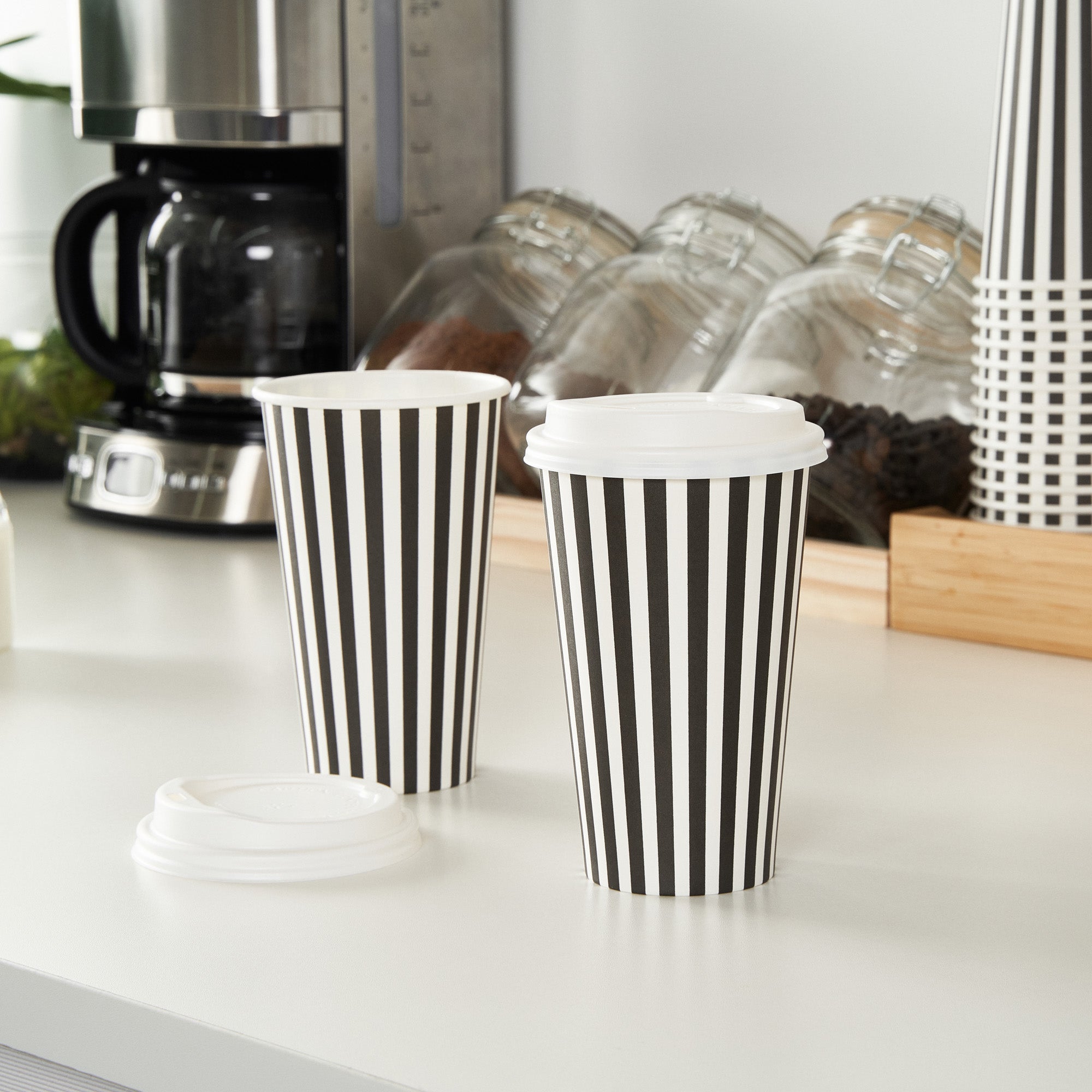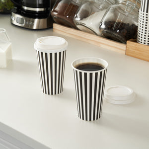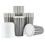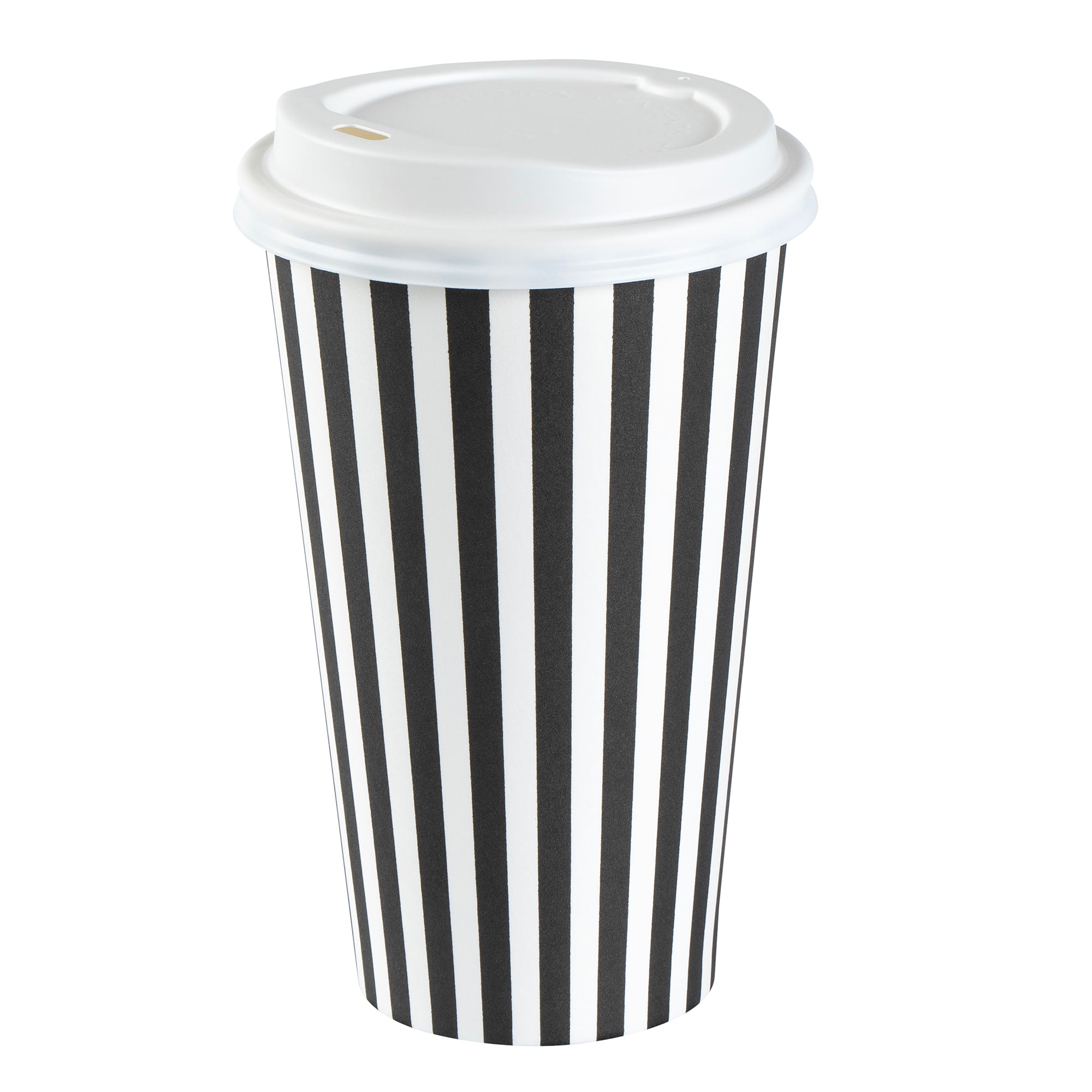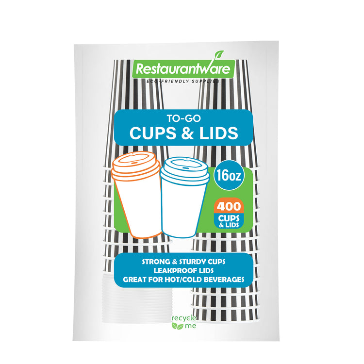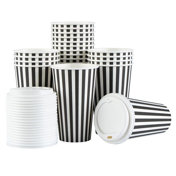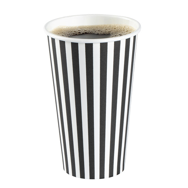 Start your day with our Restpresso 16-ounce Black and White Stripe Paper Single Wall Coffee Cups. These paper coffee cups boast a chic black and white striped design that adds a touch of sophistication to your morning routine or any coffee break. The greaseproof PE liner inside these disposable hot cups keeps your beverage intact and ensures zero leakage, maintaining the quality of your drink. With a leakproof white lid, these cups for coffee let you take your coffee on the go without any mess. Enjoy the convenience of these single wall coffee cups, designed to hold both hot and cold beverages, making them perfect for any season or drink preference. Stackable and compact, these single-use coffee cups save space in your kitchen or cafe while offering easy storage solutions. With a rolled rim and a leak-resistant seam, these beverage cups ensure a smooth drinking experience with no unwanted drips or spills. These disposable paper coffee cups offer a generous capacity of 16 ounces, perfect for those who want a large serving of their favorite brew. Combine these exquisite coffee cups with our range of sleeves, ensuring a comfortable grip while enjoying your hot beverage. Measuring 3.5 inches in diameter by 5.75 inches in height, these recyclable hot tea cups are compact yet spacious enough to hold your drink comfortably. Sold in a 20 count box. Sleeves are available and sold separately.