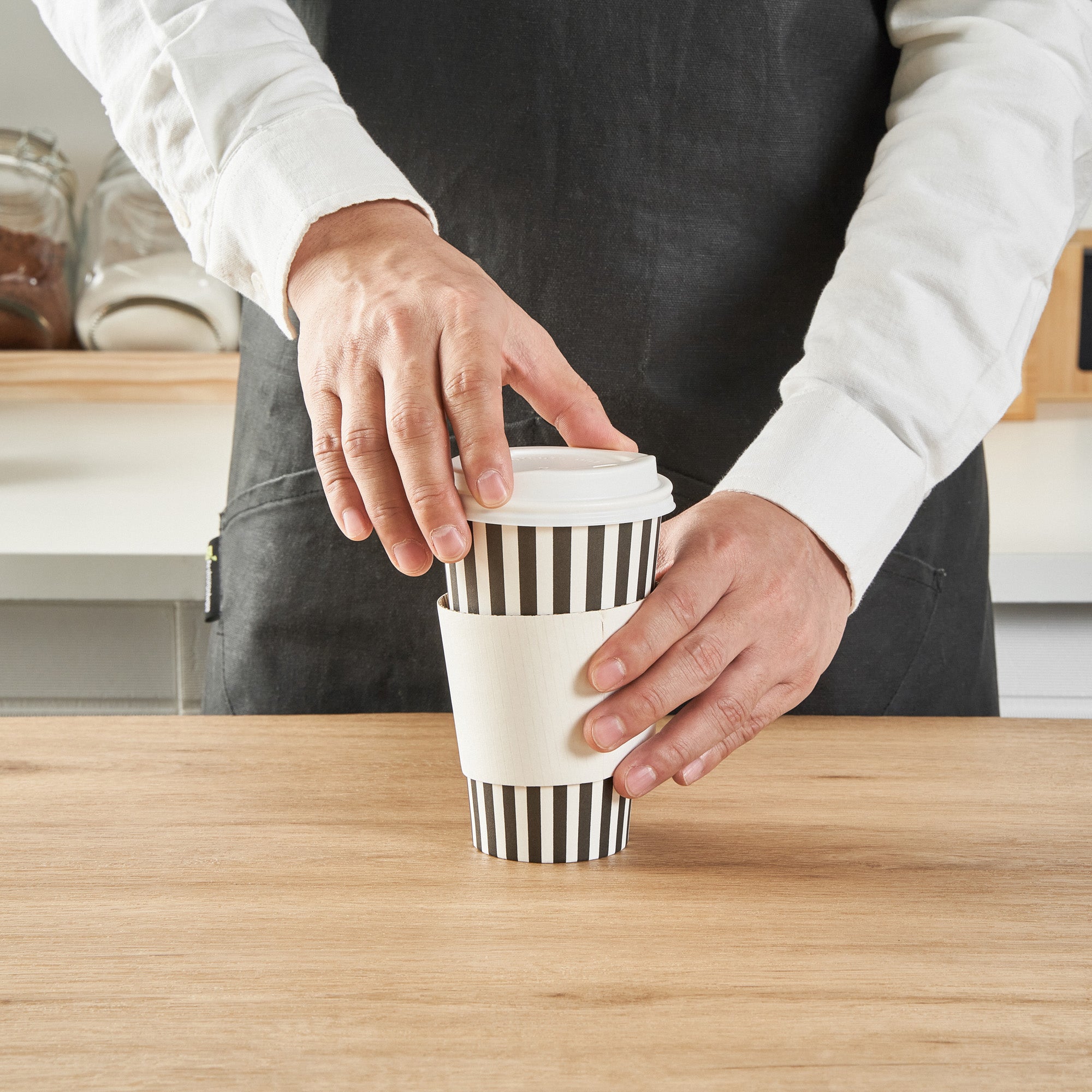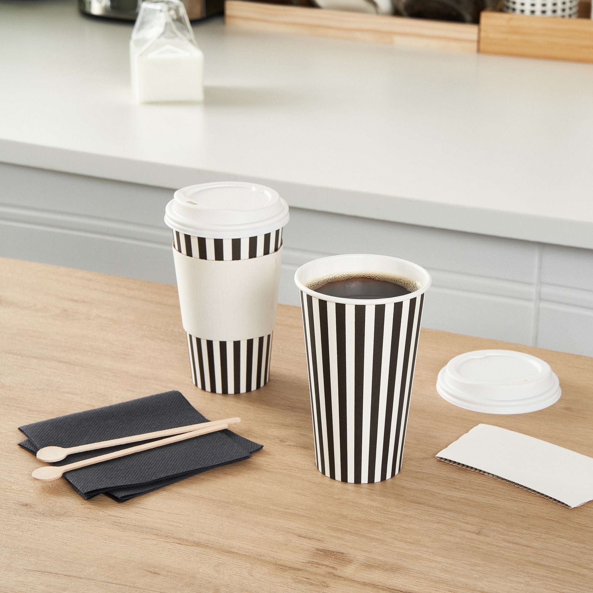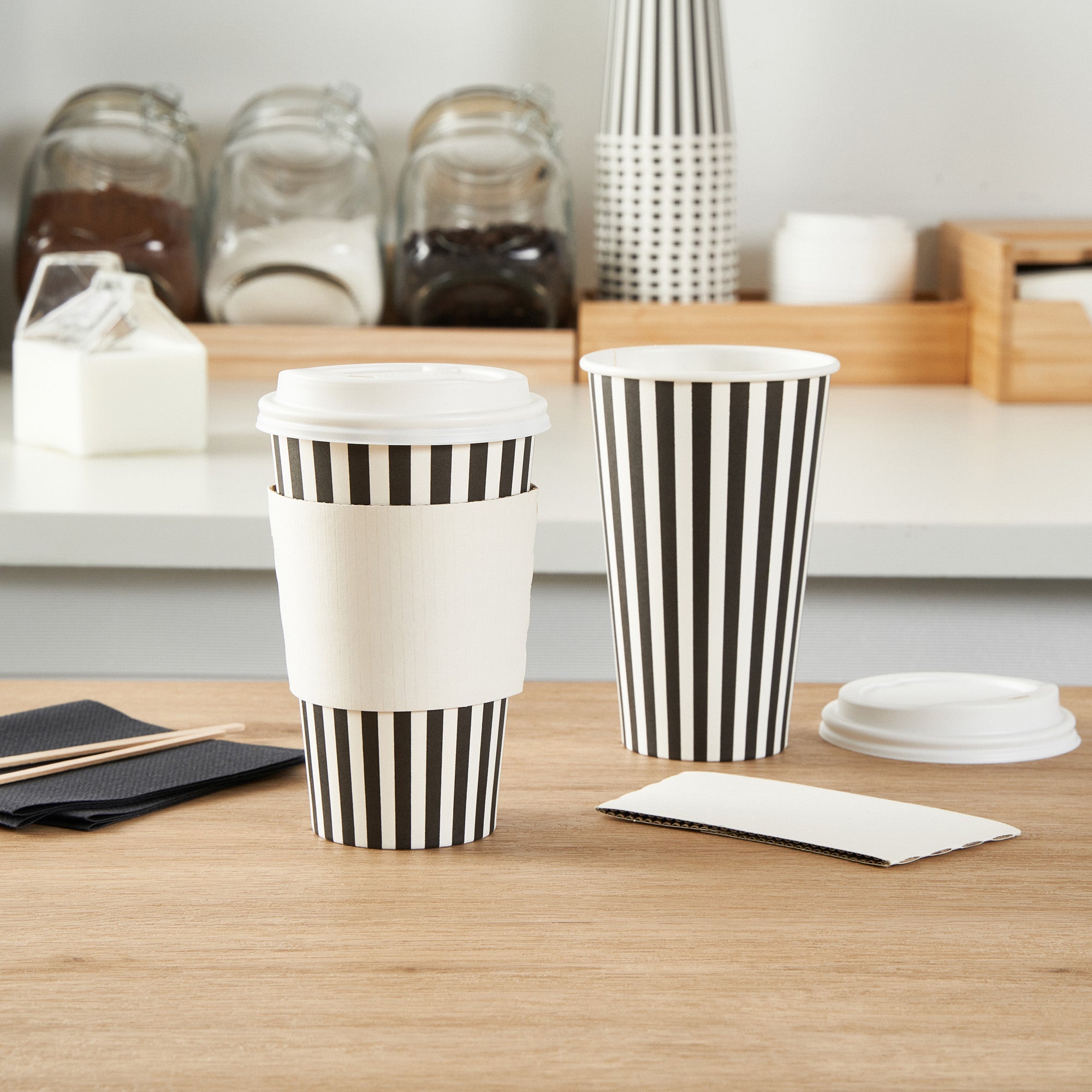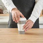 Start your day with our Restpresso 16-ounce Black and White Stripe Paper Single Wall Coffee Cups. These paper coffee cups boast a chic black and white striped design that adds a touch of sophistication to your morning routine or any coffee break. The greaseproof PE liner inside these disposable hot cups keeps your beverage intact and ensures zero leakage, maintaining the quality of your drink. With a leakproof white lid, these cups for coffee let you take your coffee on the go without any mess. Enjoy the convenience of these single wall coffee cups, designed to hold both hot and cold beverages, making them perfect for any season or drink preference. Stackable and compact, these single-use coffee cups save space in your kitchen or cafe while offering easy storage solutions. With a rolled rim and a leak-resistant seam, these beverage cups ensure a smooth drinking experience with no unwanted drips or spills. These disposable paper coffee cups offer a generous capacity of 16 ounces, perfect for those who want a large serving of their favorite brew. Combine these exquisite coffee cups with our range of sleeves, ensuring a comfortable grip while enjoying your hot beverage. Measuring 3.5 inches in diameter by 5.75 inches in height, these recyclable hot tea cups are compact yet spacious enough to hold your drink comfortably. Sold in a 20 count box. Sleeves are available and sold separately.
