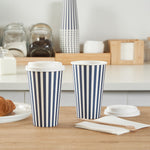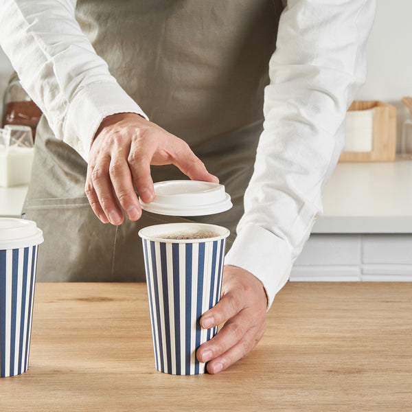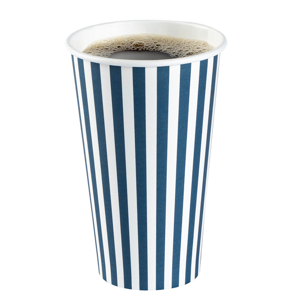Serving your delicious brews is a stylish affair with our Restpresso 16-ounce Blue and White Stripe Paper Single Wall Coffee Cups. These paper coffee cups, adorned with a chic blue and white stripe design, enhance the aesthetic appeal of your beverage offerings, making every sip a visual delight. Crafted with a greaseproof PE liner, these disposable hot cups minimize unsightly grease marks and leaks, ensuring a clean and enjoyable drinking experience for your customers. Designed with convenience in mind, these single-use coffee cups come with a white lid, providing a secure seal to reduce spills during transit. Featuring a rolled rim and a leak-resistant seam, these disposable coffee cups offer comfortable and drip-free sipping. Easy to stack and store, these stackable coffee cups save valuable counter space in your cafe, food truck, or concession stand. These drinking cups are suitable for hot and cold beverages. Pair up these coffee cups with our diverse sleeve options for a personalized, heat-resistant touch to your coffee time. Offering a generous capacity of 16 ounces, these disposable beverage cups are perfect for serving large coffee, tea, or hot cocoa orders. With dimensions of 3.5 inches in diameter by 5.75 inches in height, these recyclable hot tea cups fit perfectly in cup holders and hands alike, ensuring easy transport. Sold in a 20 count box. Sleeves are available and sold separately.