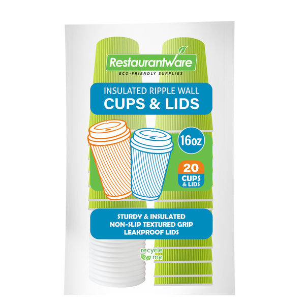 Avoid spills and keep drinks hot with our insulated coffee cups with lids. Restpresso 16 oz Eco Green Paper Ripple Wall Coffee Cups With Lids feature a ripple wall design that improves heat retention, ensuring beverages remain hot while providing a comfortable grip. The Eco Green Ripple Wall not only maintains the beverage's temperature but also reinforces your eco-friendly branding, as these recyclable coffee cups with lids support sustainable foodservice practices. Made from paper, these cups include matching white lids that create a tight-fitting seal to prevent leaks during transport, making them indispensable for coffee shops and mobile vendors. With dimensions of 3.6 inches by 3.6 inches by 6.2 inches, these versatile cups are cold and hot friendly, perfect for serving a variety of drinks. Elevate your beverage service with these disposable coffee cups with lids, ideal for any foodservice operation prioritizing convenience and sustainability. Sold in a 20 count box.