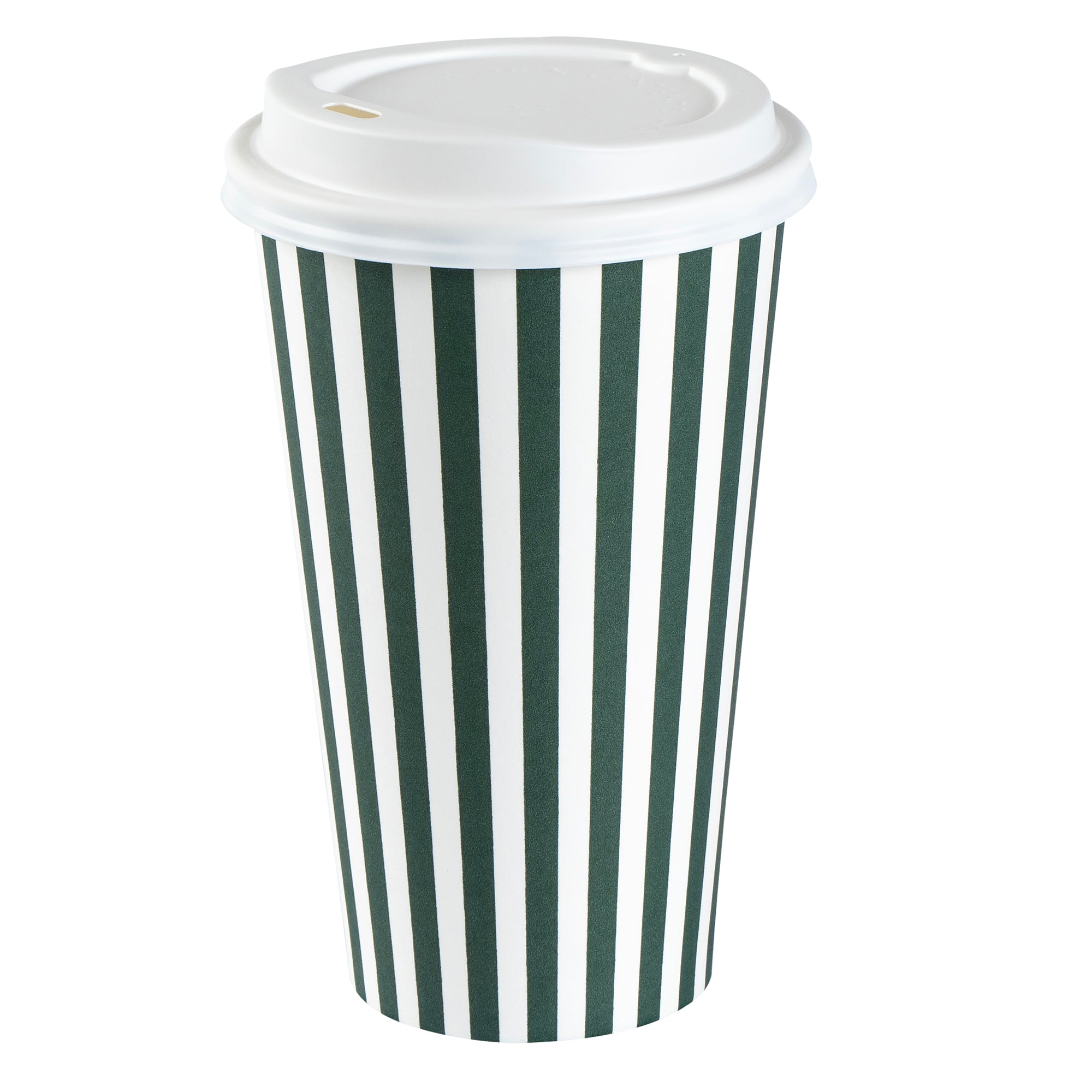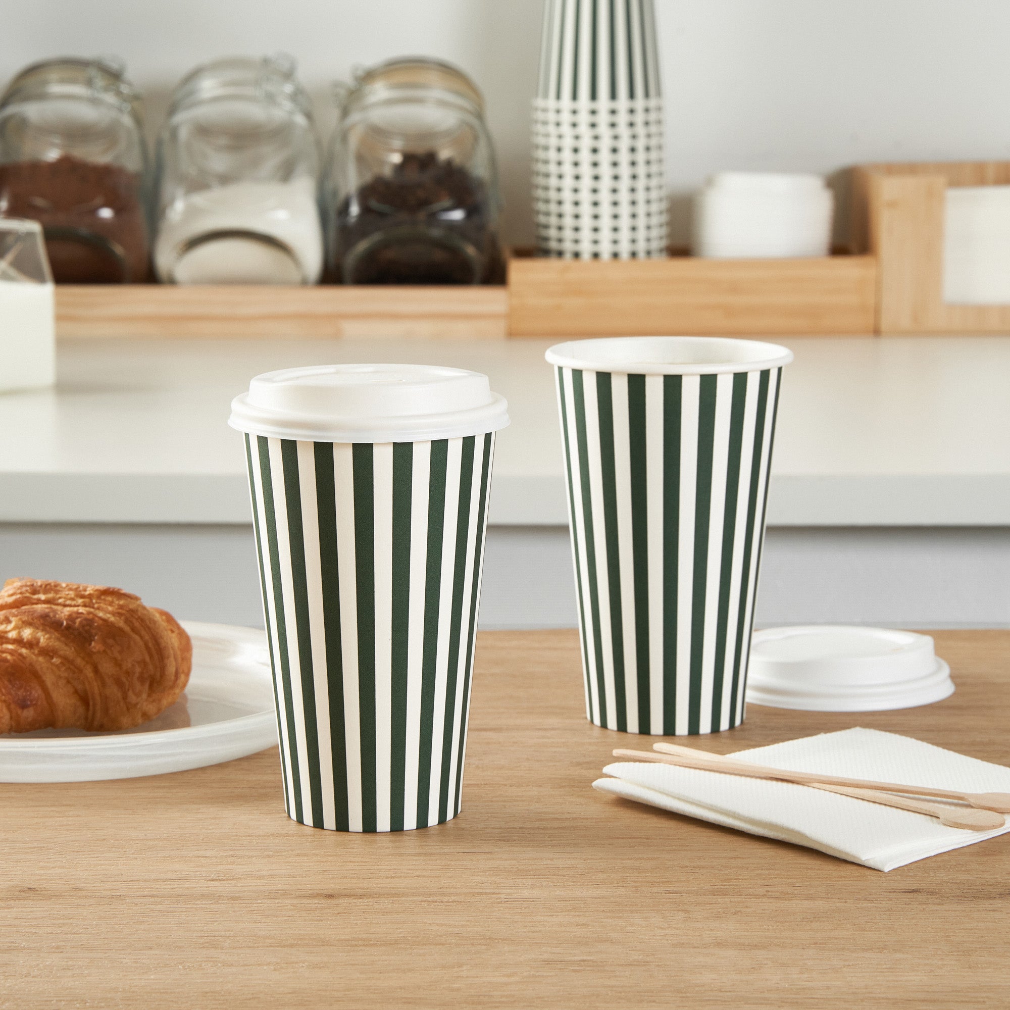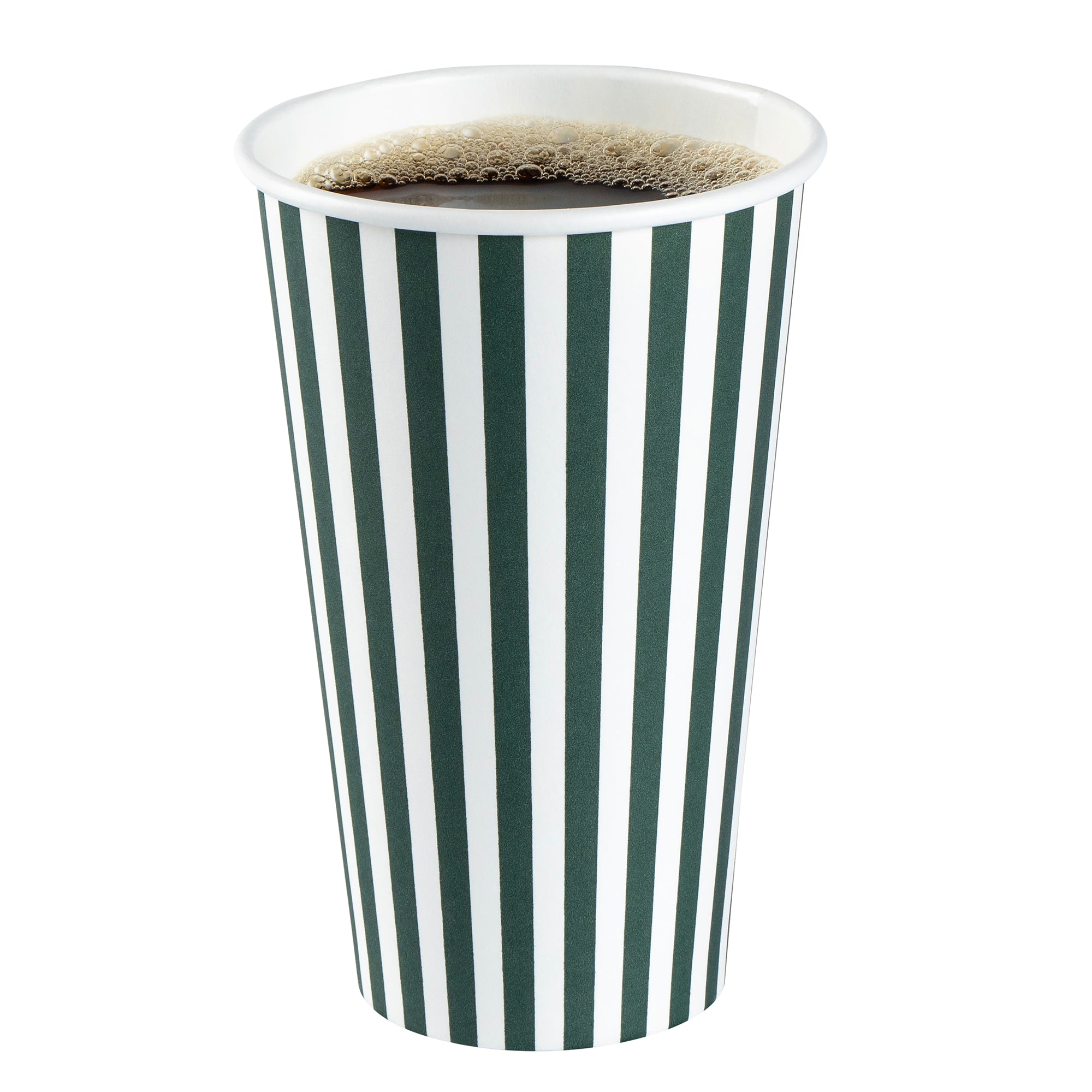 Elevate your beverage service with our Restpresso 16-ounce Forest Green and White Stripe Paper Single Wall Coffee Cups. These paper coffee cups are adorned with an eye-catching forest green and white stripe design, bringing a pop of color and style to your offerings. With their greaseproof feature and PE liner, these disposable hot cups reduce messes, making them perfect for on-the-go customers. Ideal for both hot and cold beverages, these single wall coffee cups offer versatility and convenience for your customers. These coffee cups forest green and white striped finish adds a unique touch to your presentation, ensuring your beverage service stands out. Space-saving and efficient, these stackable cups are a great choice for establishments with limited storage areas. The rolled rim of these single-use coffee cups ensures a snug fit with the included white lid, minimizing leaks and spills during transport. With a leak-resistant seam, these cups provide a reliable solution for your coffee service. These green and white coffee cups boast a capacity of 16 ounces, perfect for serving medium-sized beverages. Pair these elegant coffee cups with our diverse selection of sleeves for a sophisticated and burn-free coffee experience. Measuring 3.5 inches in diameter by 5.75 inches in height, these recyclable hot tea cups are a compact and practical choice for your establishment. Sold in a 20 count box. Sleeves are available and sold separately.