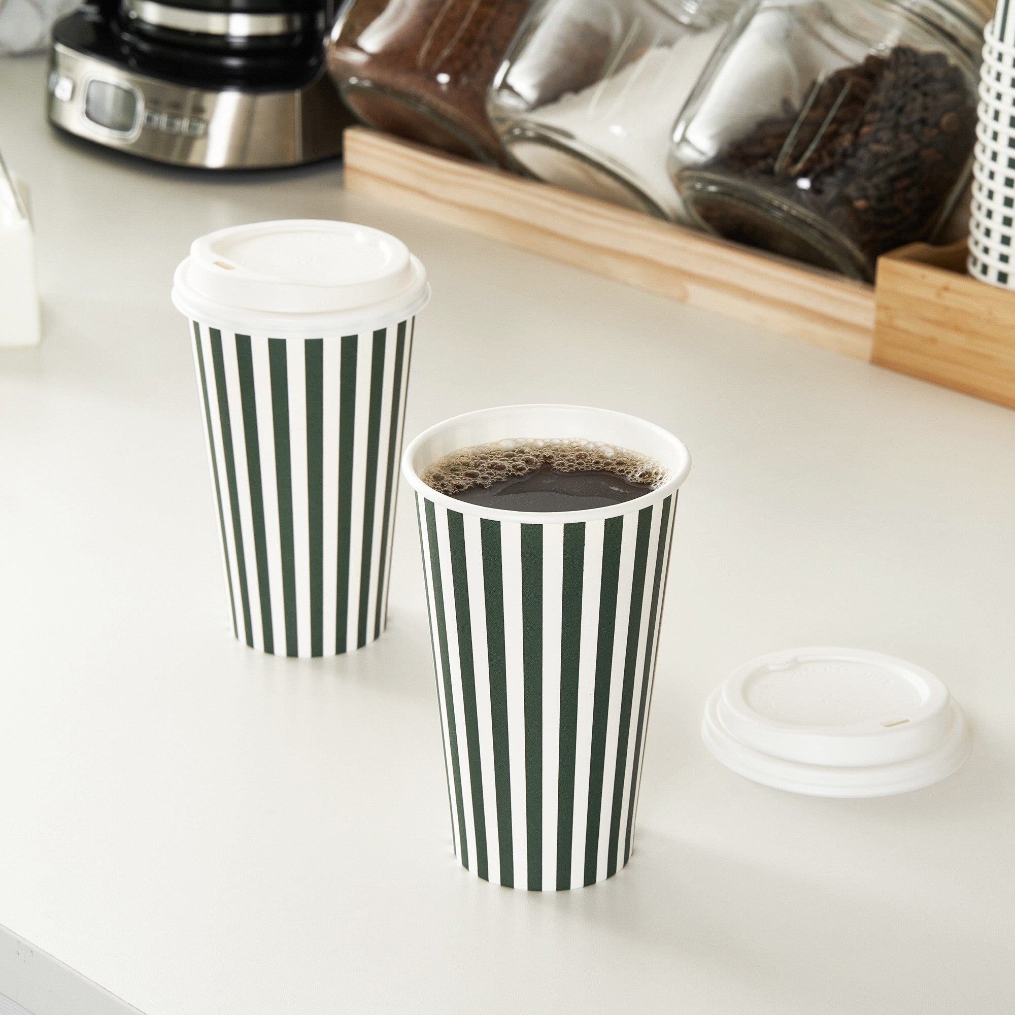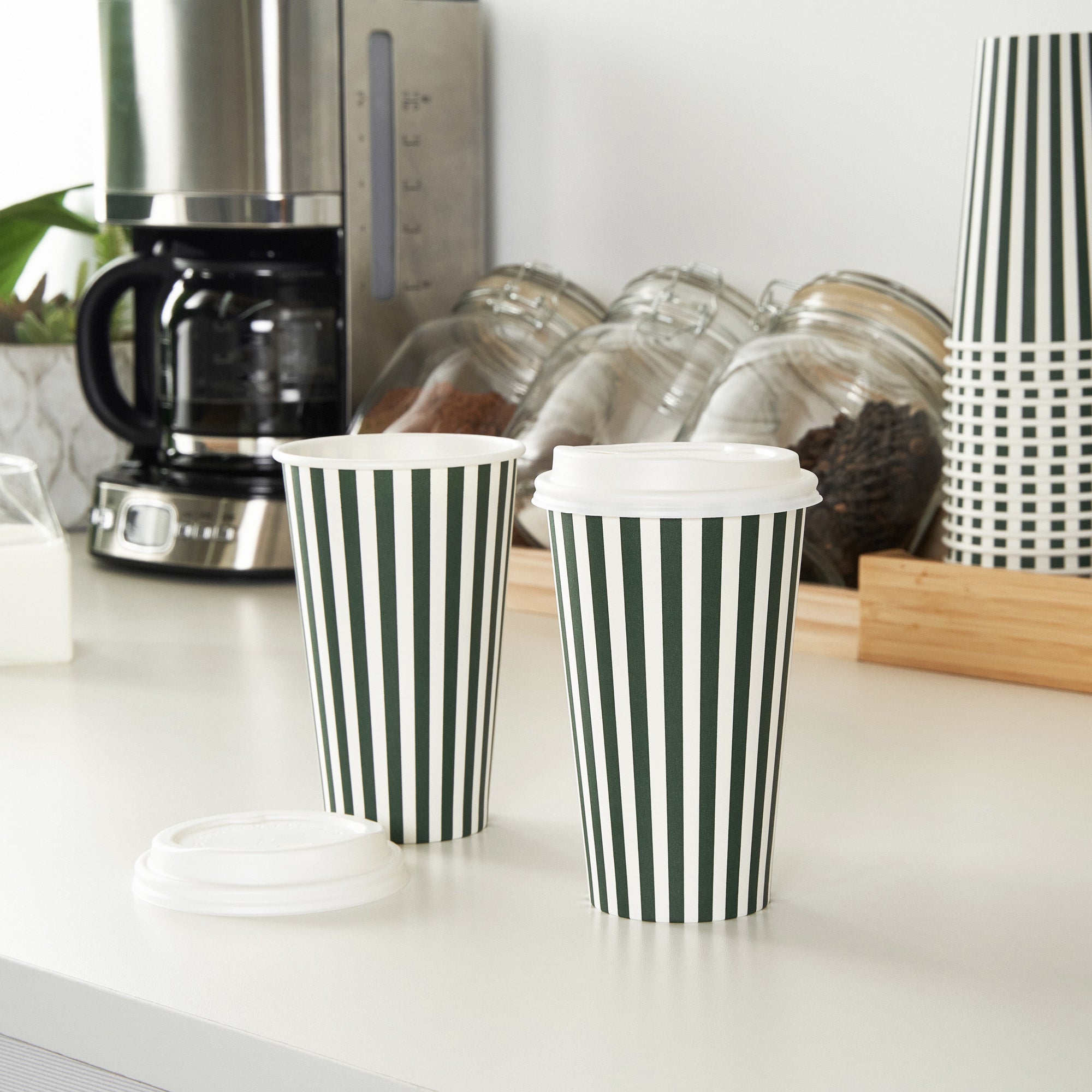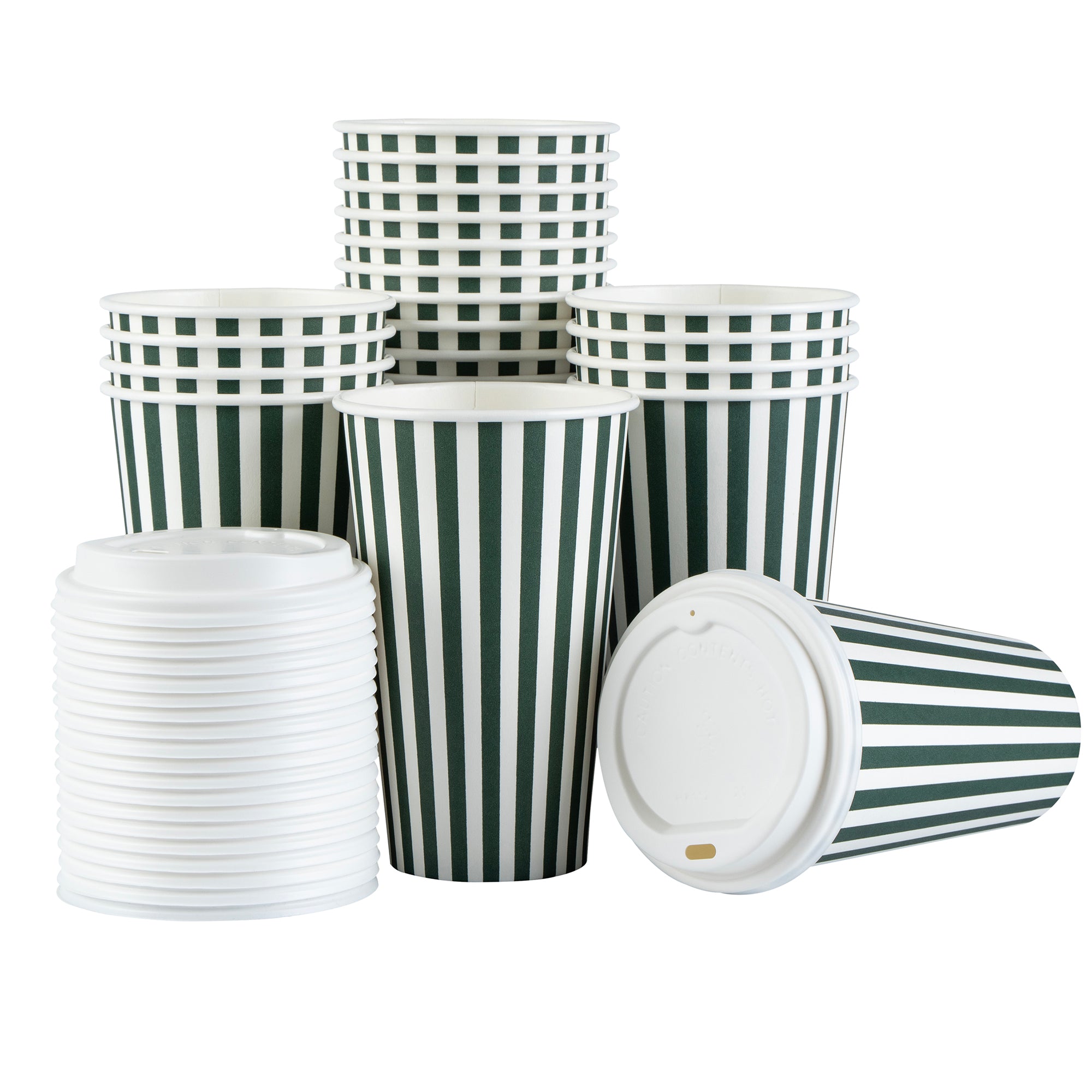 Elevate your beverage service with our Restpresso 16-ounce Forest Green and White Stripe Paper Single Wall Coffee Cups. These paper coffee cups are adorned with an eye-catching forest green and white stripe design, bringing a pop of color and style to your offerings. With their greaseproof feature and PE liner, these disposable hot cups reduce messes, making them perfect for on-the-go customers. Ideal for both hot and cold beverages, these single wall coffee cups offer versatility and convenience for your customers. These coffee cups forest green and white striped finish adds a unique touch to your presentation, ensuring your beverage service stands out. Space-saving and efficient, these stackable cups are a great choice for establishments with limited storage areas. The rolled rim of these single-use coffee cups ensures a snug fit with the included white lid, minimizing leaks and spills during transport. With a leak-resistant seam, these cups provide a reliable solution for your coffee service. These green and white coffee cups boast a capacity of 16 ounces, perfect for serving medium-sized beverages. Pair these elegant coffee cups with our diverse selection of sleeves for a sophisticated and burn-free coffee experience. Measuring 3.5 inches in diameter by 5.75 inches in height, these recyclable hot tea cups are a compact and practical choice for your establishment. Sold in a 20 count box. Sleeves are available and sold separately.