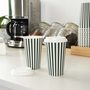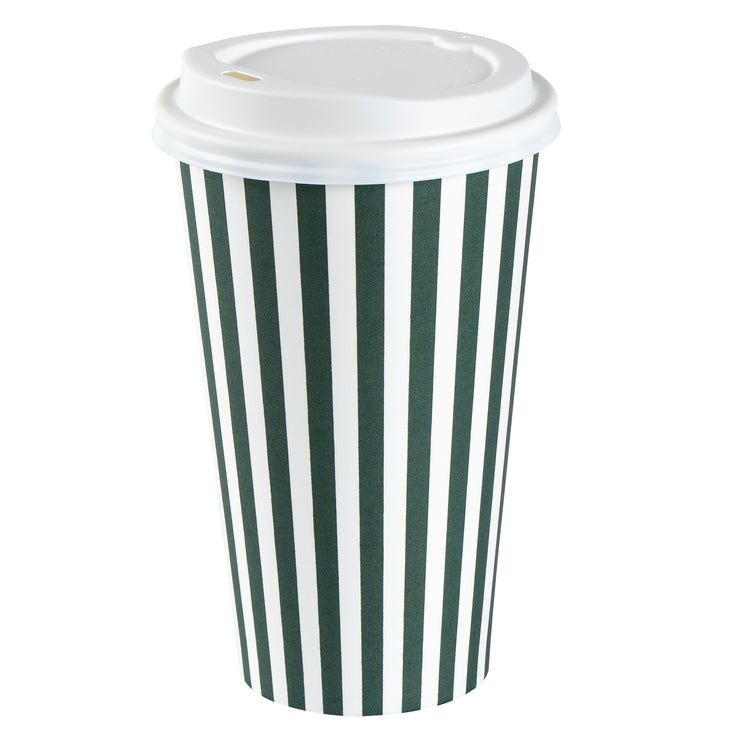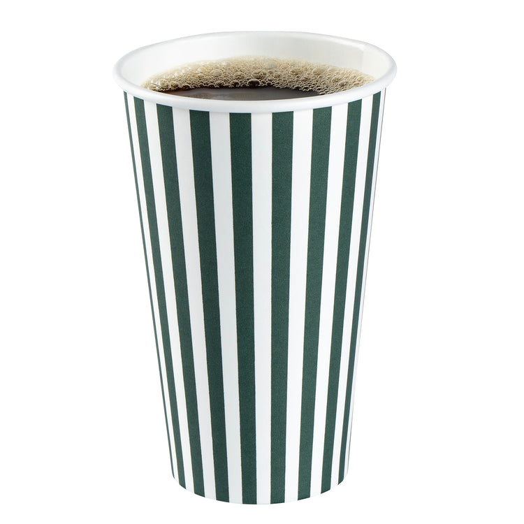 Elevate your beverage service with our Restpresso 16-ounce Forest Green and White Stripe Paper Single Wall Coffee Cups. These paper coffee cups are adorned with an eye-catching forest green and white stripe design, bringing a pop of color and style to your offerings. With their greaseproof feature and PE liner, these disposable hot cups reduce messes, making them perfect for on-the-go customers. Ideal for both hot and cold beverages, these single wall coffee cups offer versatility and convenience for your customers. These coffee cups forest green and white striped finish adds a unique touch to your presentation, ensuring your beverage service stands out. Space-saving and efficient, these stackable cups are a great choice for establishments with limited storage areas. The rolled rim of these single-use coffee cups ensures a snug fit with the included white lid, minimizing leaks and spills during transport. With a leak-resistant seam, these cups provide a reliable solution for your coffee service. These green and white coffee cups boast a capacity of 16 ounces, perfect for serving medium-sized beverages. Pair these elegant coffee cups with our diverse selection of sleeves for a sophisticated and burn-free coffee experience. Measuring 3.5 inches in diameter by 5.75 inches in height, these recyclable hot tea cups are a compact and practical choice for your establishment. Sold in a 400 count box. Sleeves are available and sold separately.