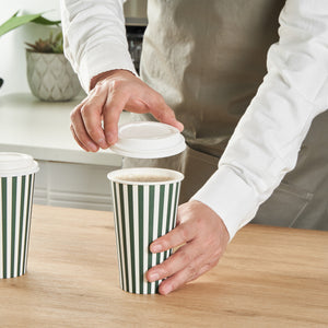 Elevate your beverage service with our Restpresso 16-ounce Forest Green and White Stripe Paper Single Wall Coffee Cups. These paper coffee cups are adorned with an eye-catching forest green and white stripe design, bringing a pop of color and style to your offerings. With their greaseproof feature and PE liner, these disposable hot cups reduce messes, making them perfect for on-the-go customers. Ideal for both hot and cold beverages, these single wall coffee cups offer versatility and convenience for your customers. These coffee cups forest green and white striped finish adds a unique touch to your presentation, ensuring your beverage service stands out. Space-saving and efficient, these stackable cups are a great choice for establishments with limited storage areas. The rolled rim of these single-use coffee cups ensures a snug fit with the included white lid, minimizing leaks and spills during transport. With a leak-resistant seam, these cups provide a reliable solution for your coffee service. These green and white coffee cups boast a capacity of 16 ounces, perfect for serving medium-sized beverages. Pair these elegant coffee cups with our diverse selection of sleeves for a sophisticated and burn-free coffee experience. Measuring 3.5 inches in diameter by 5.75 inches in height, these recyclable hot tea cups are a compact and practical choice for your establishment. Sold in a 400 count box. Sleeves are available and sold separately.
