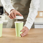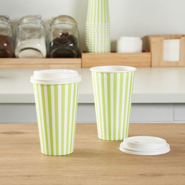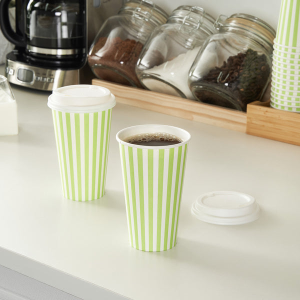 Enjoy your favorite hot or cold beverages with our Restpresso 16-ounce Green and White Stripe Paper Single Wall Coffee Cups. These paper coffee cups are designed with a greaseproof PE liner, ensuring your drink stays in the cup and not on your clothes. Featuring a single wall construction, these disposable hot cups efficiently hold all kinds of beverages. These coffee cups come with a white lid, providing a perfect fit to reduce spills and leaks during transport. With a unique green and white stripe finish, these single wall coffee cups add a touch of elegance to your beverage service. Designed with a rolled rim, these paper coffee cups provide a comfortable drinking experience. The leak-resistant seam of these disposable coffee cups reliably contains both hot and cold beverages. Couple these premium coffee cups with our variety of sleeves to elevate your coffee sipping experience. These disposable hot cups have a generous capacity of 16 ounces, perfect for serving large coffee orders. Measuring 3.5 inches in diameter by 5.75 inches in height, these recyclable hot tea cups are an excellent choice for on-the-go customers. Sold in a 20 count box. Sleeves are available and sold separately.