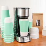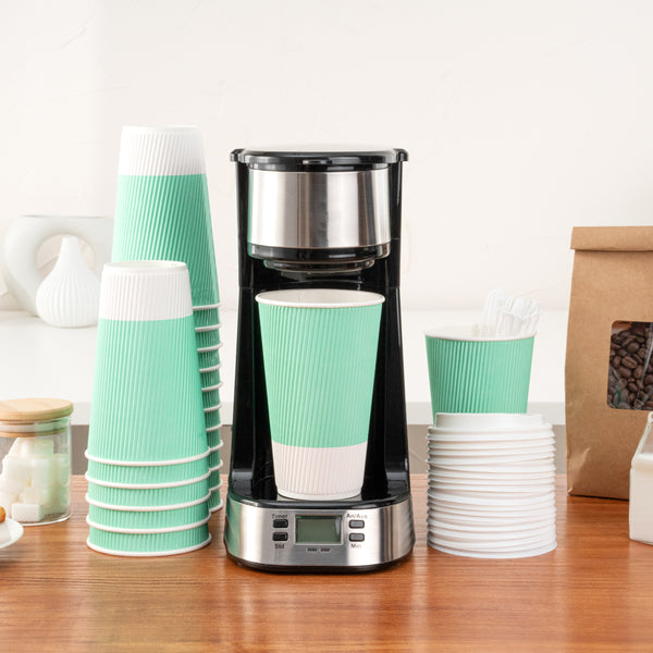 Maintain beverage temperature and enhance grip with ripple wall coffee cups. Restpresso 16 oz Paper Coffee Cups With Lids provide a ripple wall design that insulates drinks, ensuring safe hot beverage service while eliminating the need for additional sleeves. The light green color of these coffee-to-go cups differentiates drinks for easy identification, enhancing the efficiency of your café's service. Made from durable paper, these cups measure 3.6 inches in length, 3.6 inches in width, and 6.2 inches in height, offering a 16-ounce capacity that's perfect for standard large beverages. Each cup includes a tight-fitting lid, preventing spills and maintaining the heat of coffee, ideal for on-the-go consumption. Elevate your beverage service with these stylish and practical paper coffee cups with lids. Each order includes 20 Restpresso 16 oz Paper Coffee Cups with Lids.
