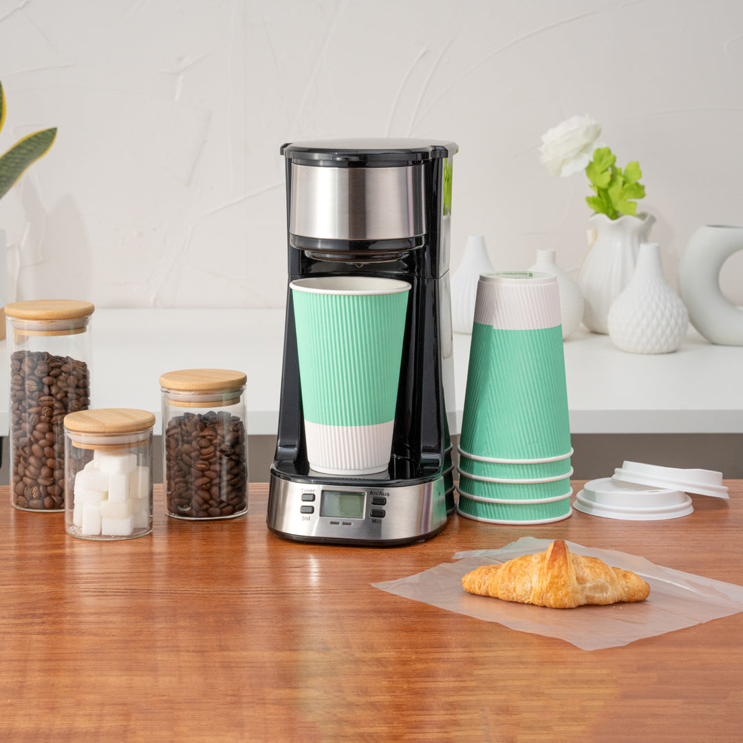 Maintain beverage temperature and enhance grip with ripple wall coffee cups. Restpresso 16 oz Paper Coffee Cups With Lids provide a ripple wall design that insulates drinks, ensuring safe hot beverage service while eliminating the need for additional sleeves. The light green color of these coffee-to-go cups differentiates drinks for easy identification, enhancing the efficiency of your café's service. Made from durable paper, these cups measure 3.6 inches in length, 3.6 inches in width, and 6.2 inches in height, offering a 16-ounce capacity that's perfect for standard large beverages. Each cup includes a tight-fitting lid, preventing spills and maintaining the heat of coffee, ideal for on-the-go consumption. Elevate your beverage service with these stylish and practical paper coffee cups with lids. Each order includes 200 Restpresso 16 oz Paper Coffee Cups with Lids.