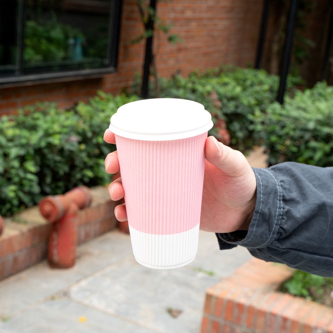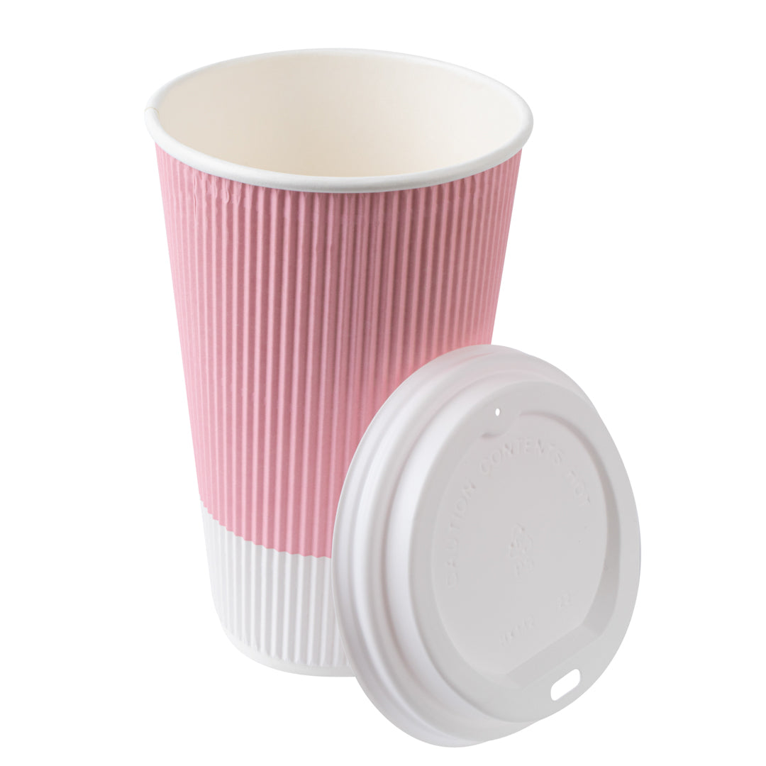 16 OZ LIGHT PINK PAPER RIPPLE WALL COFFEE CUP - WITH WHITE LID