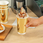 Impress guests with our Restpresso 16-ounce Metallic Gold Paper Hot / Cold Cups. Their shimmering gold finish enhances the look of any beverage table while offering flexibility for both hot and cold drinks. From steaming chai lattes to chilled mocktails, these cups do it all with elegance. Made from thick paper, they’re strong enough for extended use without losing shape. Thanks to their freezer-safe build, they’re perfect for prepping frozen treats or beverages ahead of service. A sophisticated solution for parties, venues, and events of all sizes. Each cup measures 2.36 inches in diameter by 5.32 inches in height and holds up to 16 ounces. Sold in a 25 count box.