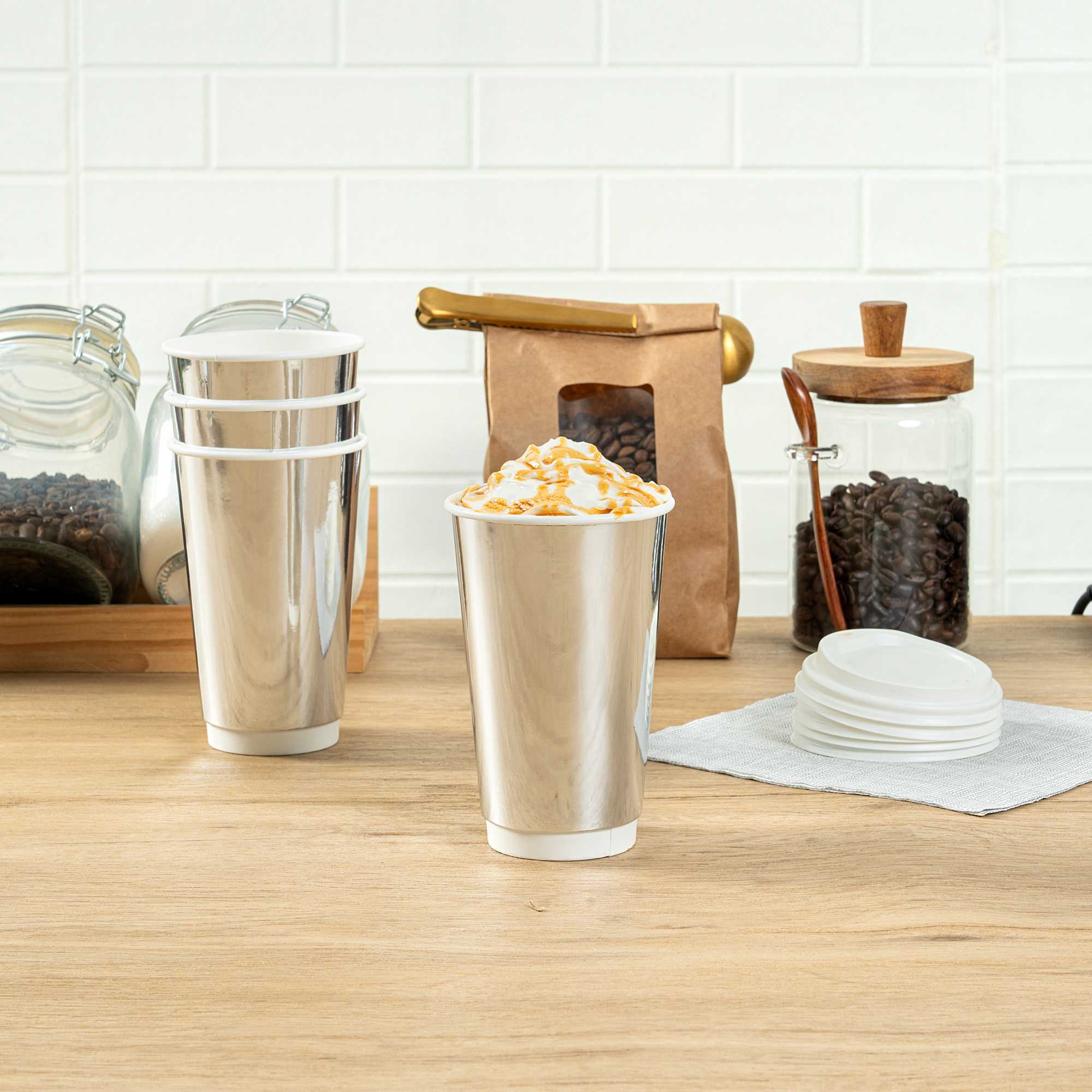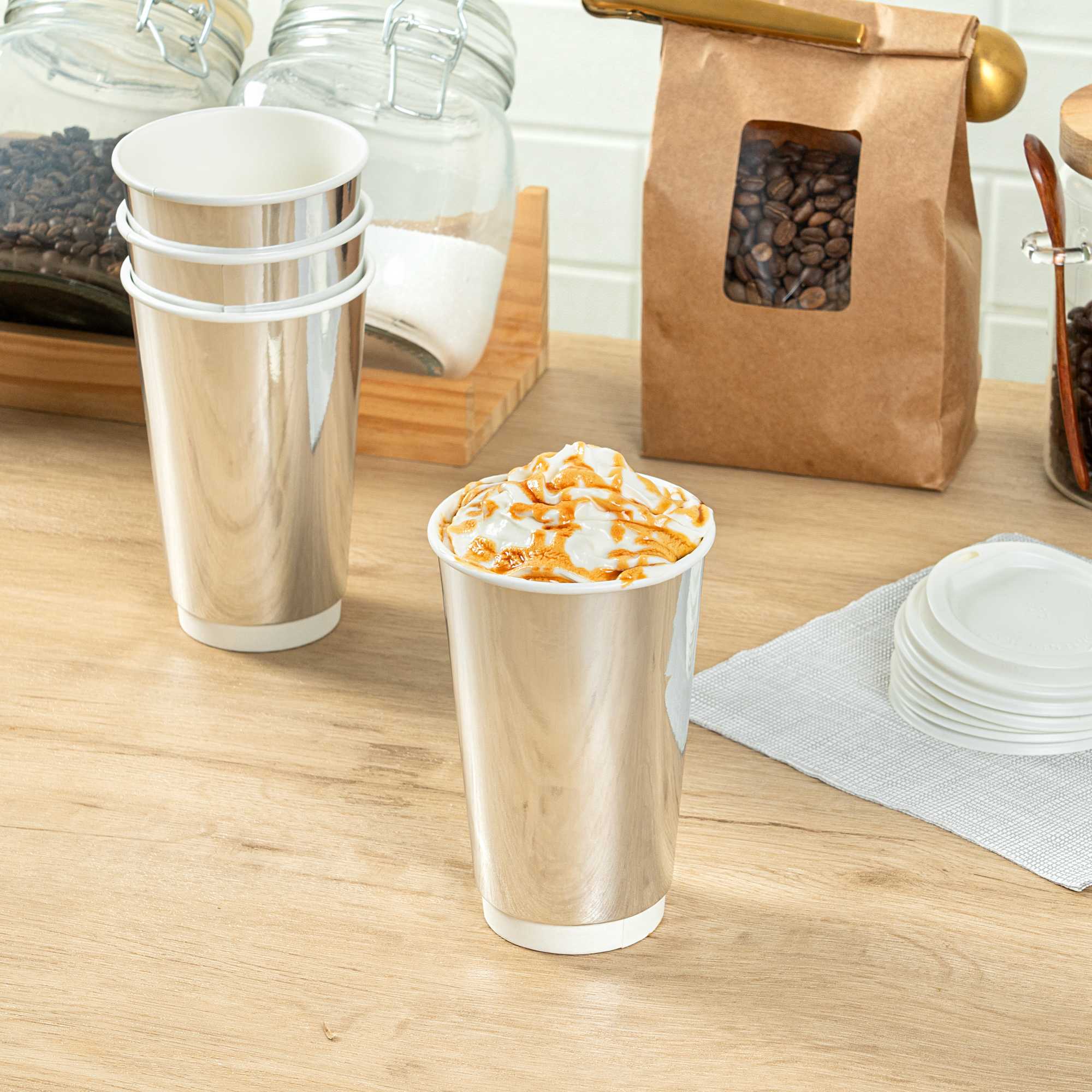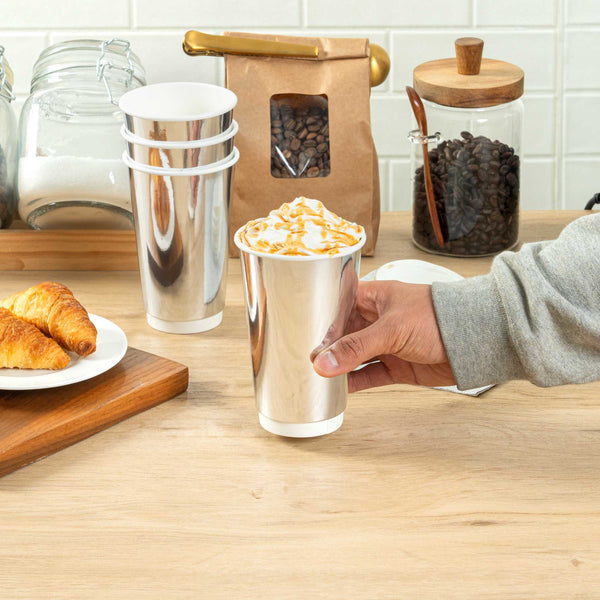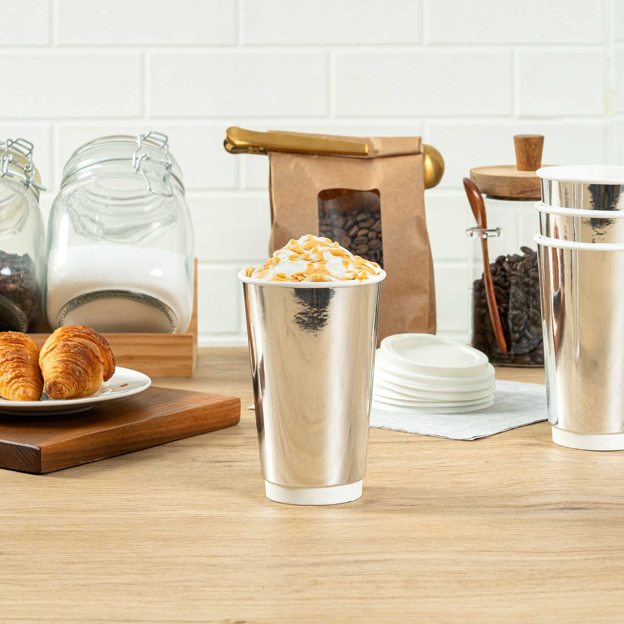 Deliver standout service with our Restpresso 16-ounce Metallic Silver Paper Hot / Cold Cups. The metallic silver coating adds sleek, modern sophistication to beverage stations at weddings, conferences, or catered functions. Designed for both hot and chilled drinks, these cups easily hold coffee, punch, or sparkling water. Built from durable paper, they provide consistent performance without warping or leaks. Freezer-safe for added convenience, they suit prep-ahead service models as well. A dependable and upscale disposable choice for high-traffic events. Each cup measures 2.36 inches in diameter by 5.32 inches in height and holds up to 16 ounces. Sold in a 500 count box.