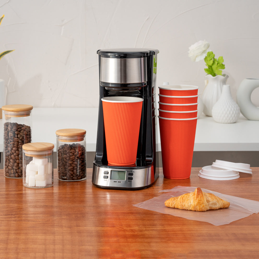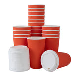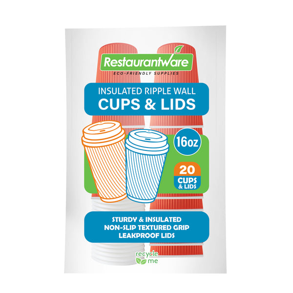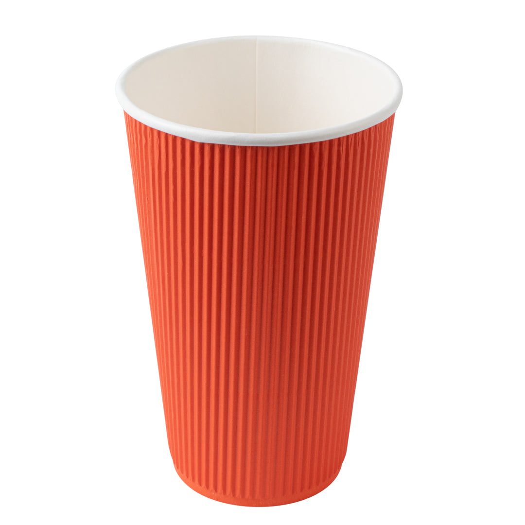 Maintain optimal beverage temperature with ripple wall insulation. Restpresso 16 oz Insulated Grip Disposable Coffee Cup in Tangerine Orange, made from sturdy paper, provides a comfortable grip that keeps hands cool without the need for additional sleeves. This ripple wall insulated cup ensures your 16-ounce hot drinks stay warm longer, making it an ideal choice for busy coffee shops and catering events. The included lids form a tight seal to prevent spills and leakage, transforming it into a reliable disposable coffee cup with a lid that supports efficient takeaway operations. Its recyclable design aligns with sustainable foodservice practices, allowing your business to reduce its environmental impact. Perfect for cafes and office breakrooms, this 3.6-inch by 6.2-inch cup is a practical addition to any beverage service. Each order includes 20 Restpresso 16 oz Insulated Grip Disposable Coffee Cups.