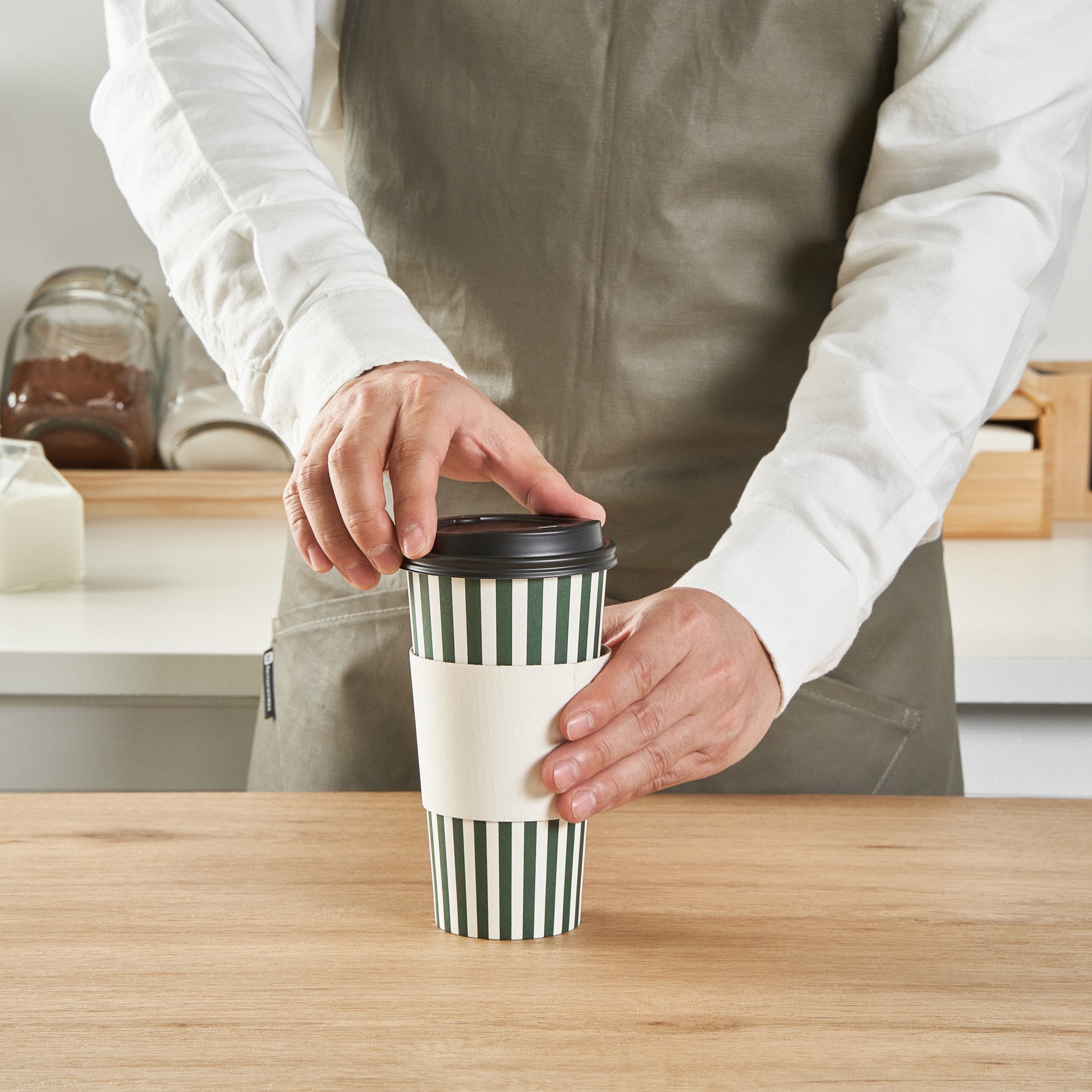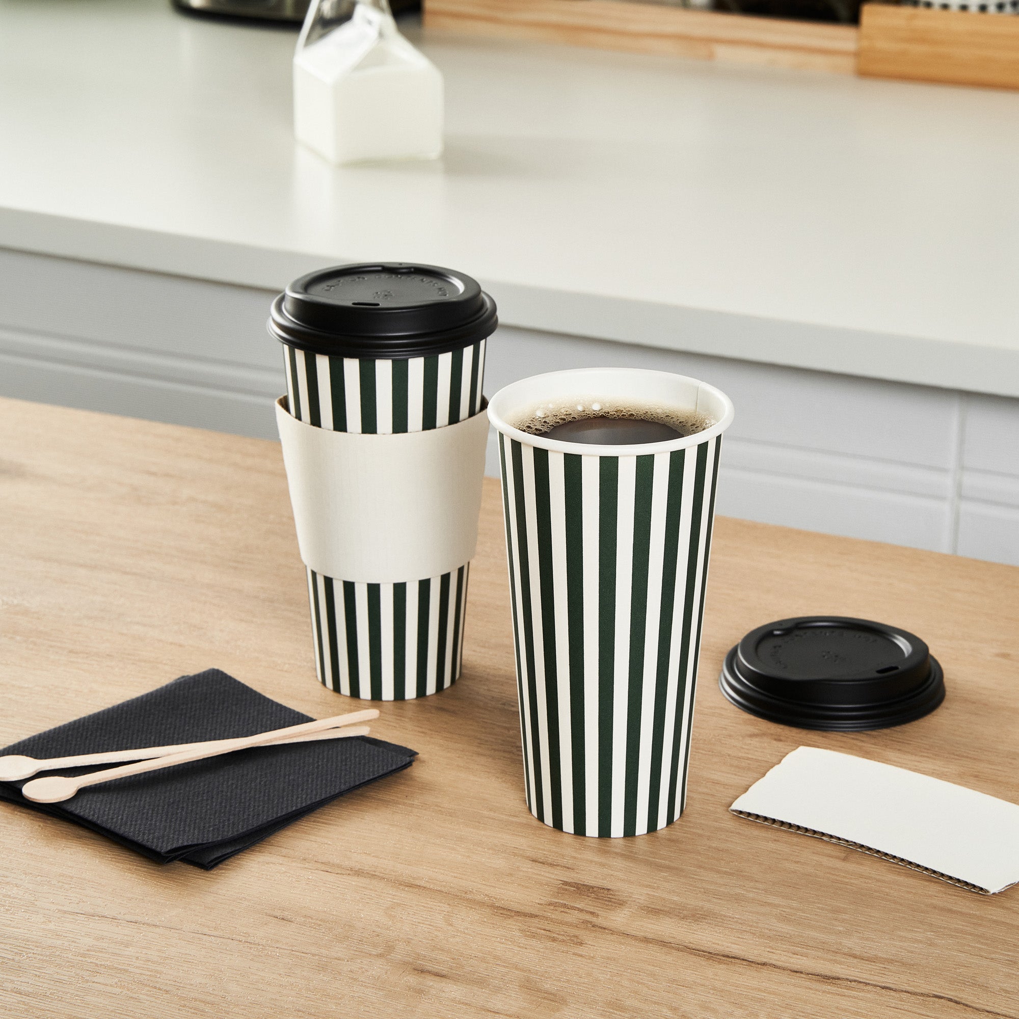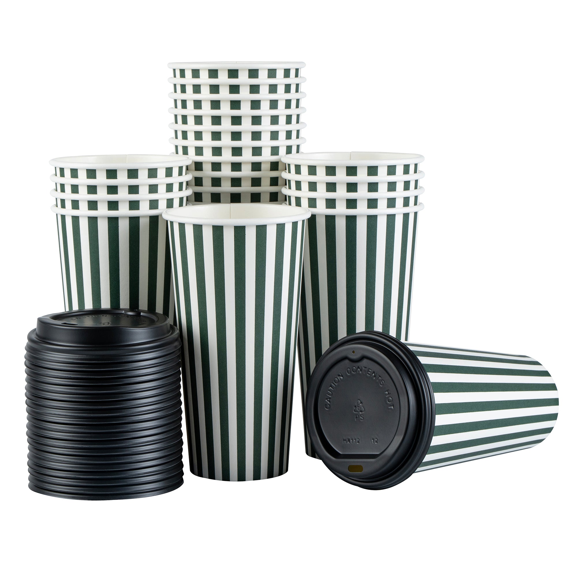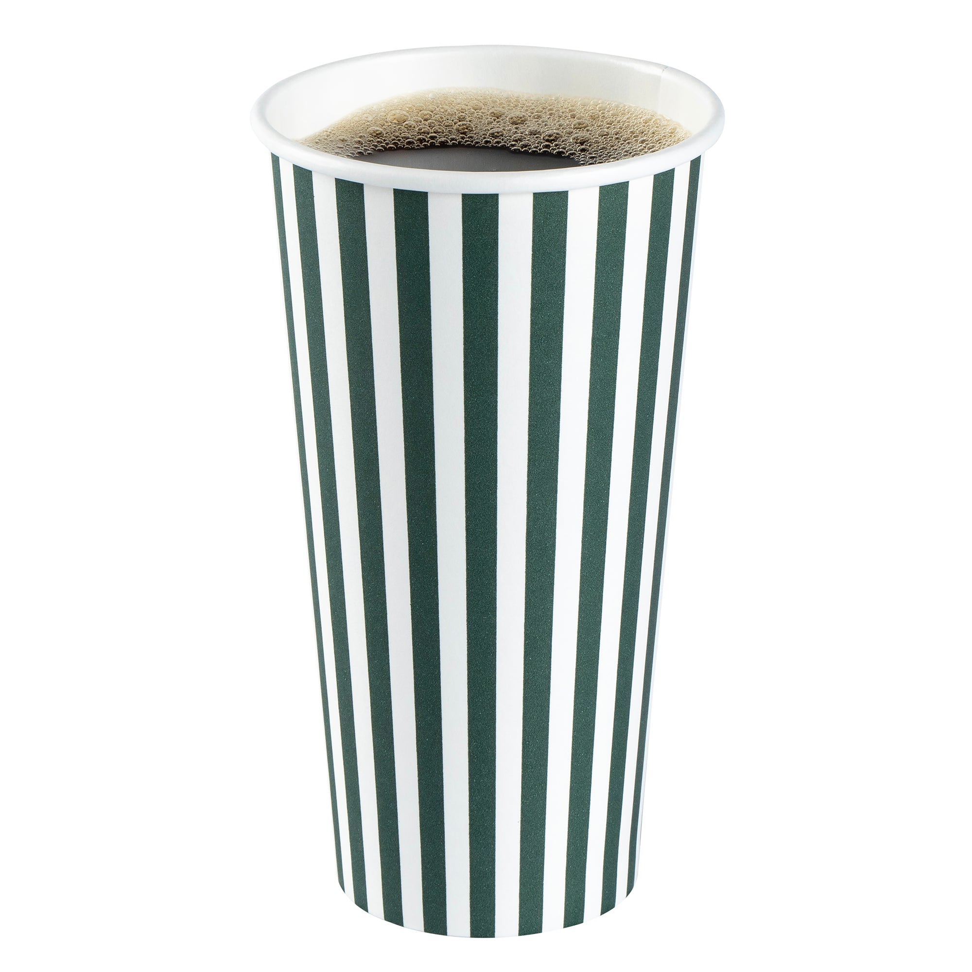 Experience the perfect blend of style and functionality with our Restpresso 20-ounce Forest Green and White Stripe Paper Single Wall Coffee Cups. Designed to hold all kinds of beverages, these disposable hot cups feature a single wall construction that's perfect for hot and cold drinks. With a striking forest green and white striped finish, these coffee cups instantly elevate the presentation of your drinks. Crafted with a greaseproof PE liner, these disposable coffee cups ensure a leak-resistant seam for comfortable sipping. The black lid that comes with these single-use coffee cups offers a secure fit, reducing spills and messes during transport. These single wall coffee cups are stackable and save valuable storage space in your establishment. Pair these coffee cups with our array of cup sleeves designed to maximize traction, reducing the likelihood of accidental spills or slips. Boasting a generous 20-ounce capacity, these recyclable hot tea cups are perfect for serving large coffee drinks or other hot beverages. Measuring 3.5 inches in diameter by 6.5 inches in height, these striped coffee cups provide a comfortable grip for your customers. Sold in a 400 count box. Sleeves are available and sold separately.