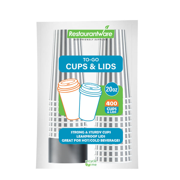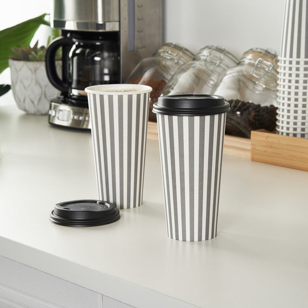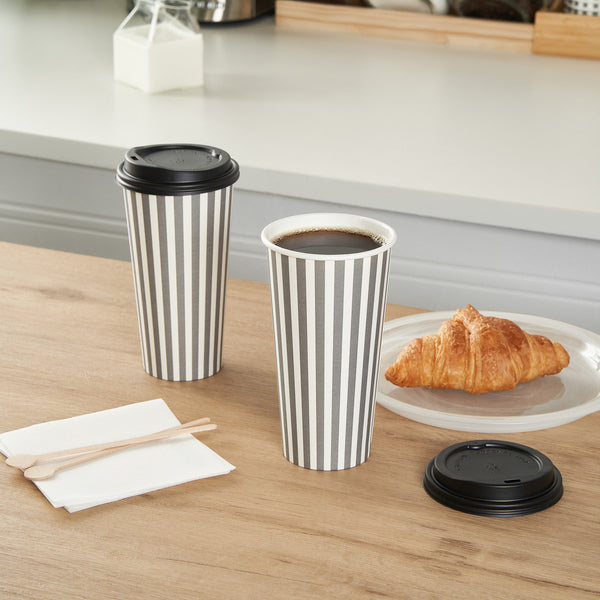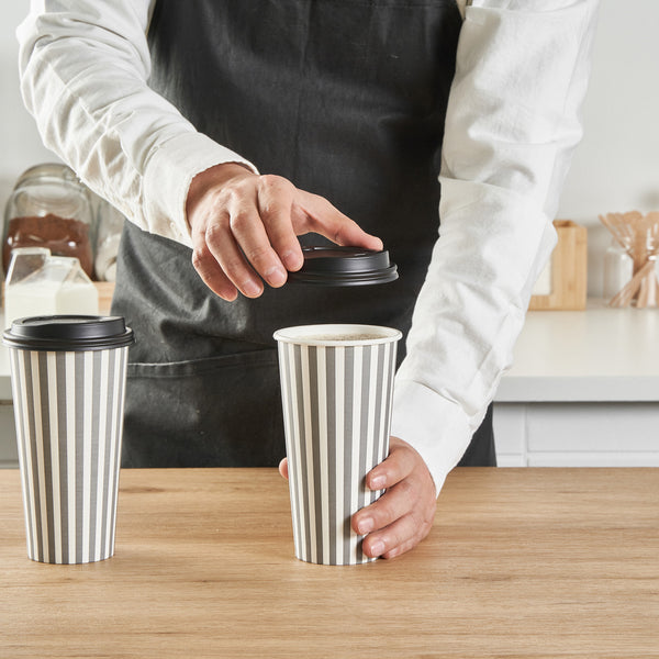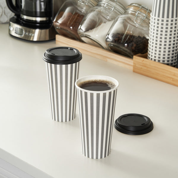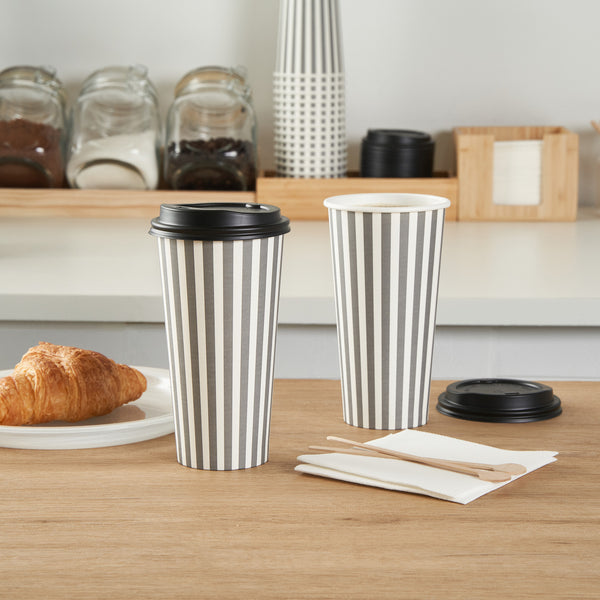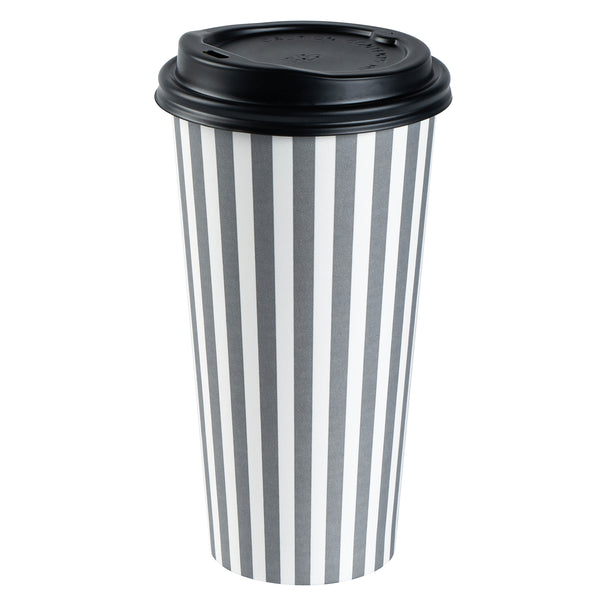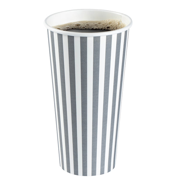 Elevate your beverage service with our Restpresso 20-ounce Gray and White Stripe Paper Single Wall Coffee Cups. Boasting a fashionable gray and white striped finish, these single-use coffee cups add a touch of elegance to your coffee shop or cafe. Crafted with a greaseproof PE liner, these disposable hot cups avert unwanted leaks and spills, ensuring a clean and enjoyable sipping experience. The single-wall construction of these paper coffee cups is durable and suitable for all kinds of drinks, whether hot or cold. For added convenience, these coffee cups have a black lid that fits snugly, reducing spills during transit. Plus, the rolled rim and leak-resistant seam of these cold coffee cups provide a comfortable drinking experience. These recyclable hot tea cups are stackable, making storage and display a breeze. Combine these coffee cups with our collection of cup sleeves engineered for improved grip, minimizing the risk of accidental spills or slips. With a capacity of 20 ounces, these single wall coffee cups are perfect for serving large, satisfying servings of coffee, tea, hot chocolate, and other warm beverages. Measuring 3.5 inches in diameter by 6.5 inches in height, these striped coffee cups are compact and easy to handle, enhancing customer convenience. Sold in a 400 count box. Sleeves are available and sold separately.