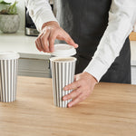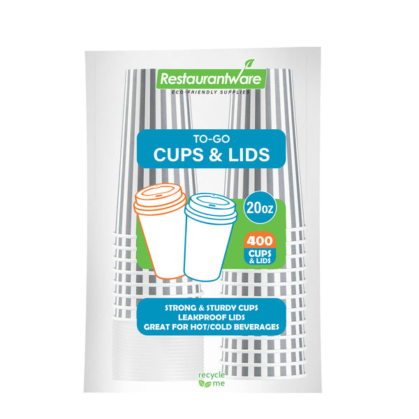 Prevent spills with our stylish takeaway coffee cup solution. The Restpresso Leakproof Paper Coffee Cup, featuring a 20oz coffee cup capacity, offers a perfect blend of functionality and aesthetics. Each paper coffee cup with lid includes leakproof lids that ensure secure transport, eliminating the risk of spills while on the go. The greaseproof lining maintains the integrity of the cup, preventing sogginess even with hot beverages, making it an ideal choice for coffee shops and cafes. The gray and white striped design enhances coffee and tea presentations, adding a touch of sophistication to any service. Measuring 3.5 inches in diameter and 6.6 inches in height, these recyclable cups support eco-friendly practices, catering to the needs of environmentally conscious establishments. Elevate your hot beverage service with these efficient and attractive cups that cater to customer preferences. Each order includes 400 Restpresso Leakproof Paper Coffee Cups.