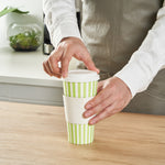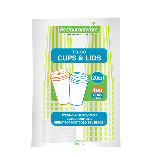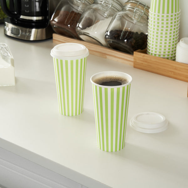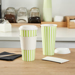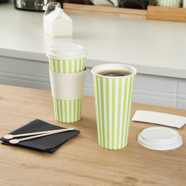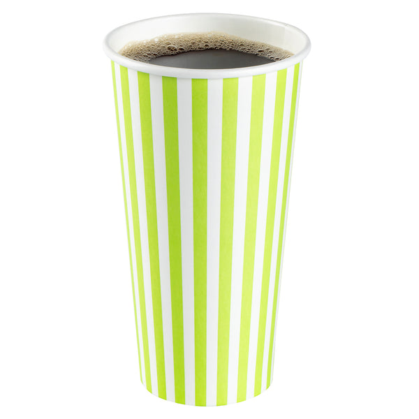Serve your hot and cold beverages in style with our Restpresso 20-ounce Green and White Stripe Paper Single Wall Coffee Cups. Crafted with a greaseproof PE liner, these paper coffee cups ensure a comfortable customer experience. Boasting a single-wall construction, these disposable hot cups come are ideal for hot and cold drinks, making them a versatile addition to your foodservice business. The leakproof white lid of these cups for coffee allow you to take your beverages on the go without any mess. With their stylish green and white striped finish, these single wall coffee cups not only function well but also look great, adding a touch of elegance to your beverage offerings. Featuring a rolled rim and a leak-resistant seam, these disposable coffee cups ensure a secure and comfortable sipping experience for your customers. Easily stackable, these paper cups are designed to optimize your storage space, making them a convenient choice for businesses of all sizes. Couple these insulated coffee cups with our diverse sleeve options for a warm and secure coffee-drinking experience. With a generous 20-ounce capacity and measuring 3.5 inches in diameter by 6.5 inches in height, these recyclable hot tea cups can comfortably hold large servings of your delicious beverages, making them perfect for coffee shops, cafes, and take-out services. Sold in a 400 count box. Sleeves are available and sold separately.