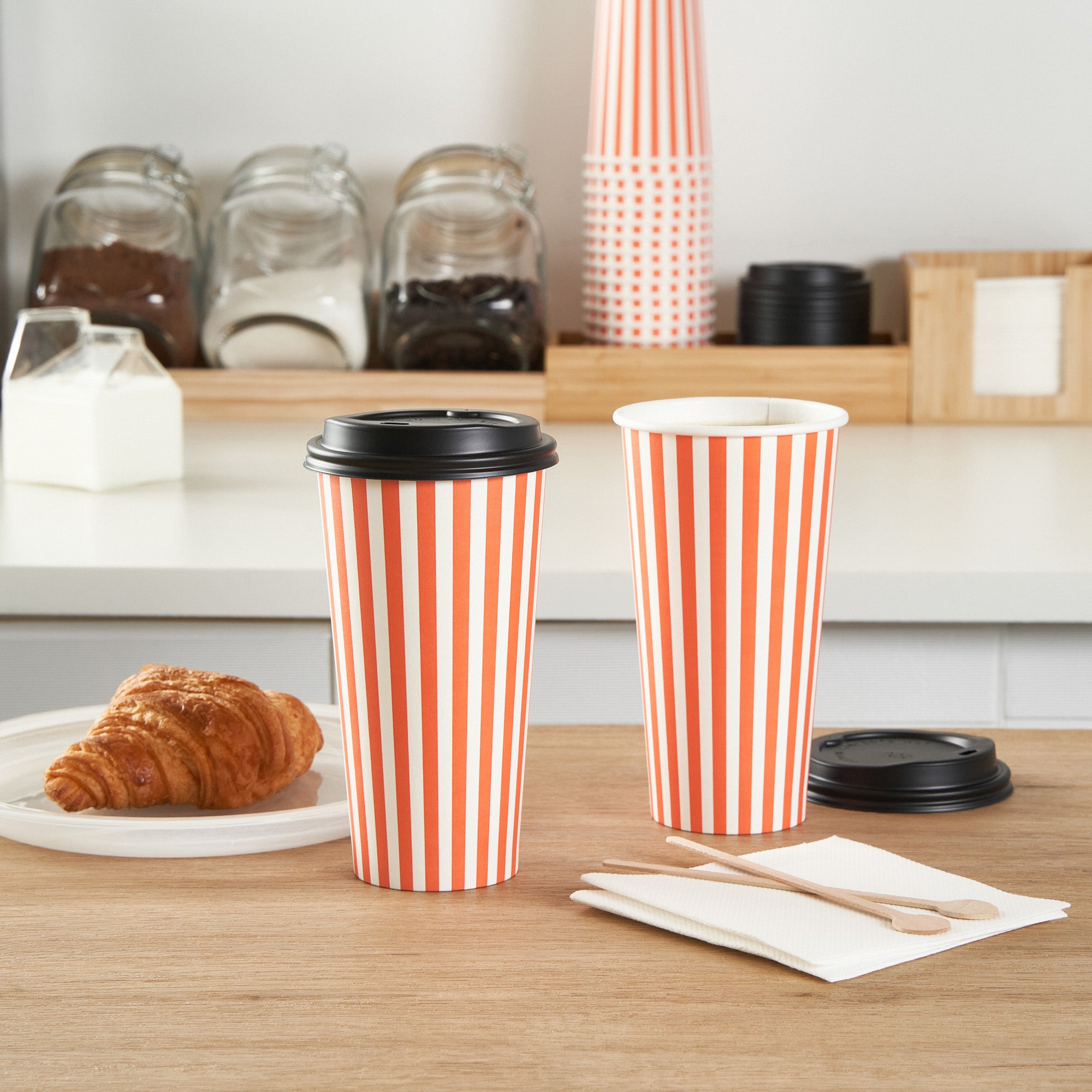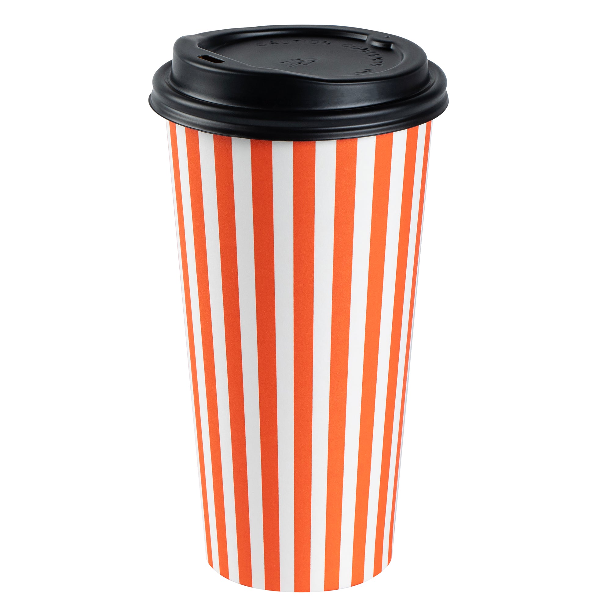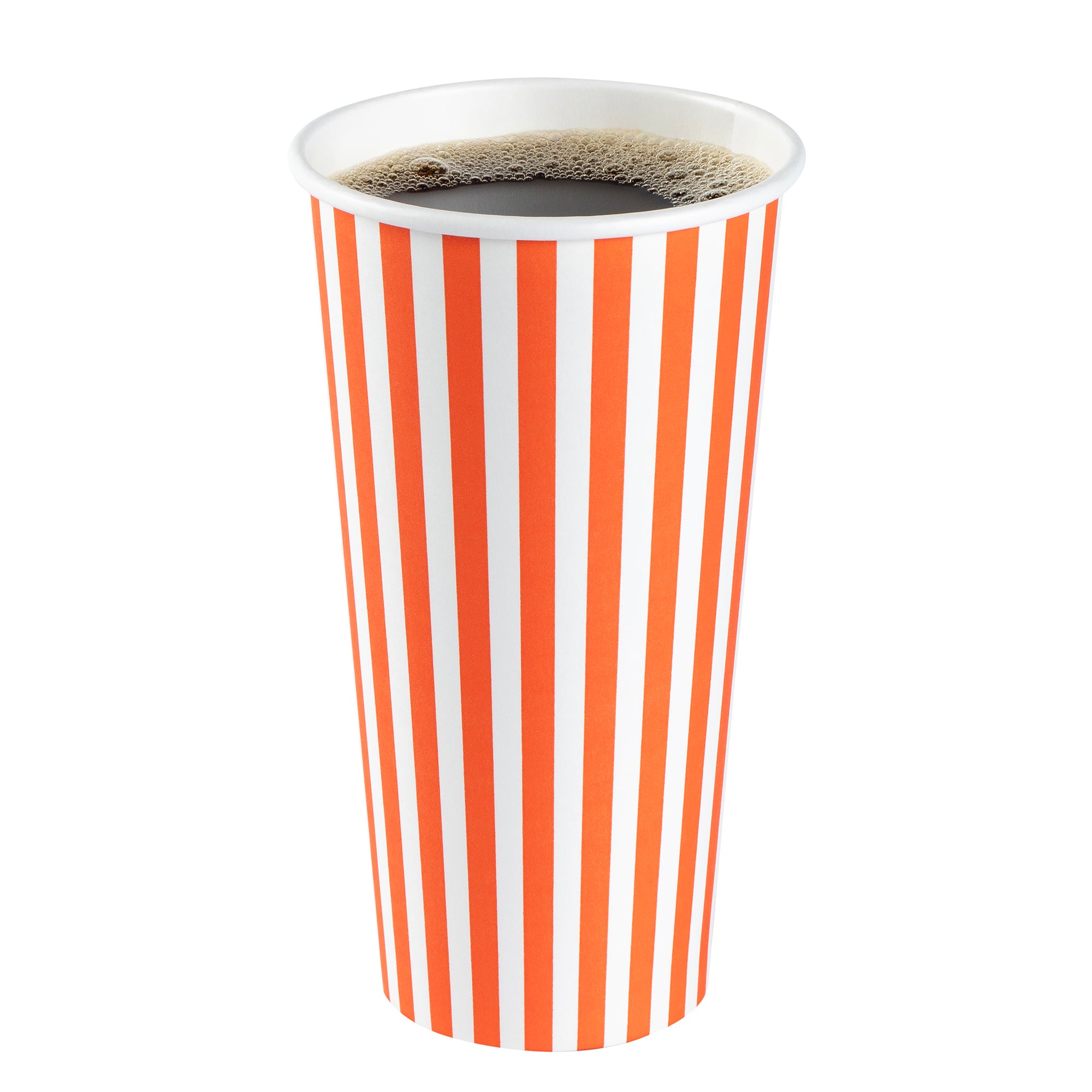 Serve up delicious hot or cold beverages in our Restpresso 20-ounce Orange and White Stripe Paper Single Wall Coffee Cups. These paper coffee cups feature an eye-catching orange and white striped finish and sturdy single-wall construction, perfect for busy cafes and restaurants. Designed with a greaseproof PE liner, these disposable hot cups avert leaks and maintain the integrity of your beverages. Keep your customers and beverages secure with the included black lid that ensures a snug fit on these single-use coffee cups. These recyclable hot tea cups can be easily stacked, saving valuable counter space in your establishment. The rolled rim and leak-resistant seam of these single wall coffee cups provide an enjoyable drinking experience for your customers. Match these coffee cups with our curated cup sleeve selection, intended to bolster grip and prevent accidental spills or slips. With a generous 20-ounce capacity and measuring 3.5 inches in diameter by 6.5 inches in height, these striped coffee cups are perfect for serving a variety of hot or cold beverages. Sold in a 20 count box. Sleeves are available and sold separately.