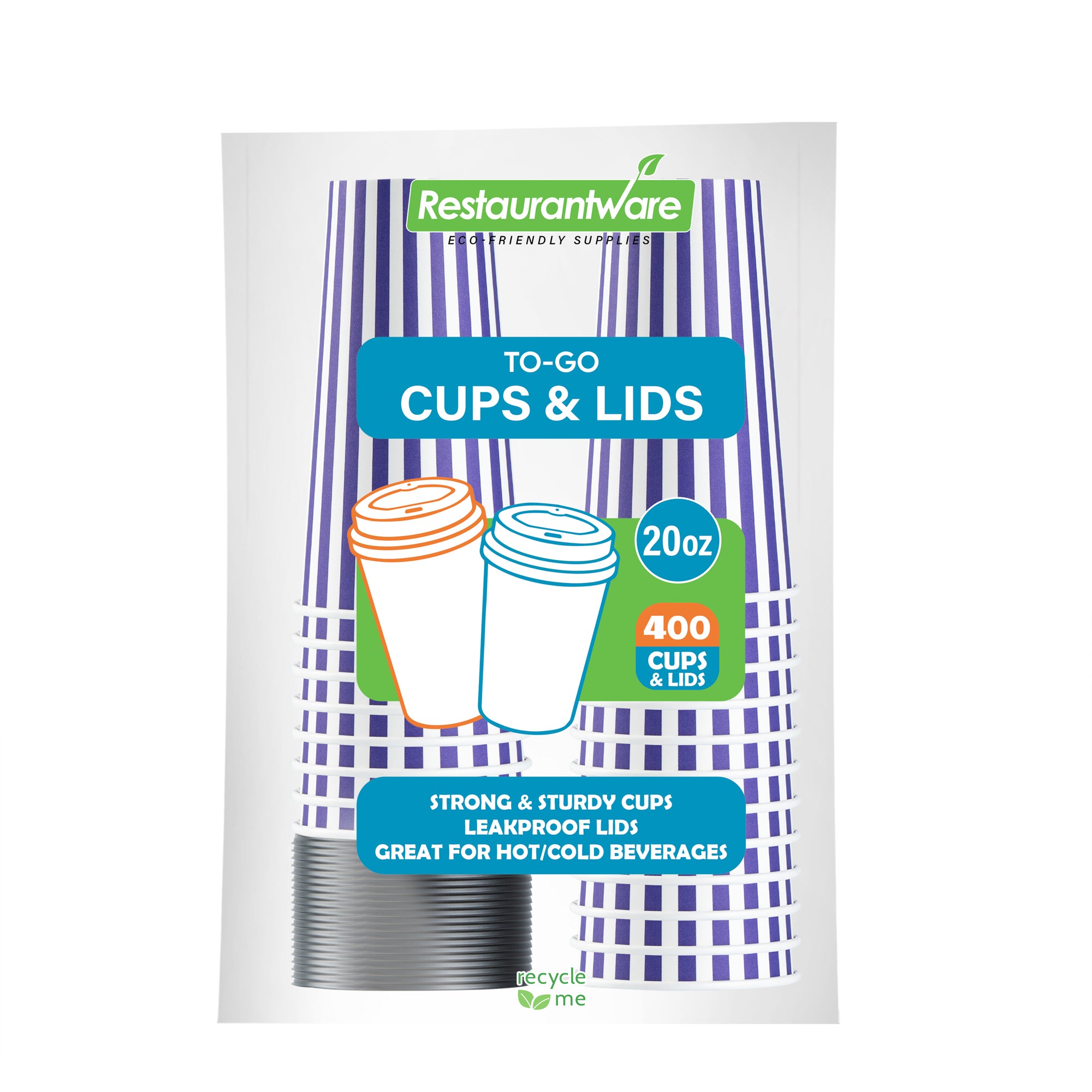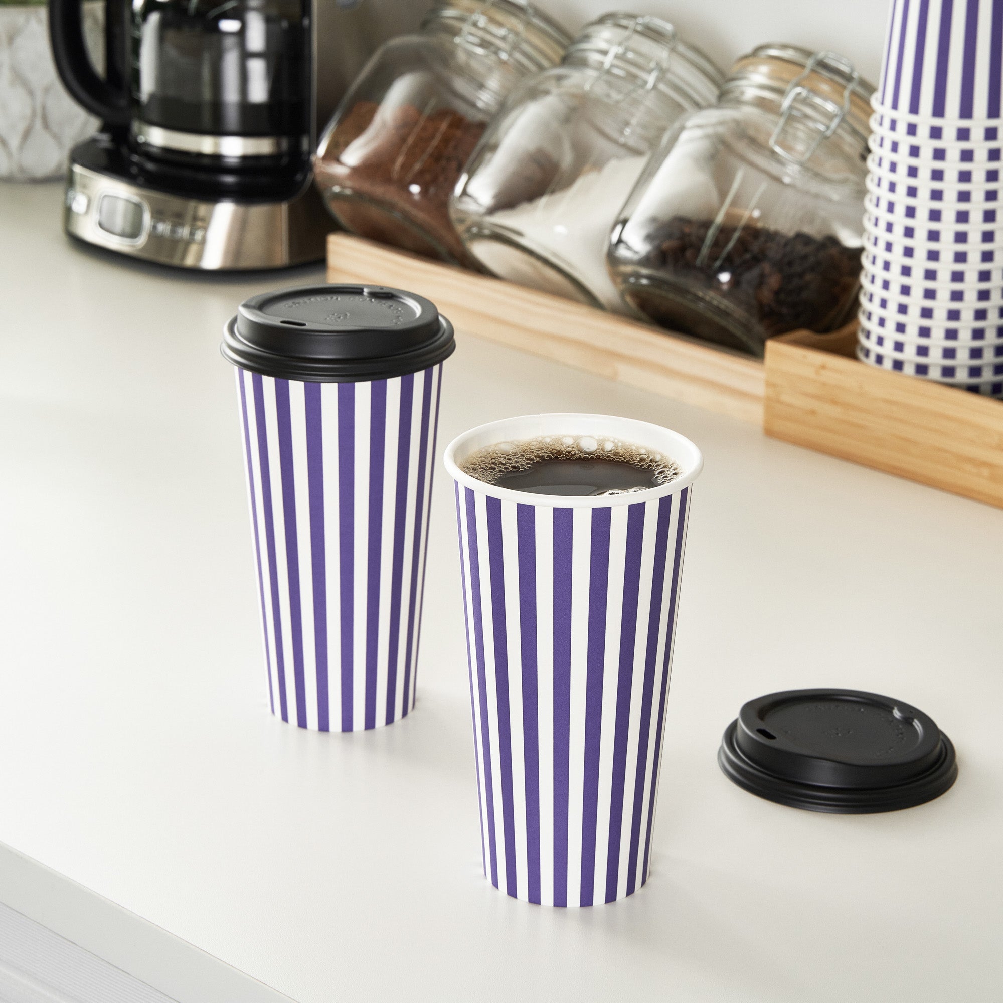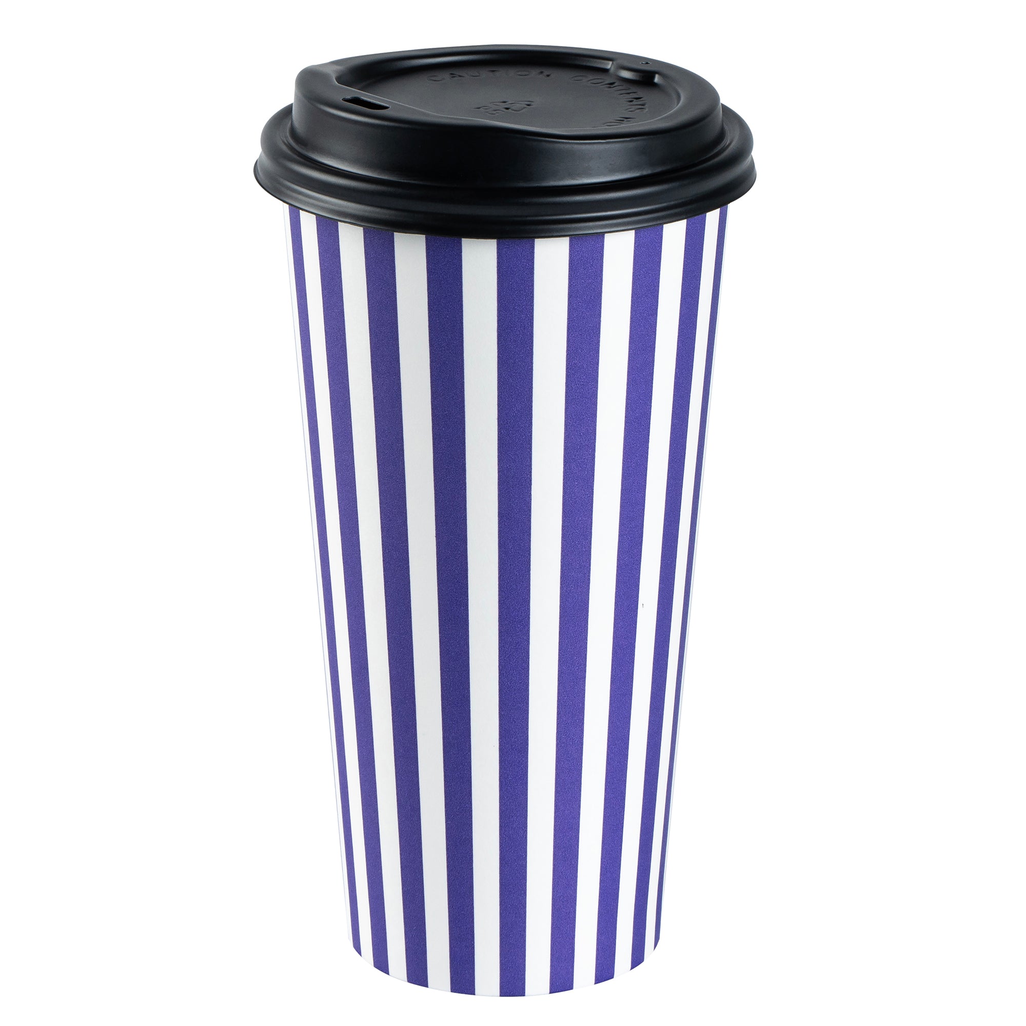 Start your day right with our Restpresso 20-ounce Purple and White Stripe Paper Single Wall Coffee Cups. Boasting a greaseproof construction with a PE liner, these paper coffee cups keep the integrity of your beverages intact while minimizing unwanted leaks and spills. The leakproof black lid of these cups for coffee secures your beverages while on the go. With their striking purple and white striped finish, these disposable hot cups not only serve coffee but also add a pop of color to your daily routine. Designed for convenience, these single wall coffee cups are perfect for on-the-go customers, ensuring their coffee stays warm while keeping their hands cool. Owing to their stackable design, these single-use coffee cups minimize storage space and provide efficient service during peak hours. The rolled rim provides a comfortable drinking experience, while the leak-resistant seam ensures a clean environment. Pair these coffee cups with our designated cup sleeves engineered to heighten grip and diminish the risk of accidental spills or slips. Contains up to 20-ounce of your favorite beverages, these recyclable hot tea cups are versatile and practical, measuring 3.5 inches in diameter by 6.5 inches in height. Sold in a 20 count box. Sleeves are available and sold separately.