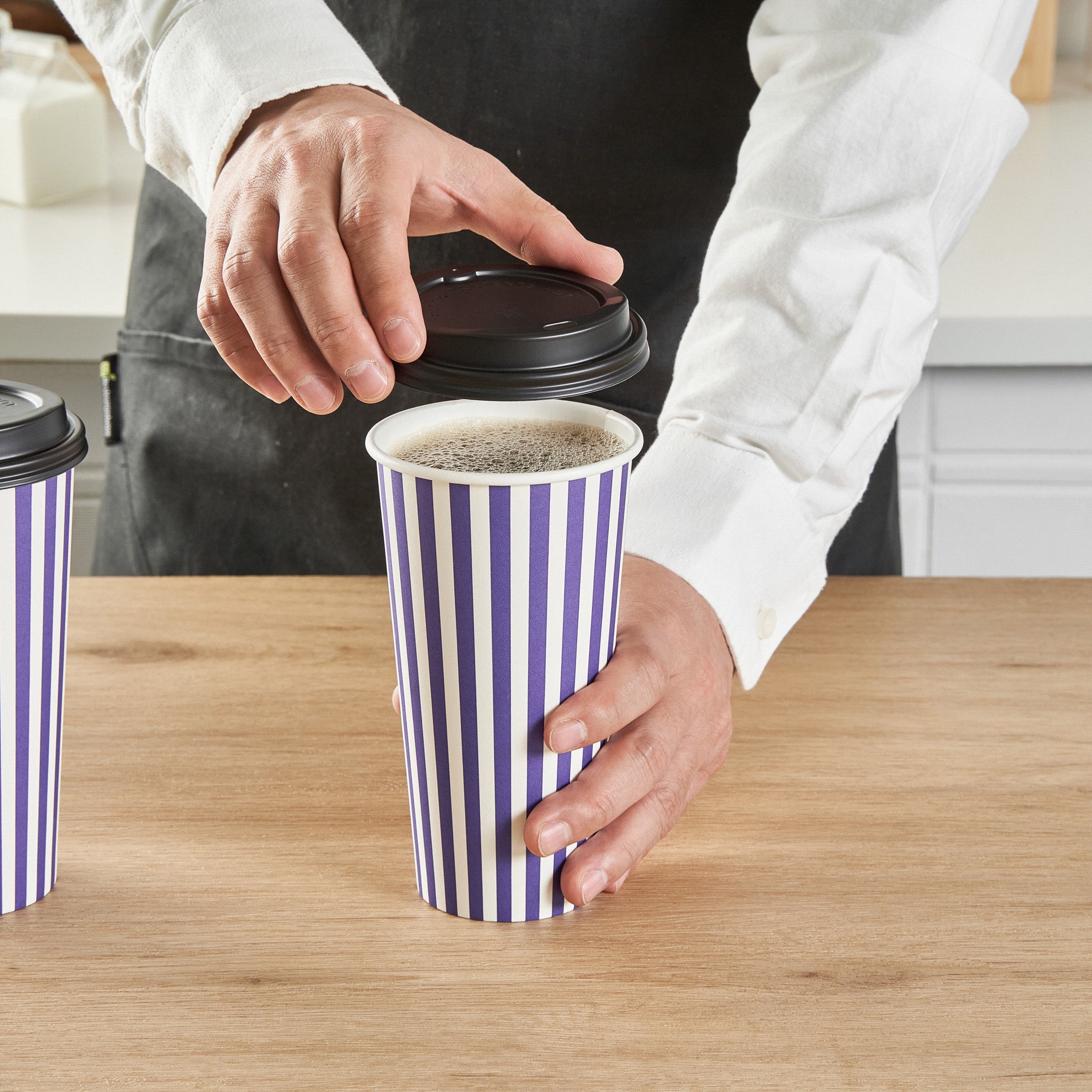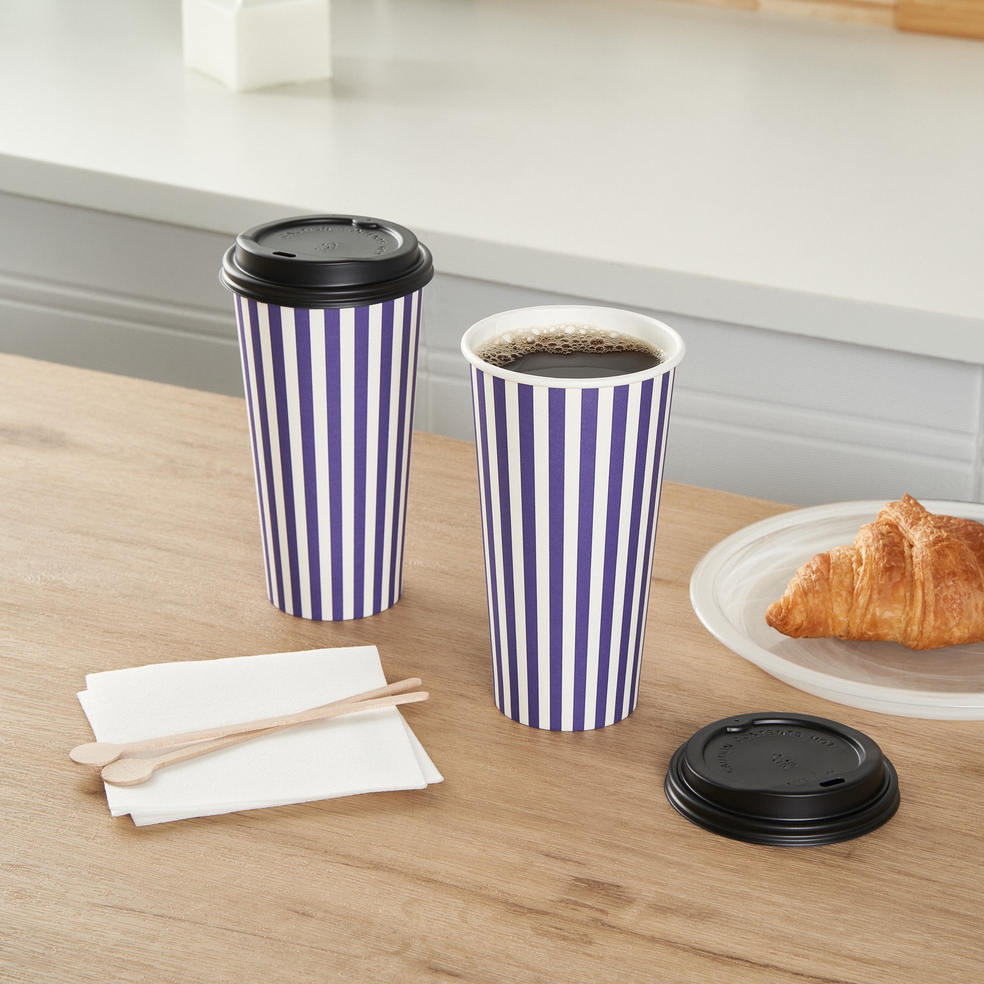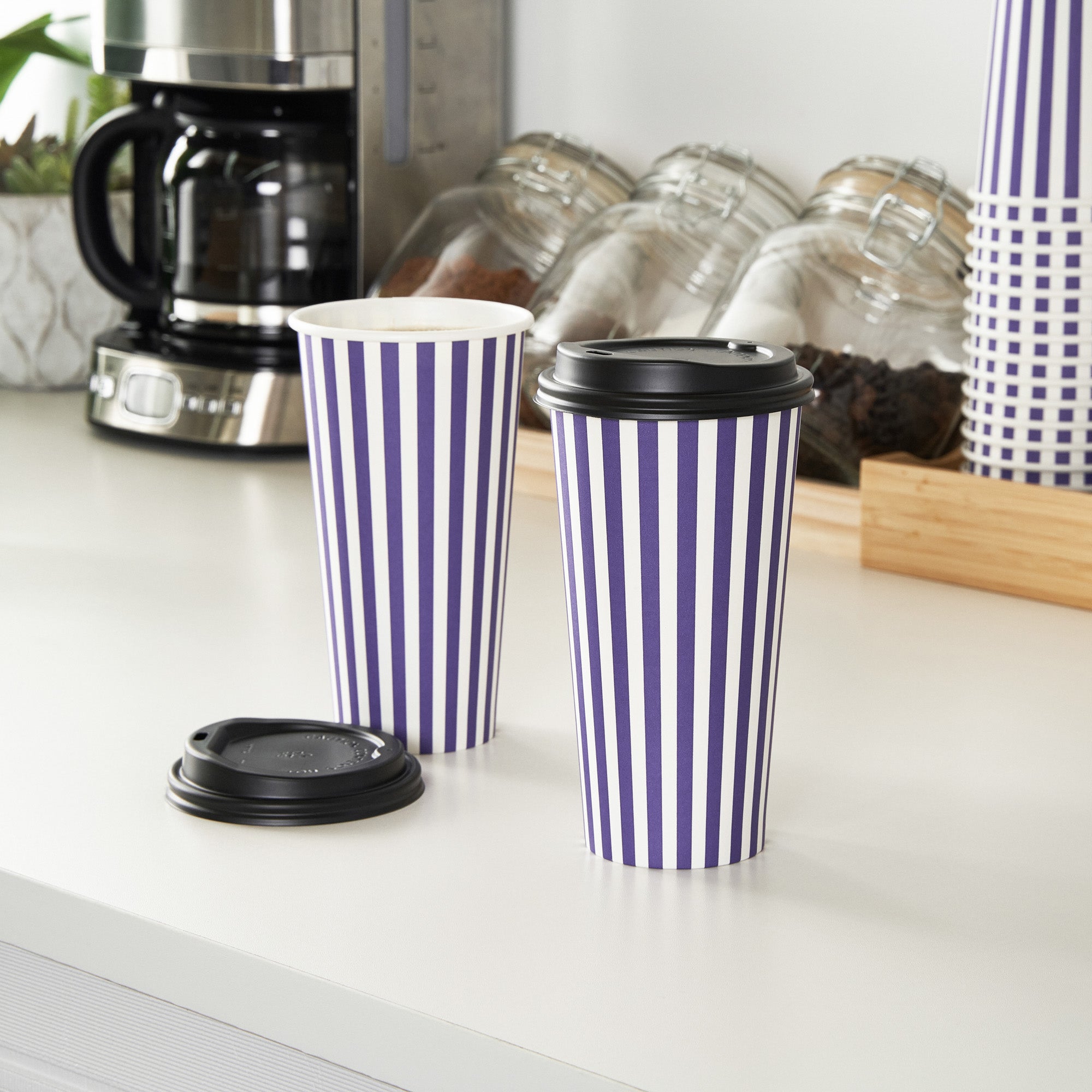 Start your day right with our Restpresso 20-ounce Purple and White Stripe Paper Single Wall Coffee Cups. Boasting a greaseproof construction with a PE liner, these paper coffee cups keep the integrity of your beverages intact while minimizing unwanted leaks and spills. The leakproof black lid of these cups for coffee secures your beverages while on the go. With their striking purple and white striped finish, these disposable hot cups not only serve coffee but also add a pop of color to your daily routine. Designed for convenience, these single wall coffee cups are perfect for on-the-go customers, ensuring their coffee stays warm while keeping their hands cool. Owing to their stackable design, these single-use coffee cups minimize storage space and provide efficient service during peak hours. The rolled rim provides a comfortable drinking experience, while the leak-resistant seam ensures a clean environment. Pair these coffee cups with our designated cup sleeves engineered to heighten grip and diminish the risk of accidental spills or slips. Contains up to 20-ounce of your favorite beverages, these recyclable hot tea cups are versatile and practical, measuring 3.5 inches in diameter by 6.5 inches in height. Sold in a 20 count box. Sleeves are available and sold separately.