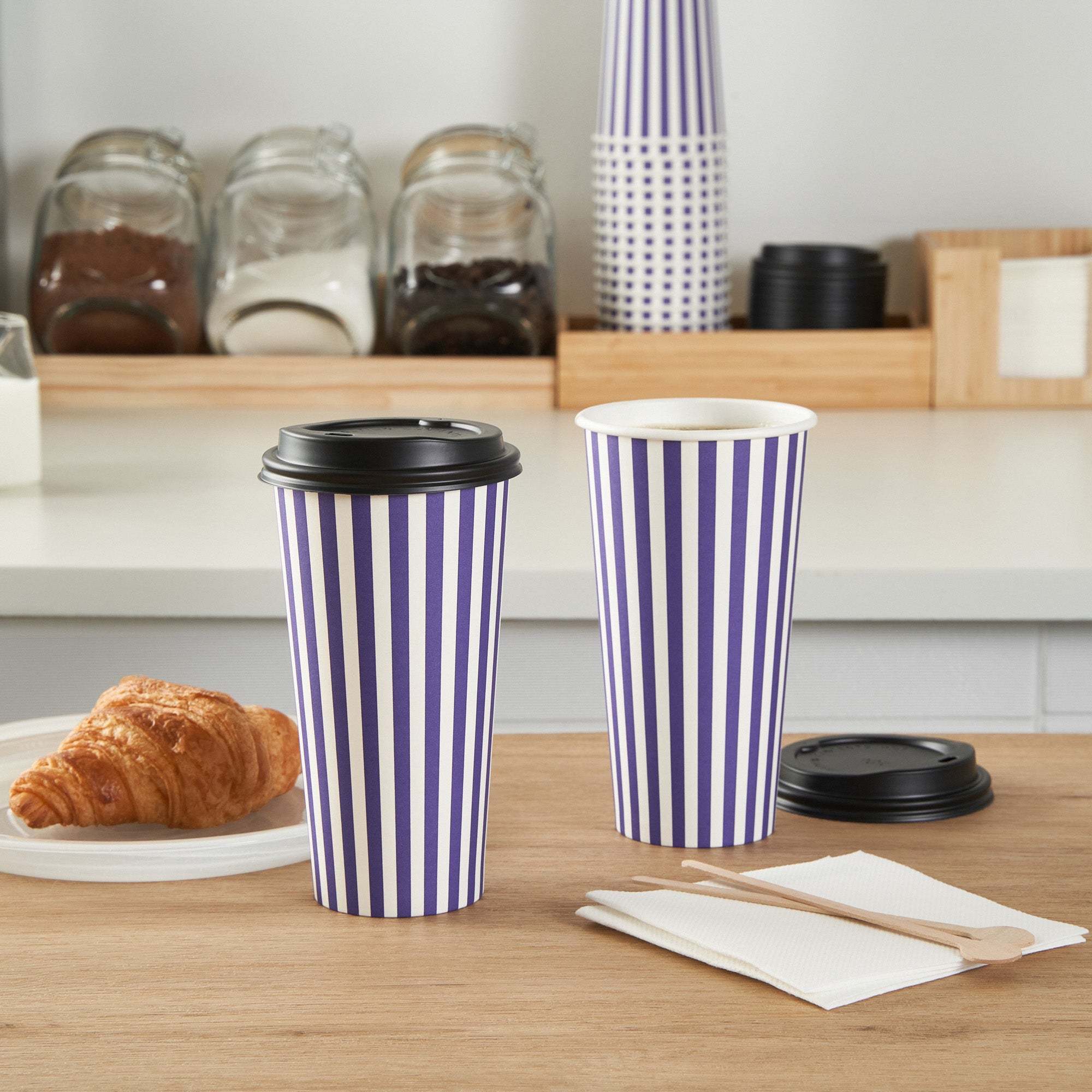 Start your day right with our Restpresso 20-ounce Purple and White Stripe Paper Single Wall Coffee Cups. Boasting a greaseproof construction with a PE liner, these paper coffee cups keep the integrity of your beverages intact while minimizing unwanted leaks and spills. The leakproof black lid of these cups for coffee secures your beverages while on the go. With their striking purple and white striped finish, these disposable hot cups not only serve coffee but also add a pop of color to your daily routine. Designed for convenience, these single wall coffee cups are perfect for on-the-go customers, ensuring their coffee stays warm while keeping their hands cool. Owing to their stackable design, these single-use coffee cups minimize storage space and provide efficient service during peak hours. The rolled rim provides a comfortable drinking experience, while the leak-resistant seam ensures a clean environment. Pair these coffee cups with our designated cup sleeves engineered to heighten grip and diminish the risk of accidental spills or slips. Contains up to 20-ounce of your favorite beverages, these recyclable hot tea cups are versatile and practical, measuring 3.5 inches in diameter by 6.5 inches in height. Sold in a 400 count box. Sleeves are available and sold separately.