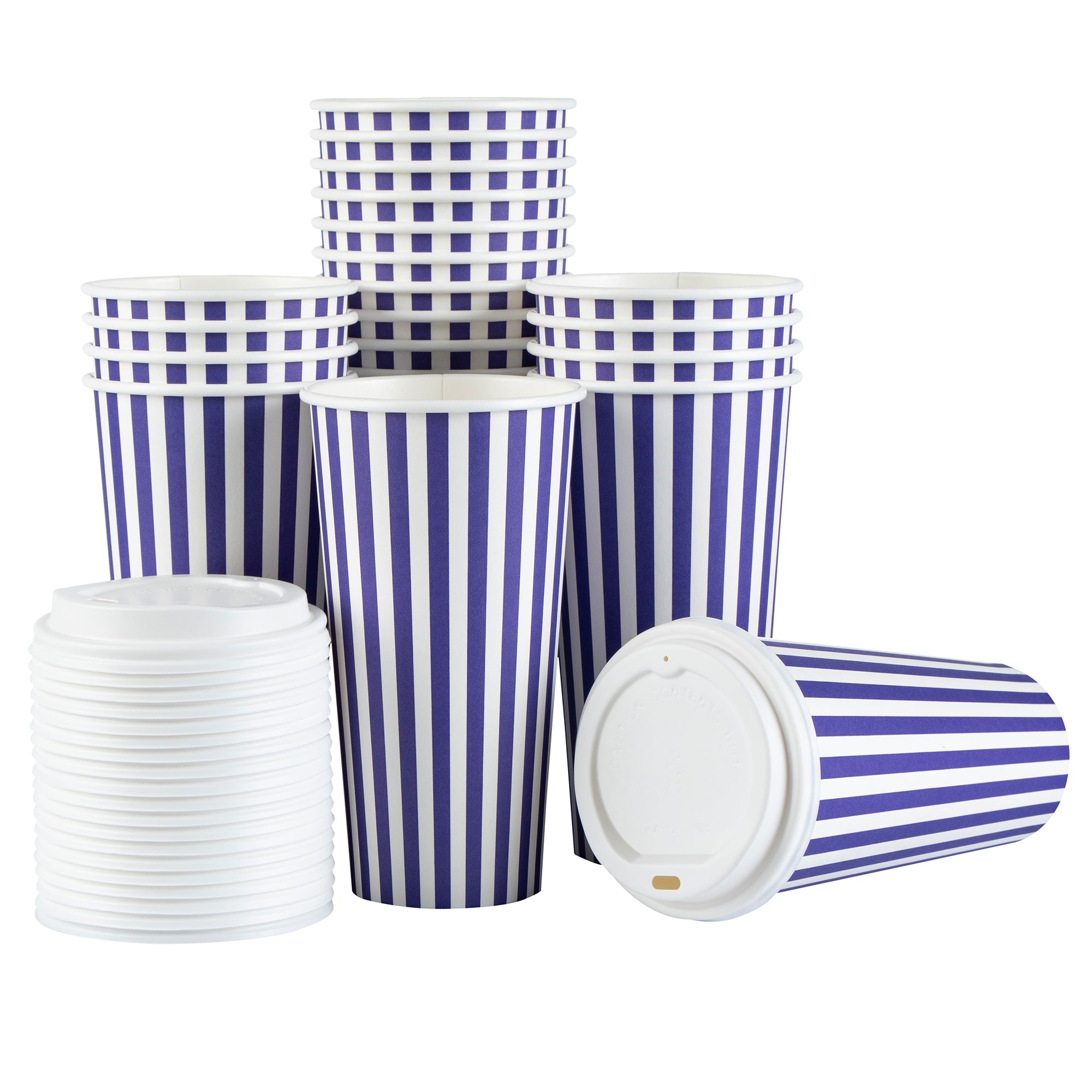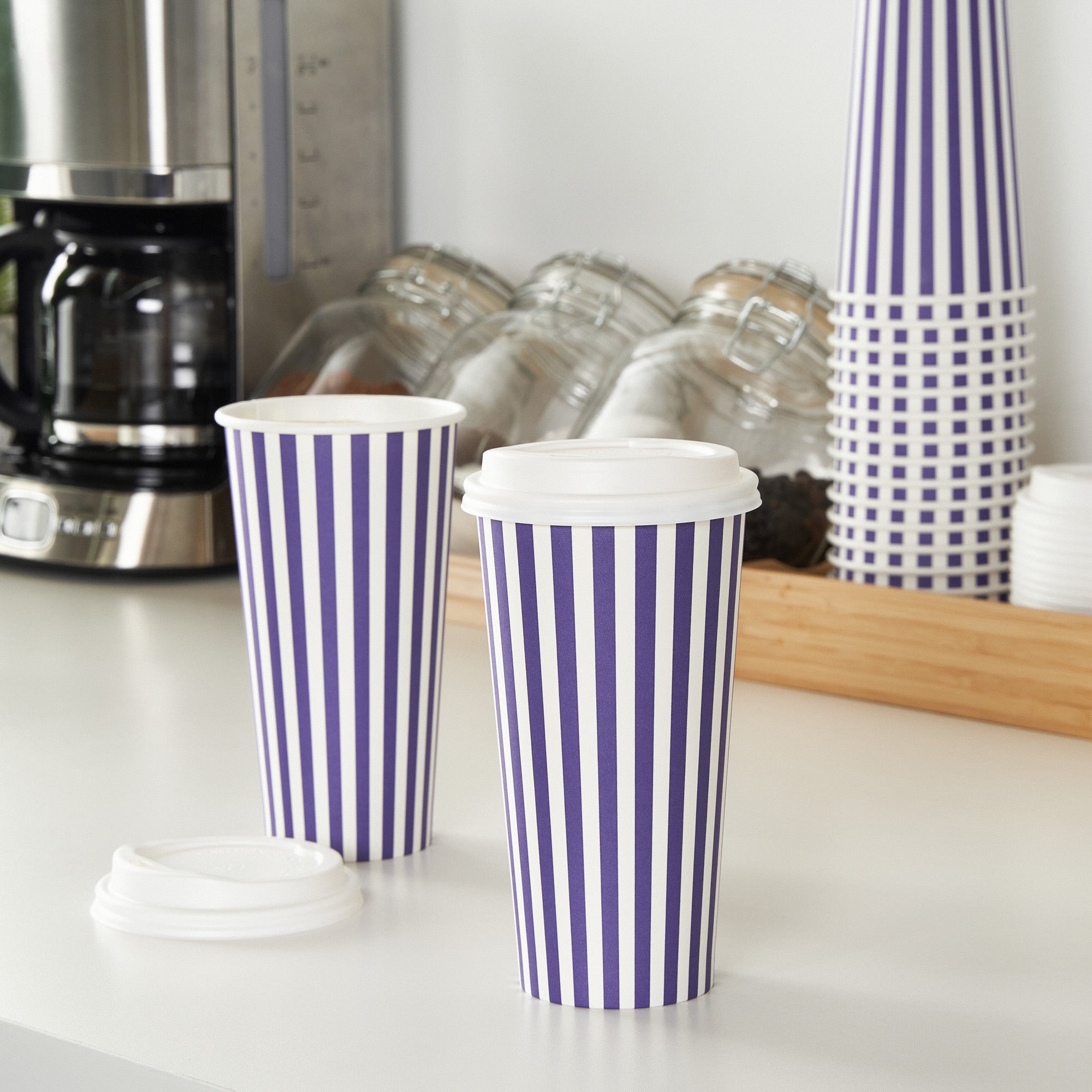 Begin your day with our Restpresso 20-ounce Purple and White Stripe Paper Single Wall Coffee Cups. Crafted with a greaseproof PE liner, these paper coffee cups reduce unwanted leaks and spills, ensuring a clean and convenient drinking experience. These disposable hot cups are expertly designed to hold hot and cold beverages, making them a versatile choice for any refreshment. Celebrate the uniqueness of these single wall coffee cups, featuring a vibrant purple and white stripe finish that adds a pop of color to your morning routine. These disposable coffee cups come with a white lid for sipping on the go. The stackable design of these recyclable hot tea cups saves valuable storage space in your establishment. Enjoy the secure and comfortable grip provided by the rolled rim of these beverage cups, enhancing your customers' drinking experience. The leak-resistant seam of these drinking cups is designed to ensure that your beverage remains inside your cup, not on your clothes. Coordinate these elegant coffee cups with our assortment of sleeves, ensuring a sophisticated and burn-free coffee session. With a generous capacity of 20 ounces, these hot cups are perfect for that large morning coffee or tea. Measuring 3.5 inches in diameter by 6.5 inches in height, these striped coffee cups the ideal size for your daily caffeine fix. Sold in a 20 count box. Sleeves are available and sold separately.