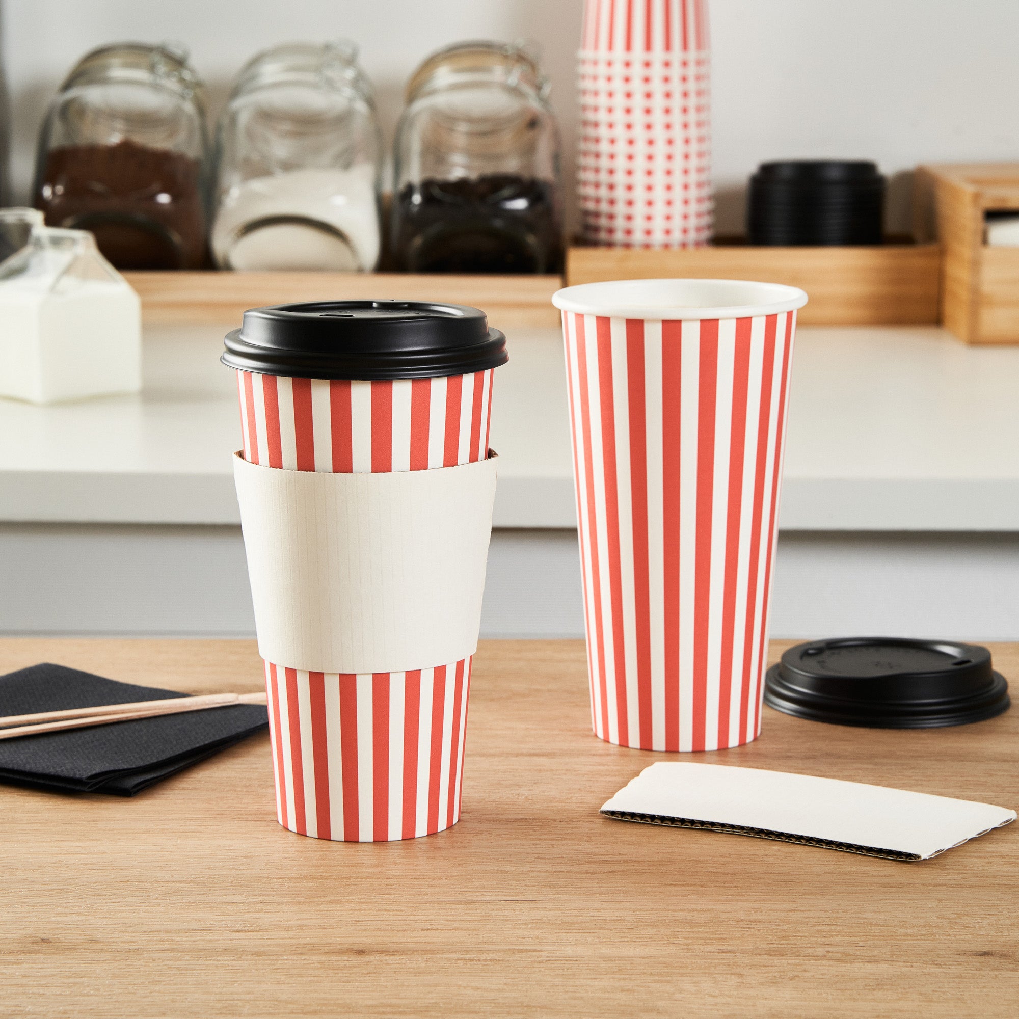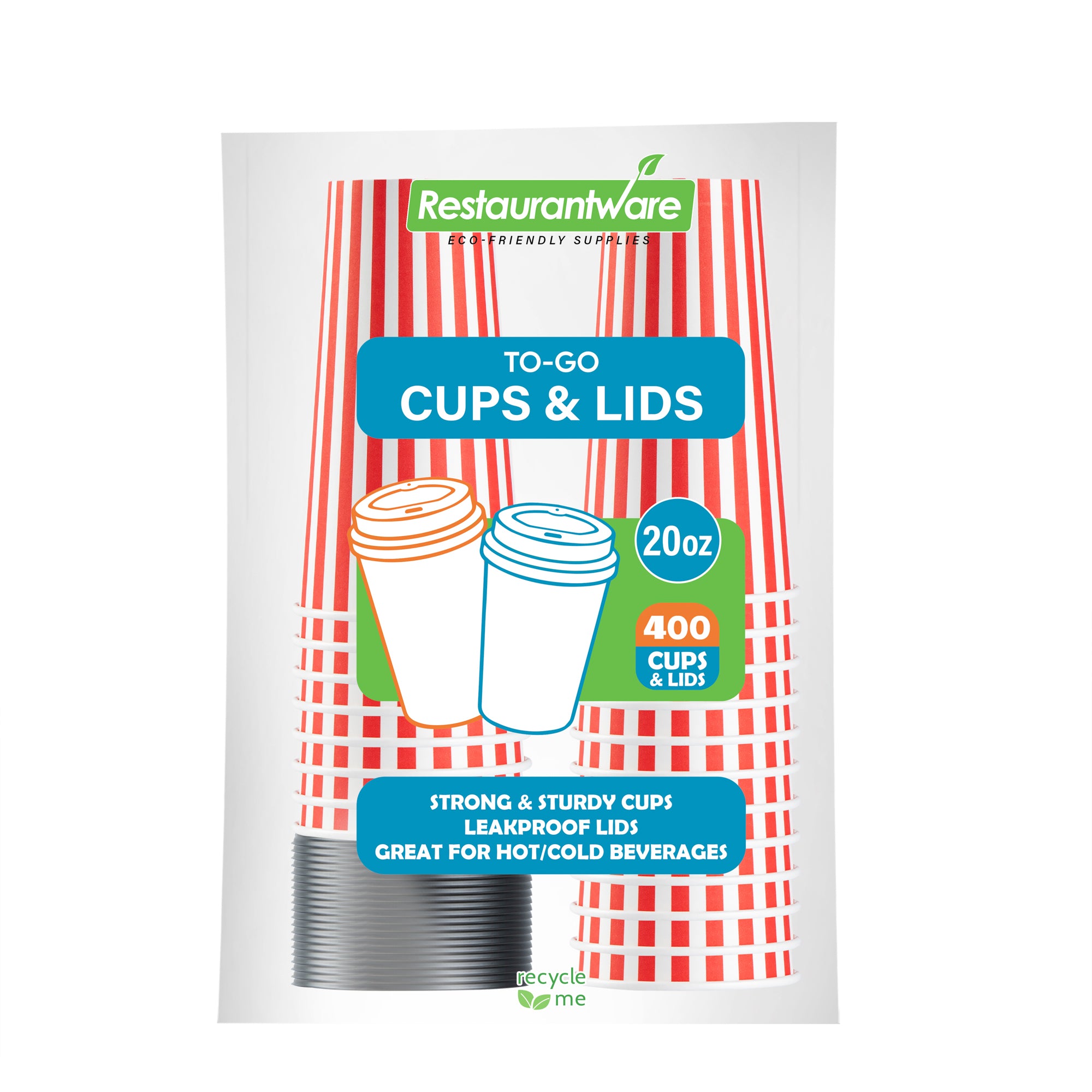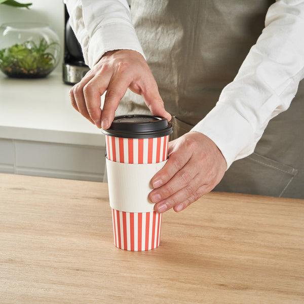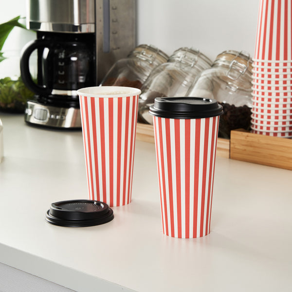 Serve your beverages in style with our Restpresso 20-ounce Red and White Stripe Paper Single Wall Coffee Cups. These paper coffee cups are greaseproof and feature a PE liner, ensuring your customers' beverages stay inside the cup without leakage. Ideal for hot or cold drinks, these disposable hot cups are single wall, providing a comfortable grip without the need for a sleeve. Sporting a charming red and white striped finish, these recyclable hot tea cups are perfect for coffee shops, cafes, or any establishment looking to add a touch of whimsy to their drinkware. The black lid and stackable design make these coffee cups convenient for on-the-go customers, while the rolled rim and leak-resistant seam ensure a secure fit and a pleasant drinking experience. Combine these coffee cups with our tailored cup sleeves crafted to intensify grip, ensuring fewer instances of accidental spills or slips. With a generous 20-ounce capacity, these striped coffee cups are perfect for satisfying your customers' thirst, and they measure 3.5 inches in diameter by 6.5 inches in height. Sold in a 400 count box. Sleeves are available and sold separately.