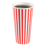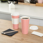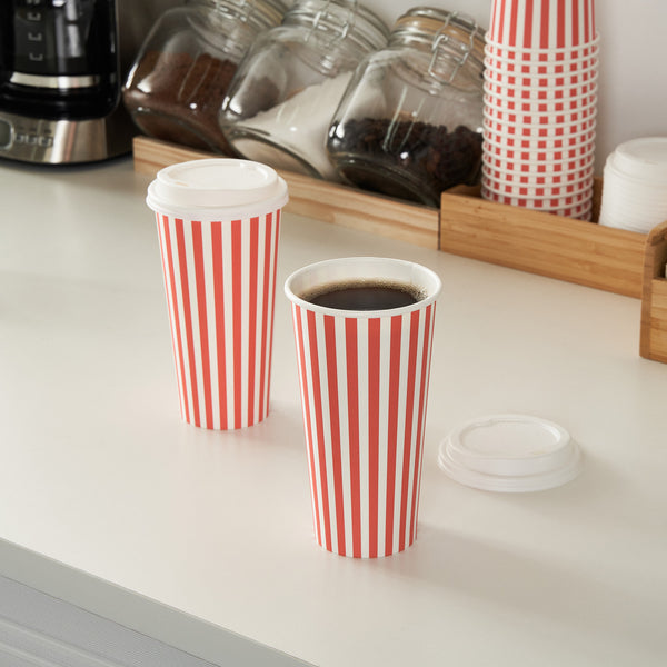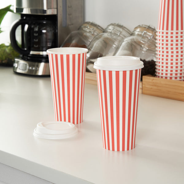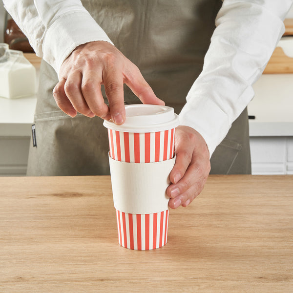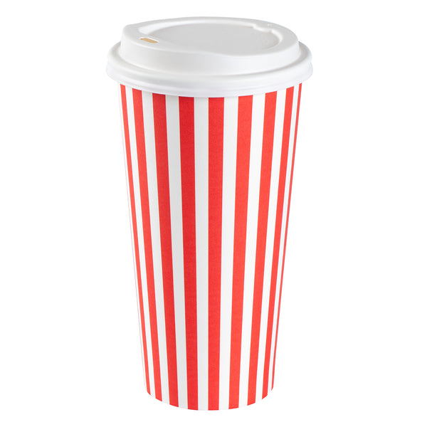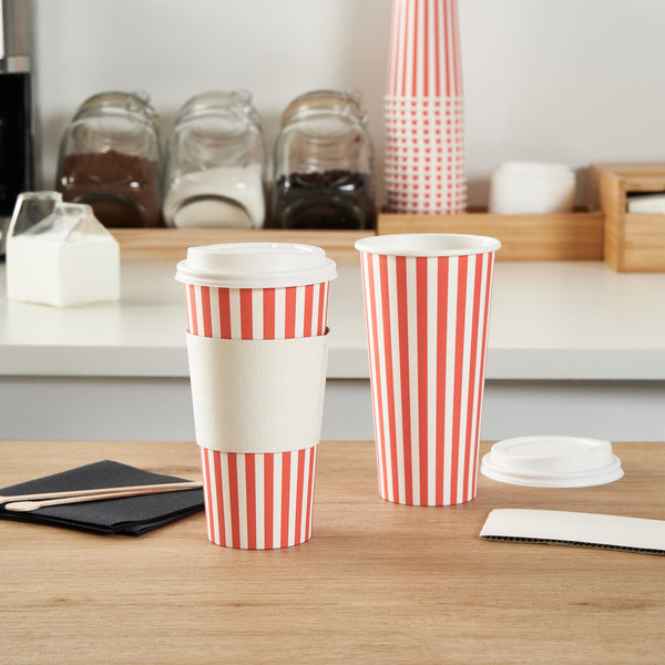 Serve your customers their favorite hot or cold beverages in our Restpresso 20-ounce Red and White Stripe Paper Single Wall Coffee Cups. The vibrant red and white striped design of these paper coffee cups adds a stylish flair to any cafe or restaurant setting. Crafted with a greaseproof PE liner, these disposable hot cups ensure maximum leak protection, enhancing the drinking experience for your customers. The rolled rim and leak-resistant seam ensure a secure fit with the included white lid, minimizing spills and maintaining the temperature of the beverages. These single wall coffee cups are suitable for hot and cold drinks, making them perfect for serving piping hot coffees, teas, and other warm beverages without compromising on comfort. Boasting a single-use design, these recyclable hot tea cups promote quick and easy cleanup, saving your staff valuable time and effort. These stackable coffee cups help to optimize space at your service counters. Connect these patterned coffee cups with our variety of sleeves, adding flair and heat security to your coffee routine. With a capacity of 20 ounces, these beverage cups are perfect for serving generous portions of beverages, while their dimensions of 3.5 inches in diameter by 6.5 inches in height ensure they fit comfortably in most cup holders. Sold in a 400 count box. Sleeves are available and sold separately.