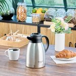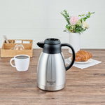 Maintain perfect serving temperatures with the Restpresso Insulated Coffee Carafe. Featuring double-wall insulation, this insulated coffee carafe ensures your beverages stay hot or cold for extended periods, enhancing the quality of your service. With a generous 51-ounce capacity, this thermal coffee server efficiently serves multiple guests without constant refills, making it an ideal choice for bustling breakfast buffets or catering events. The inclusion of regular and decaf brew-thru lids allows for easy coffee identification, streamlining your beverage service and boosting operational efficiency. Crafted from robust stainless steel, this stainless steel thermal carafe is designed for durability and can withstand daily use in demanding foodservice environments. Its ergonomic handle provides a comfortable grip, ensuring safe and spill-free pouring of hot drinks, which is crucial in busy settings. Elevate your coffee service with this indispensable addition to your beverage station. Each order includes 1 Restpresso Insulated Coffee Carafe.