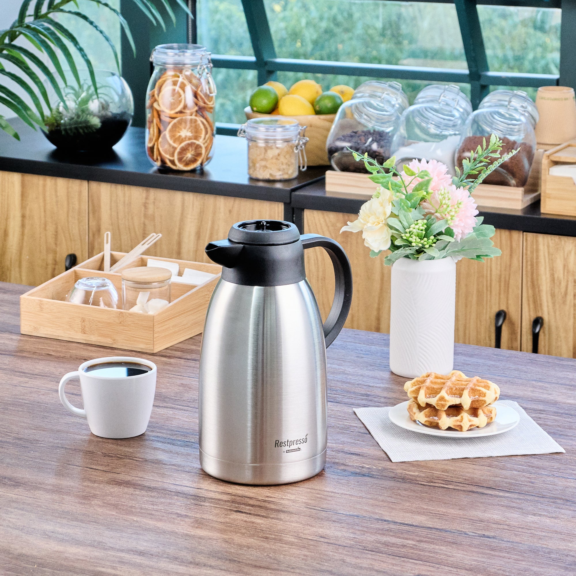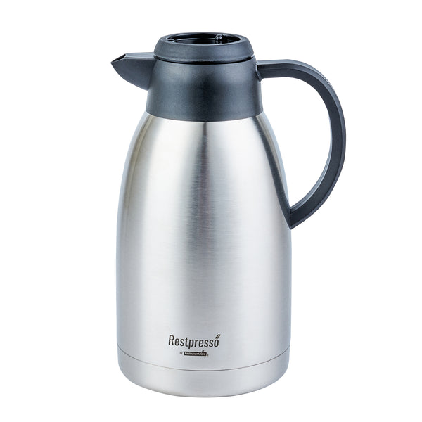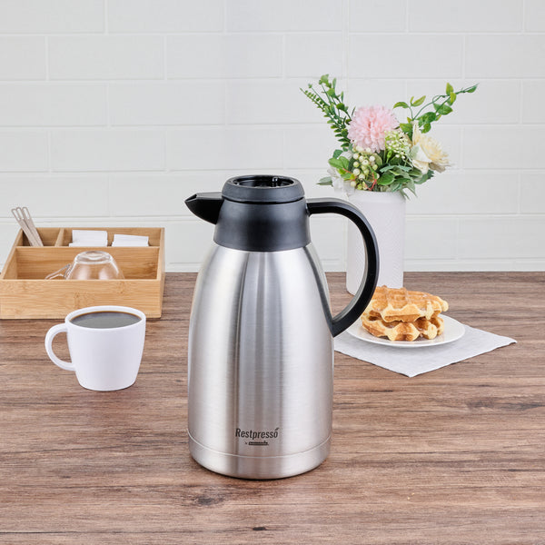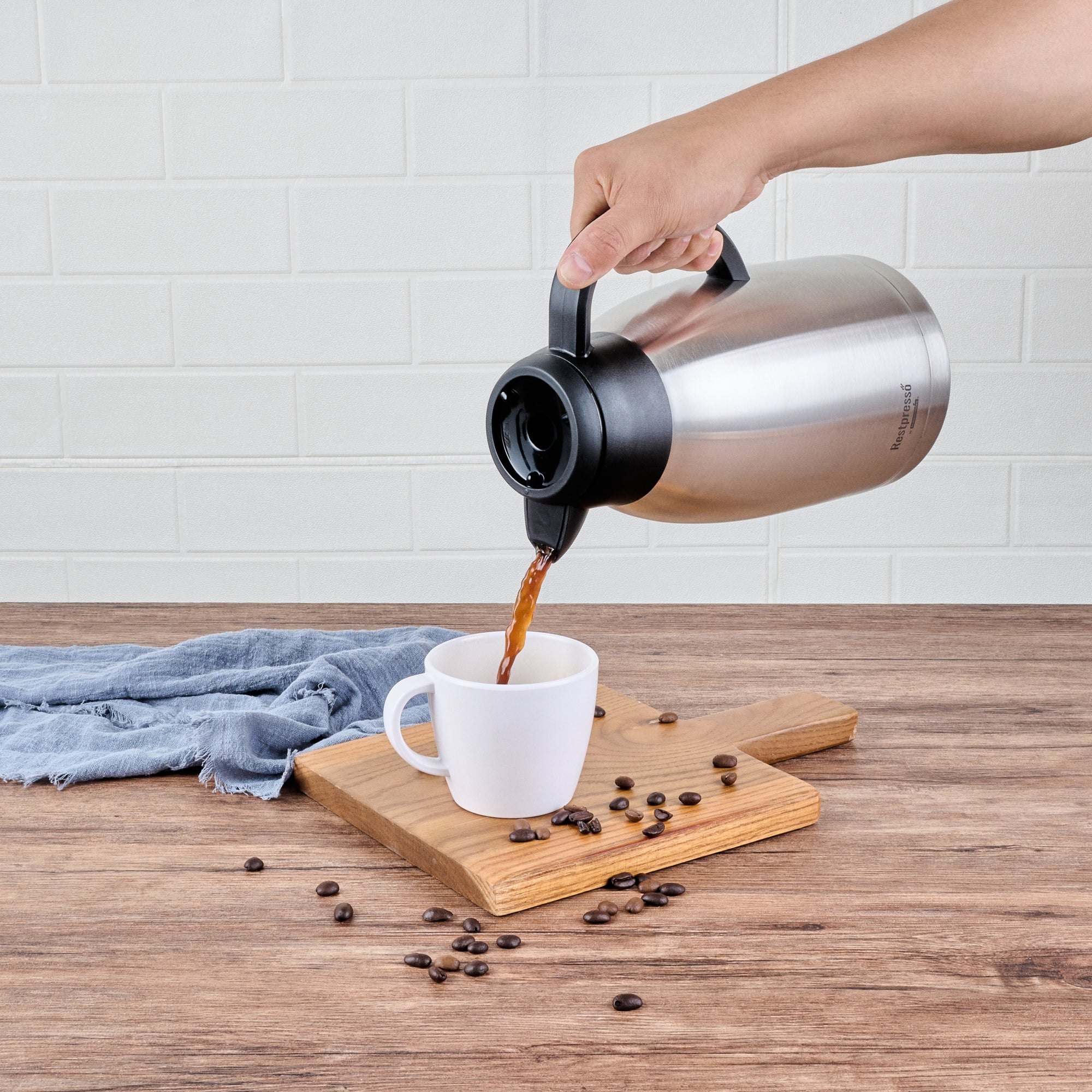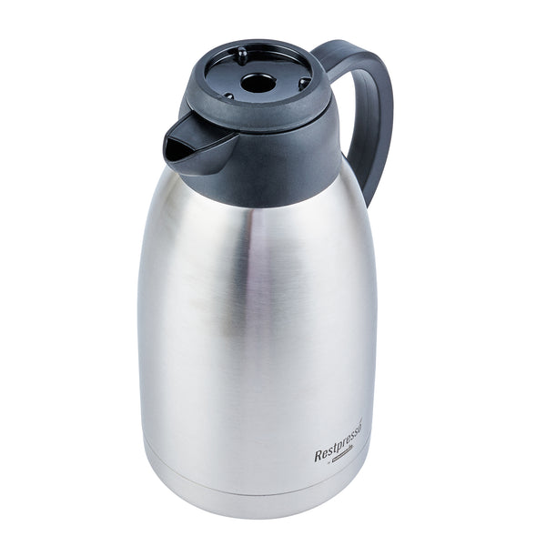 Ensure hot coffee stays ready to serve with our Restpresso Thermal Coffee Server. This insulated coffee carafe boasts a remarkable 68-ounce capacity, reducing the frequency of refills and enhancing efficiency during service. Crafted from durable stainless steel, it maintains beverages at optimal temperatures for extended periods, ensuring every cup is as satisfying as the first. The inclusion of regular and decaf brew-thru lids provides versatility and convenience, allowing seamless service without cross-contamination. Designed with an ergonomic handle, this stainless steel coffee server ensures safe and spill-free pouring, even in busy foodservice environments. Measuring 11.2 inches in length, 5.5 inches in width, and 7.1 inches in height, it fits effortlessly into any coffee station setup. Ideal for hotels, restaurants, and catering events, this thermal coffee server is a reliable choice for keeping your guests satisfied. Each order includes 1 Restpresso Thermal Coffee Server.