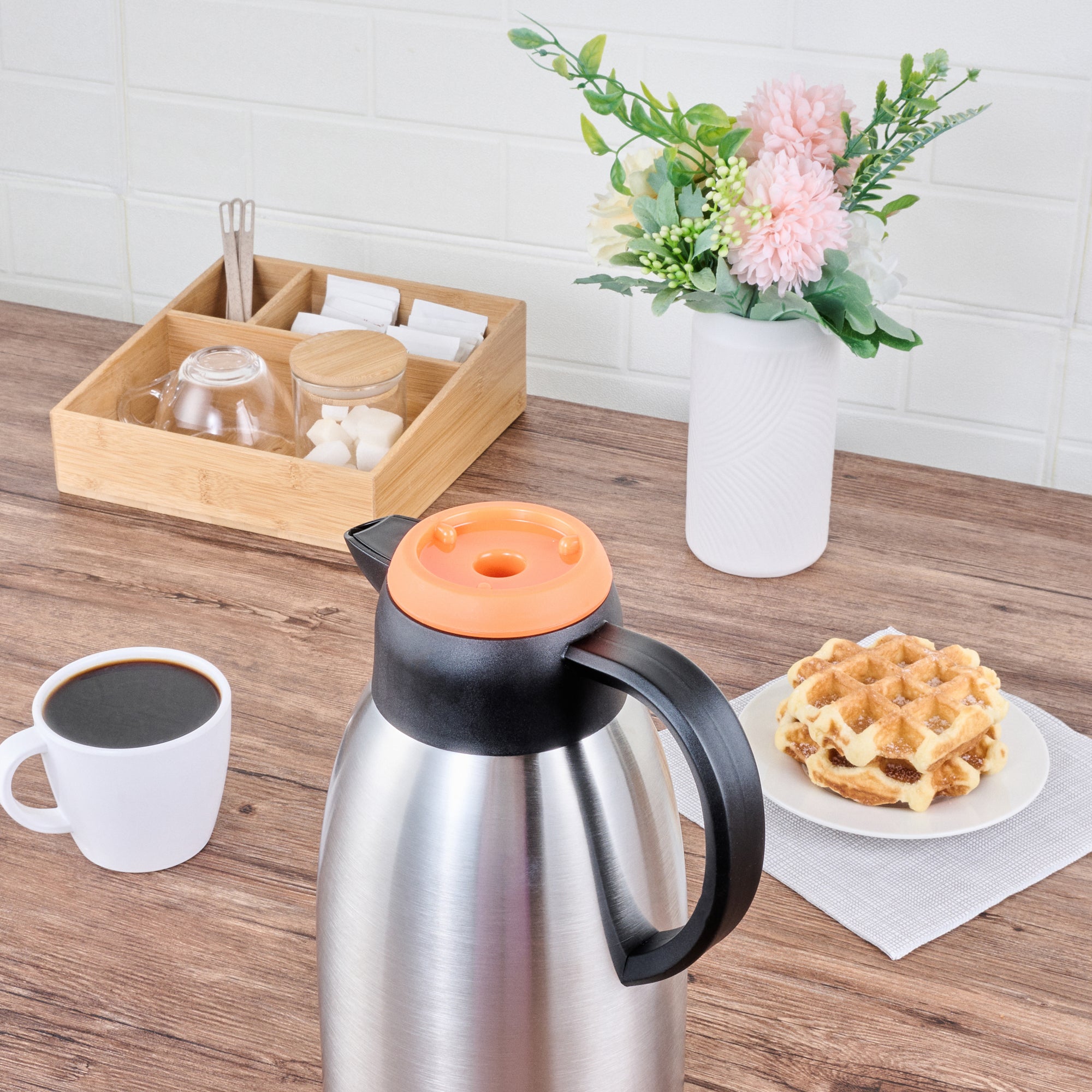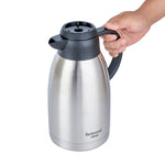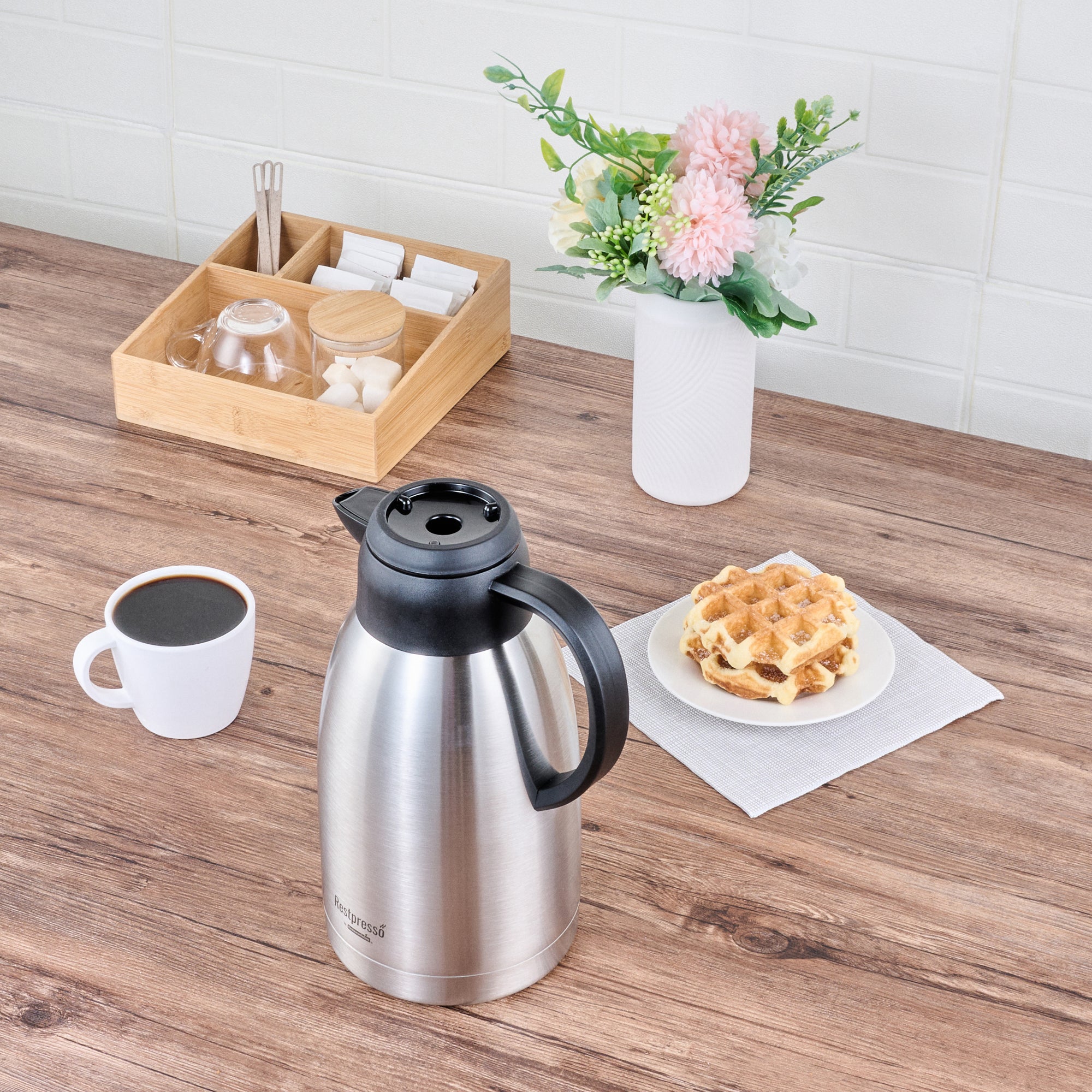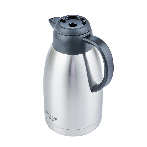 Ensure hot coffee stays ready to serve with our Restpresso Thermal Coffee Server. This insulated coffee carafe boasts a remarkable 68-ounce capacity, reducing the frequency of refills and enhancing efficiency during service. Crafted from durable stainless steel, it maintains beverages at optimal temperatures for extended periods, ensuring every cup is as satisfying as the first. The inclusion of regular and decaf brew-thru lids provides versatility and convenience, allowing seamless service without cross-contamination. Designed with an ergonomic handle, this stainless steel coffee server ensures safe and spill-free pouring, even in busy foodservice environments. Measuring 11.2 inches in length, 5.5 inches in width, and 7.1 inches in height, it fits effortlessly into any coffee station setup. Ideal for hotels, restaurants, and catering events, this thermal coffee server is a reliable choice for keeping your guests satisfied. Each order includes 1 Restpresso Thermal Coffee Server.
