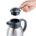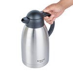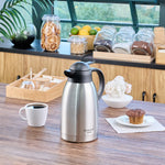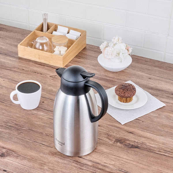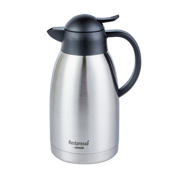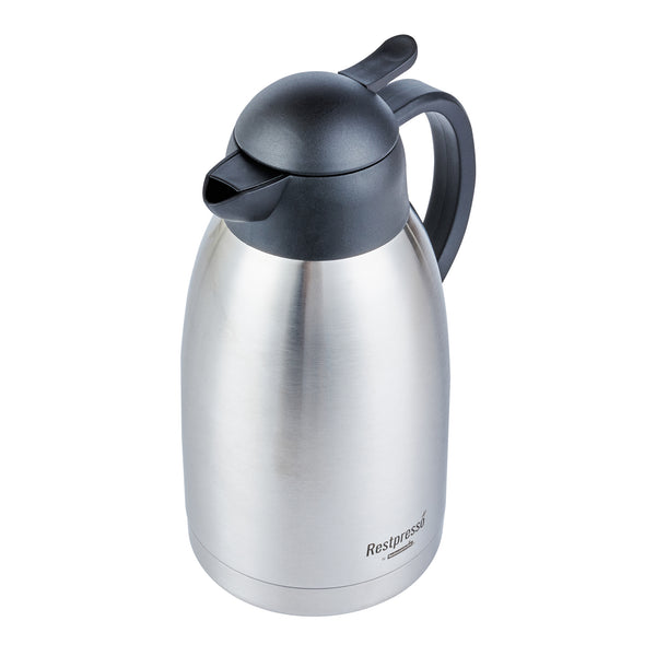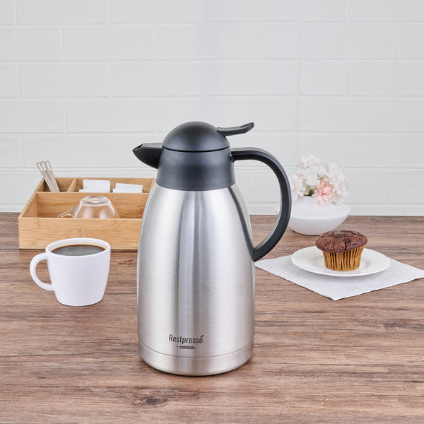 Maintain optimal beverage temperatures with ease. The Restpresso Vacuum Insulated Thermal Coffee Server is crafted from stainless steel and features advanced vacuum insulation to keep your coffee hot or iced tea cold for extended periods, making it the ideal thermal coffee server for busy cafes and restaurants. With a generous 68-ounce capacity, this vacuum insulated carafe allows you to serve multiple guests without frequent refills, enhancing your service efficiency. The double wall design of this large capacity coffee pot prevents condensation, ensuring your countertops remain spotless and slip-free. Its ergonomic handle and drip-free lid facilitate seamless pouring, providing a professional and efficient beverage service experience. Enhance your foodservice operation with this sleek, silver coffee server that is perfect for any dining setup. Each order includes 1 Restpresso Vacuum Insulated Thermal Coffee Server.