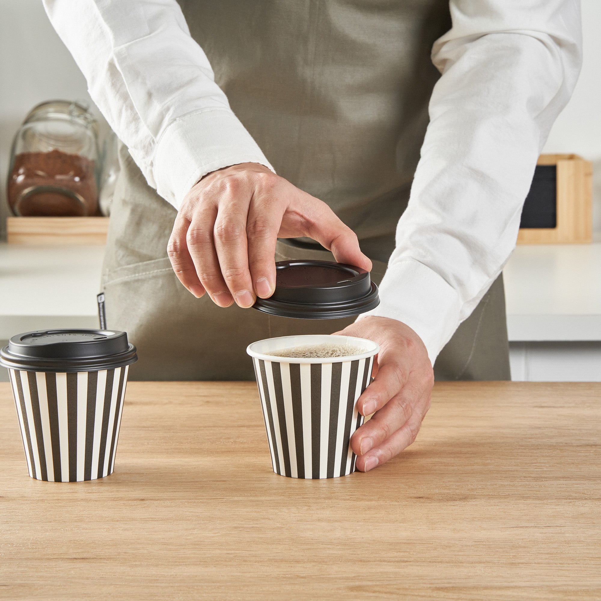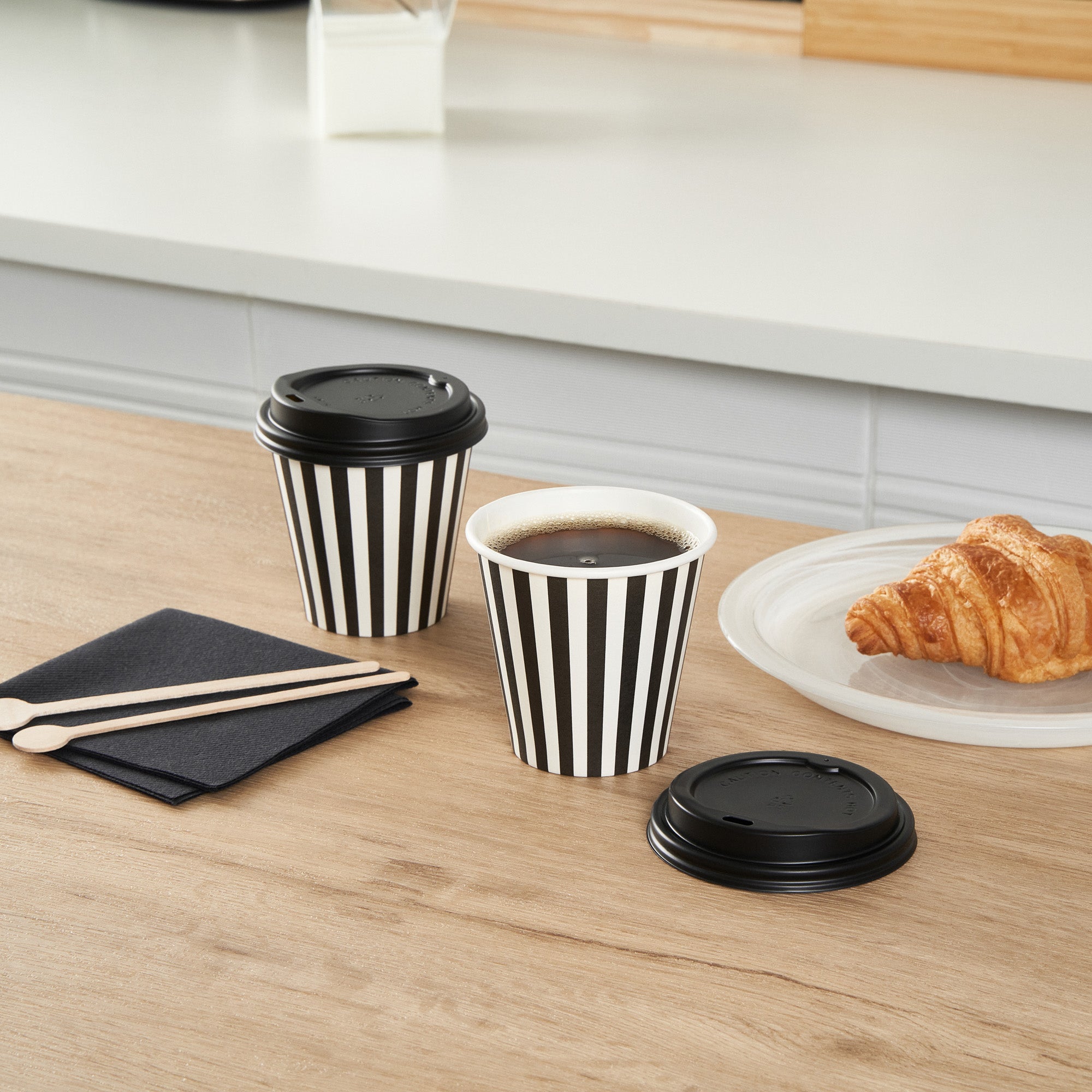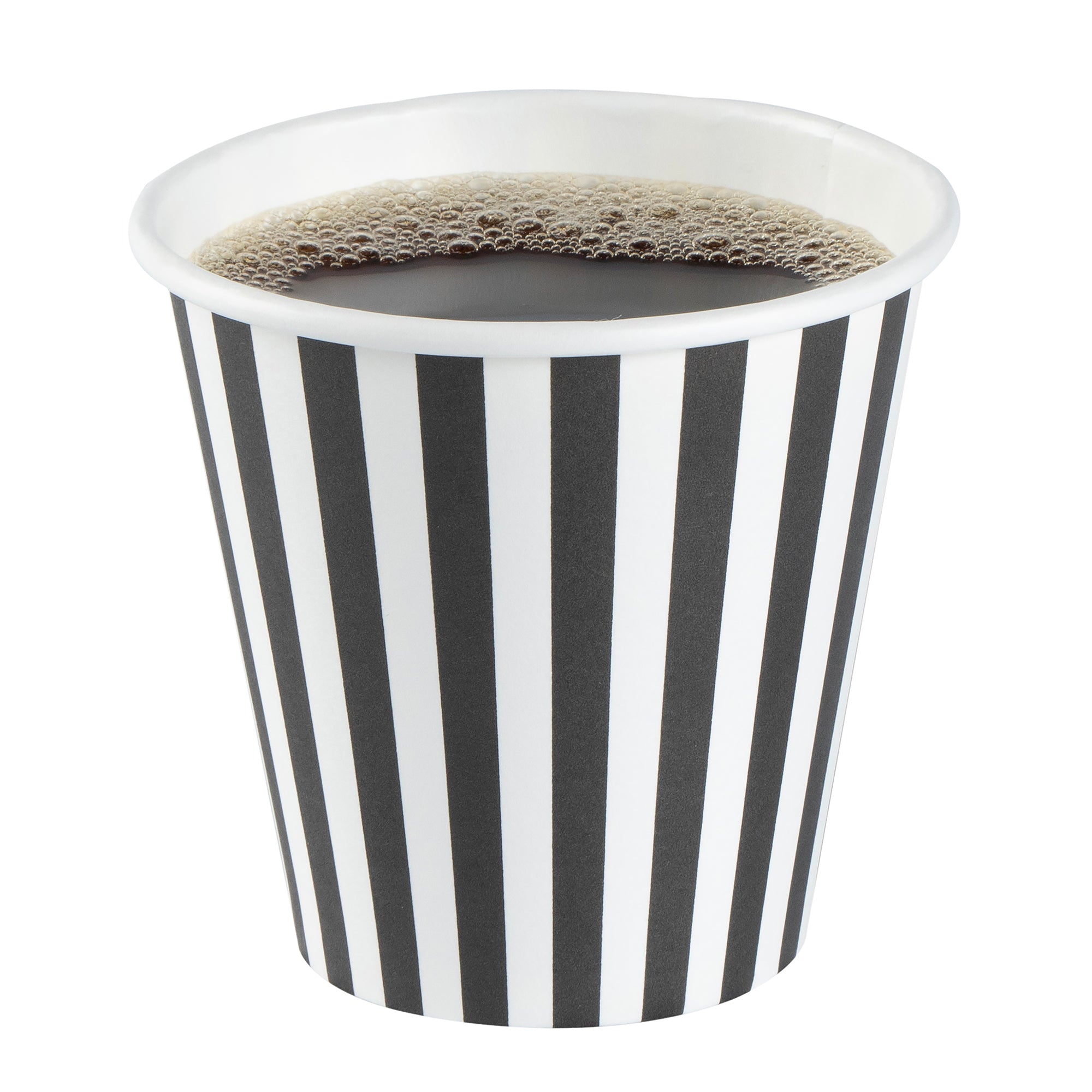 Start your day with our Restpresso 8-ounce Black and White Stripe Paper Single Wall Coffee Cups. Made from durable, single-use coffee cups, these vessels are designed to efficiently serve hot or cold beverages with ease. The greaseproof PE liner in these paper coffee cups ensures your favorite beverages remain contained and mess-free, making them an essential addition to any bustling coffee shop or cafe. With a unique black and white striped finish, these disposable hot cups add a touch of style to your beverage service while also making a bold statement. Designed for convenience, these single wall coffee cups come with a black lid, providing an extra layer of protection against accidental spills. Plus, the rolled rim and leak-resistant seam of these disposable coffee cups ensure every sip is a pleasure, without any unexpected drips or leaks. These paper coffee cups, with a capacity of 8 ounces, are perfect for serving standard servings of coffee, tea, or any other preferred beverage. Easy to store, these stackable coffee cups are a space-saving solution for your business. Pair up these premium-quality coffee cups with our versatile sleeve collection, ensuring a luxurious and comfortable hold. With dimensions of 3.5 inches in diameter by 3.5 inches in height, these recyclable hot tea cups are perfectly sized to fit in car cup holders and coffee machines. Sold in a 20 count box. Sleeves are available and sold separately.