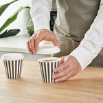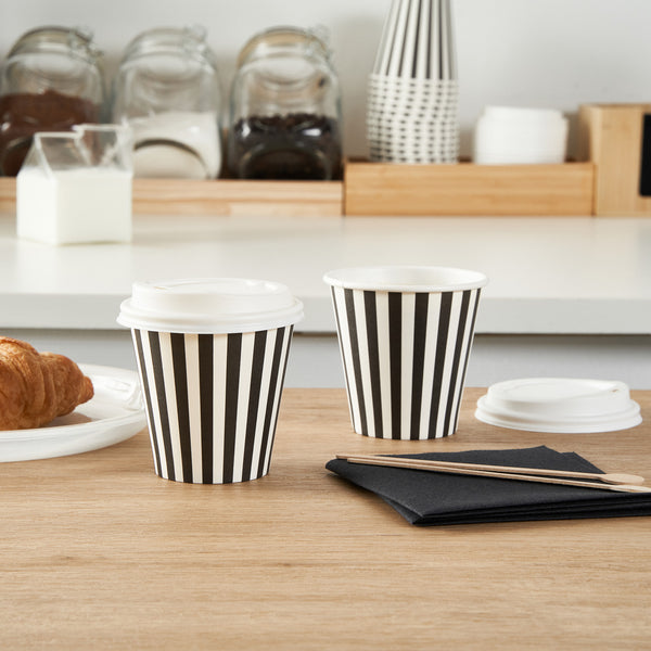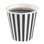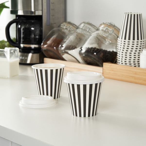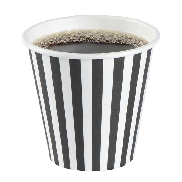 Upgrade your beverage service with our Restpresso 8-ounce Black and White Stripe Paper Single Wall Coffee Cups. Designed to impress, these paper coffee cups feature an eye-catching black and white striped finish that adds a touch of sophistication to your coffee shop, cafe, or food truck. Constructed with a greaseproof PE liner, these disposable hot cups avert leaks and maintain the freshness of your beverages. These single wall coffee cups come with a leakproof white lid and are perfect for serving hot or cold drinks, ensuring your customers can enjoy their favorite beverages. These stackable coffee cups help save valuable storage space while promoting organization in your establishment. The rolled rim of these single-use coffee cups ensures a comfortable drinking experience, while the leak-resistant seam minimizes any accidental spills. Match these coffee cups with our assortment of sleeves designed to shield your hands from the heat of a hot drink. Boasting an 8-ounce capacity and measuring 3.5 inches in diameter by 4.25 inches in height, these recyclable coffee cups are the perfect size for serving small-sized beverages to your on-the-go customers. Sold in a 20 count box. Sleeves are available and sold separately.
