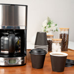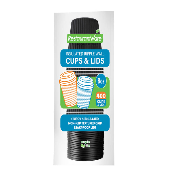 Enhance beverage service efficiency with insulated, spill-resistant coffee cups. Restpresso 8 oz Black Paper Ripple Wall Coffee Cups with Lids seamlessly blend functionality and style, designed to maintain optimal beverage temperature with their Black Ripple Wall design. These disposable coffee cups with lids provide a secure closure to prevent spills, making them ideal for busy cafés and coffee shops focused on customer satisfaction. The sleek black ripple coffee cups offer a modern, professional appearance that enhances brand presentation while the recyclable material supports eco-friendly service operations, appealing to sustainability-conscious consumers. Measuring 3.6 inches by 3.6 inches by 4.1 inches, these 8 oz paper coffee cups are the perfect size for standard coffee servings, catering to a wide range of customer preferences. Experience the convenience and reliability of these expertly crafted coffee cups. Sold in a 400 count box.