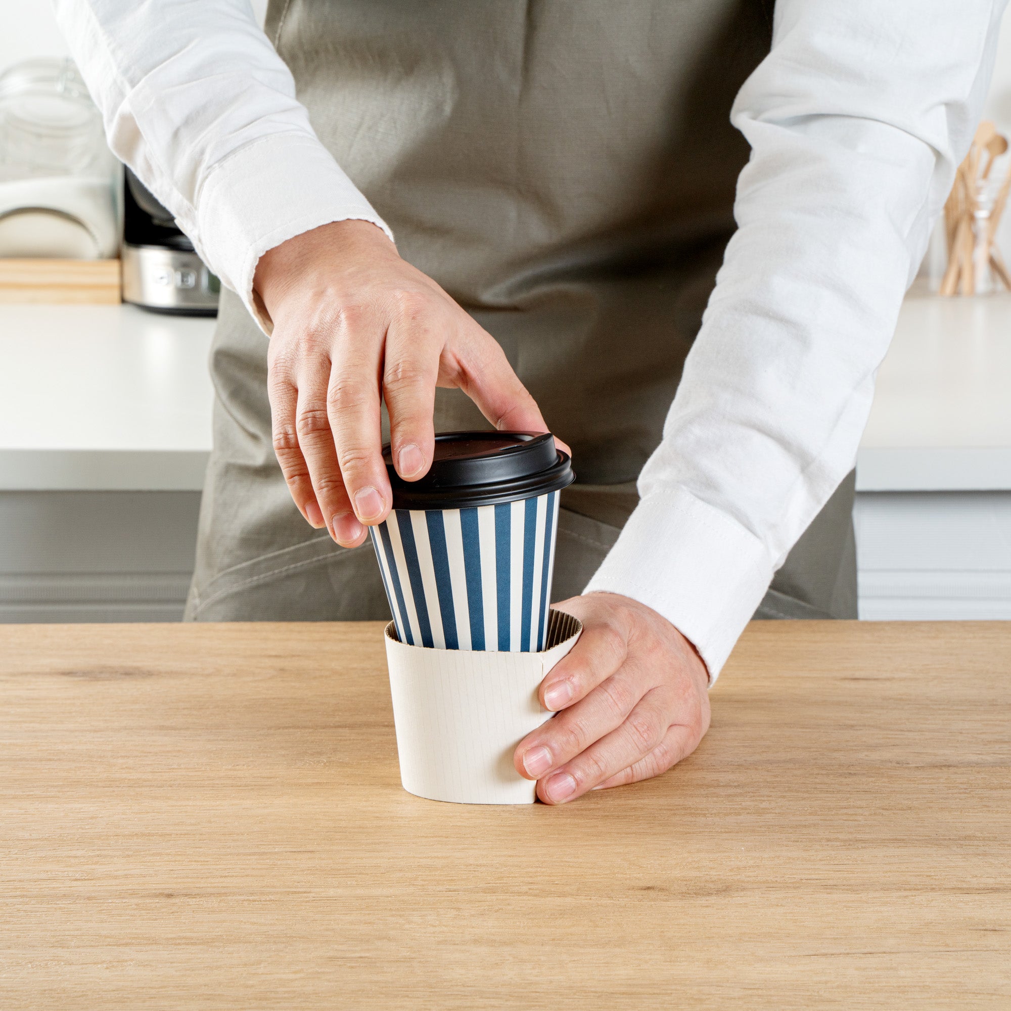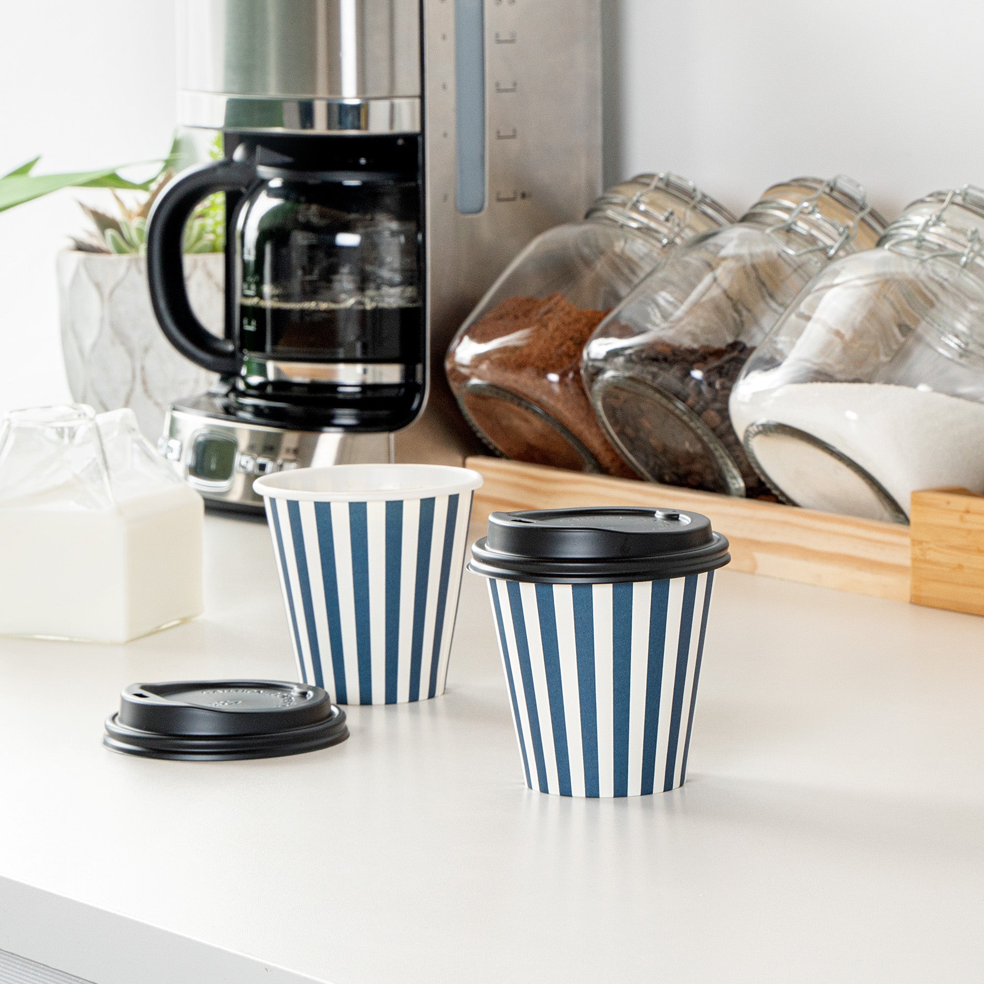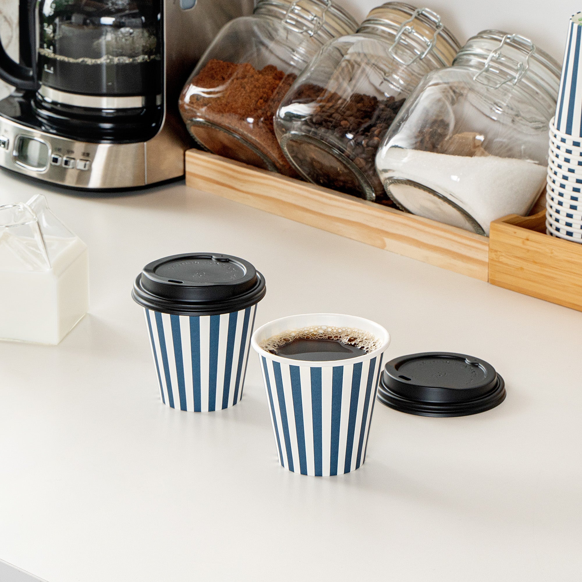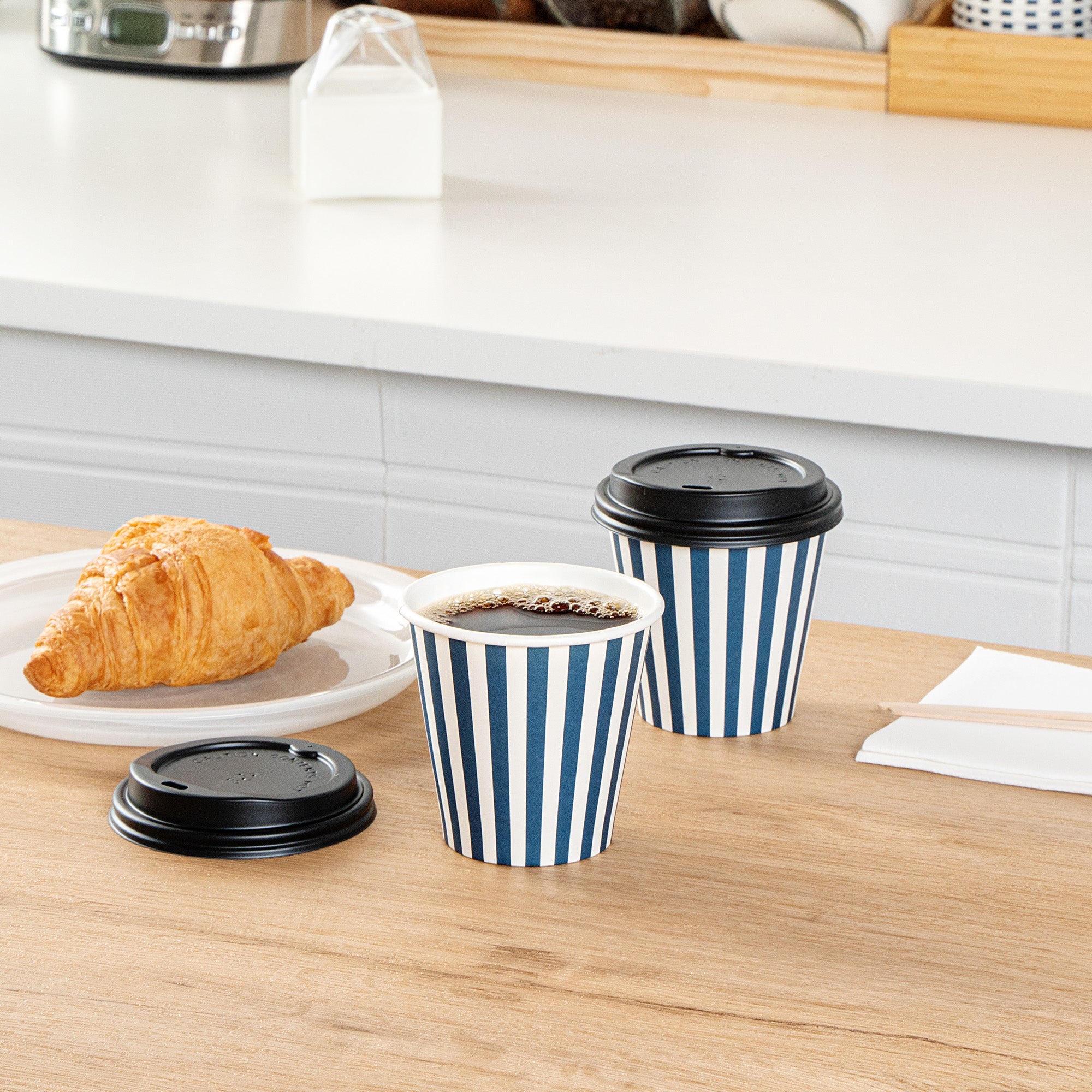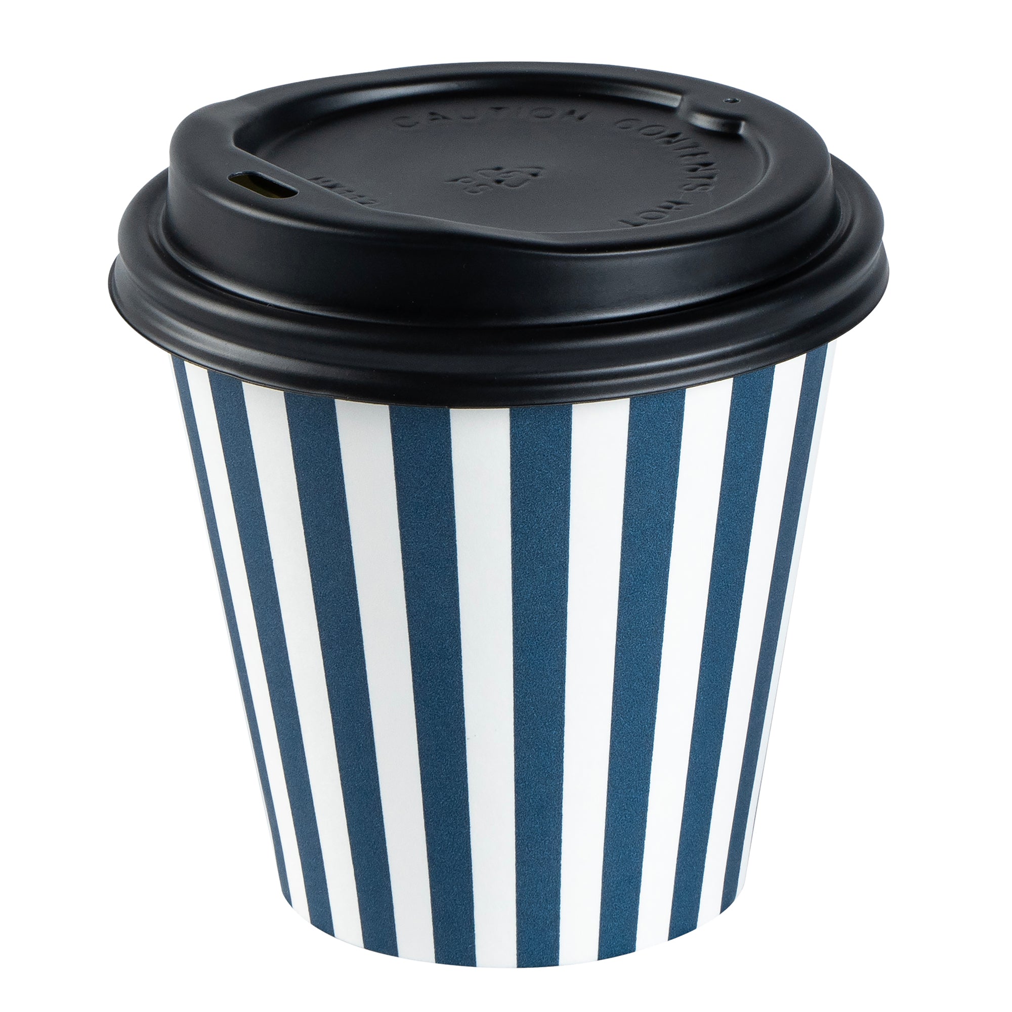 Serve delicious hot beverages in style with our Restpresso 8-ounce Blue and White Stripe Paper Single Wall Coffee Cups. These paper coffee cups are designed with a greaseproof PE liner that averts leaks. Crafted for convenience, these disposable hot cups come with a black lid, perfect for sipping on the go. These single wall coffee cups are suitable for both hot and cold drinks. With an eye-catching blue and white striped finish, these disposable coffee cups add a vibrant touch to your beverage service. Plus, these coffee cups have a rolled rim and leak-resistant seam, ensuring a comfortable drinking experience. Match these sleek and ergonomic coffee cups with our lineup of sleeves, offering both style and heat protection. Measuring 3.5 inches in diameter by 3.5 inches in height, these 8-ounce cups are the perfect size for serving medium-sized beverages. Sold in a 20 count box. Sleeves are available and sold separately.
