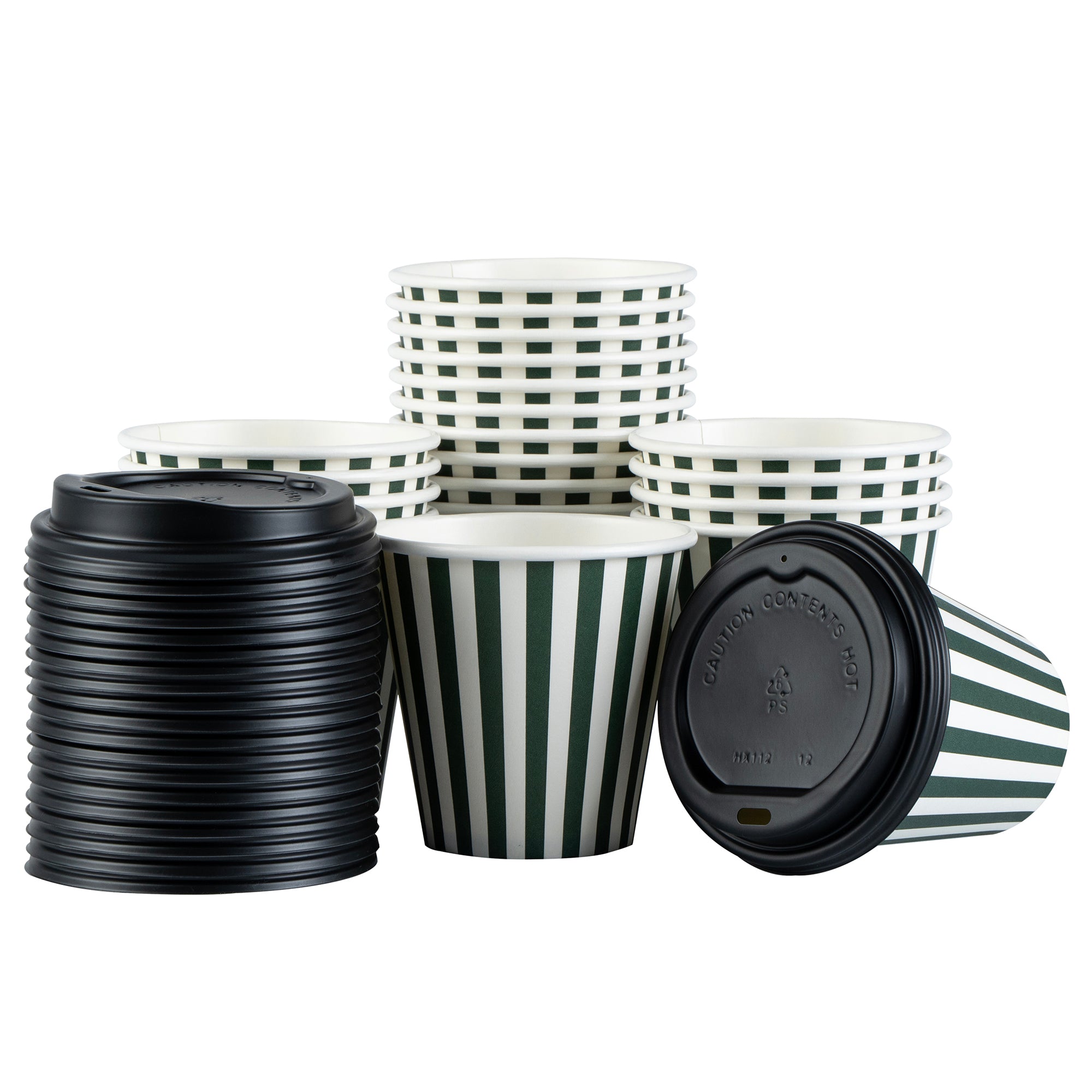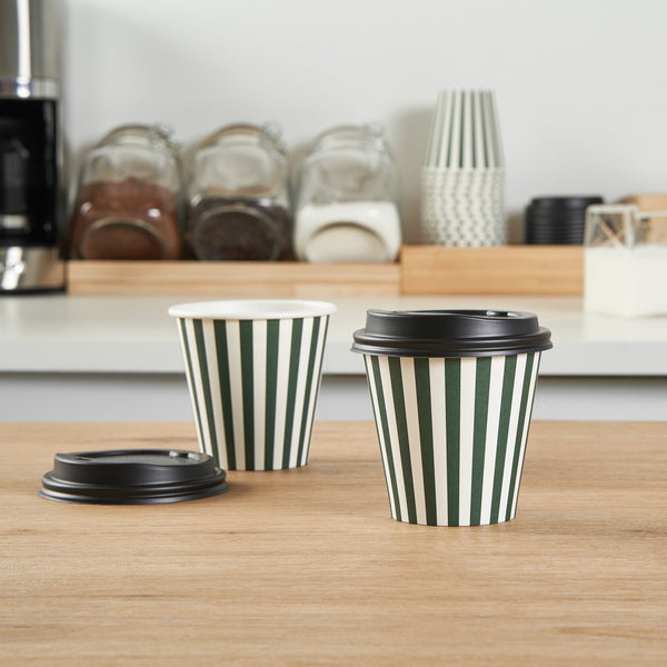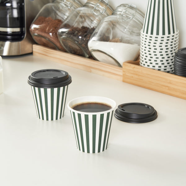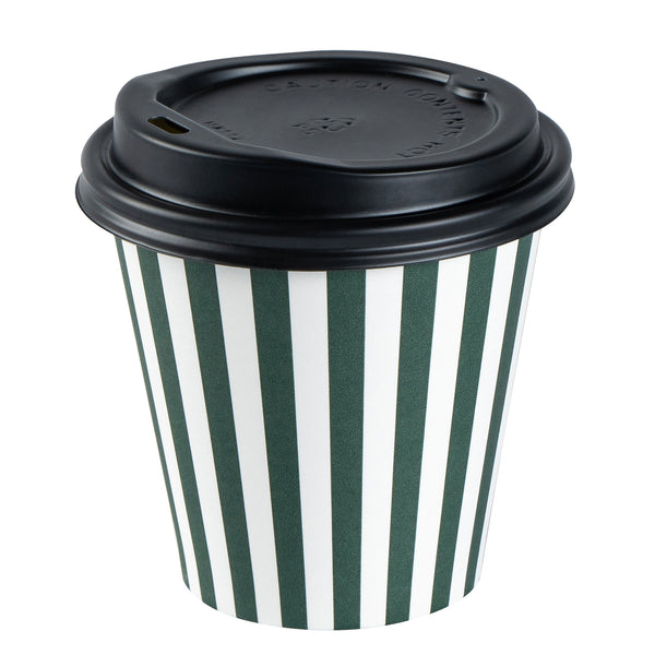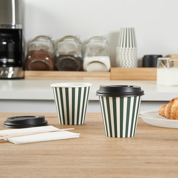 Serve up your signature hot or cold beverages easily using our Restpresso 8-ounce Forest Green and White Stripe Paper Single Wall Coffee Cups. These paper coffee cups, featuring a stylish forest green and white striped finish, will add a touch of elegance to your coffee service while ensuring a comfortable hold for your customers. Designed with a single-wall construction, these disposable coffee cups are suitable for all kinds of beverages. These single-use coffee cups feature a leak-resistant seam and rolled rim that ensures mess-free sipping and is perfect for on-the-go customers. Stackability is another notable feature of these paper drinking cups, making storage and transport a breeze. Included with a black lid and a greaseproof PE liner, these beverage cups reduce leaks and spills. Couple these whimsical coffee cups with our diverse sleeve options, adding a touch of fantasy to your coffee enjoyment. With a capacity of 8 ounces and dimensions of 3.5 inches in diameter by 3.5 inches in height, these recyclable hot tea cups are just the right size for all your beverages. Sold in a 20 count box. Sleeves are available and sold separately.