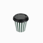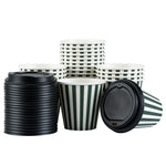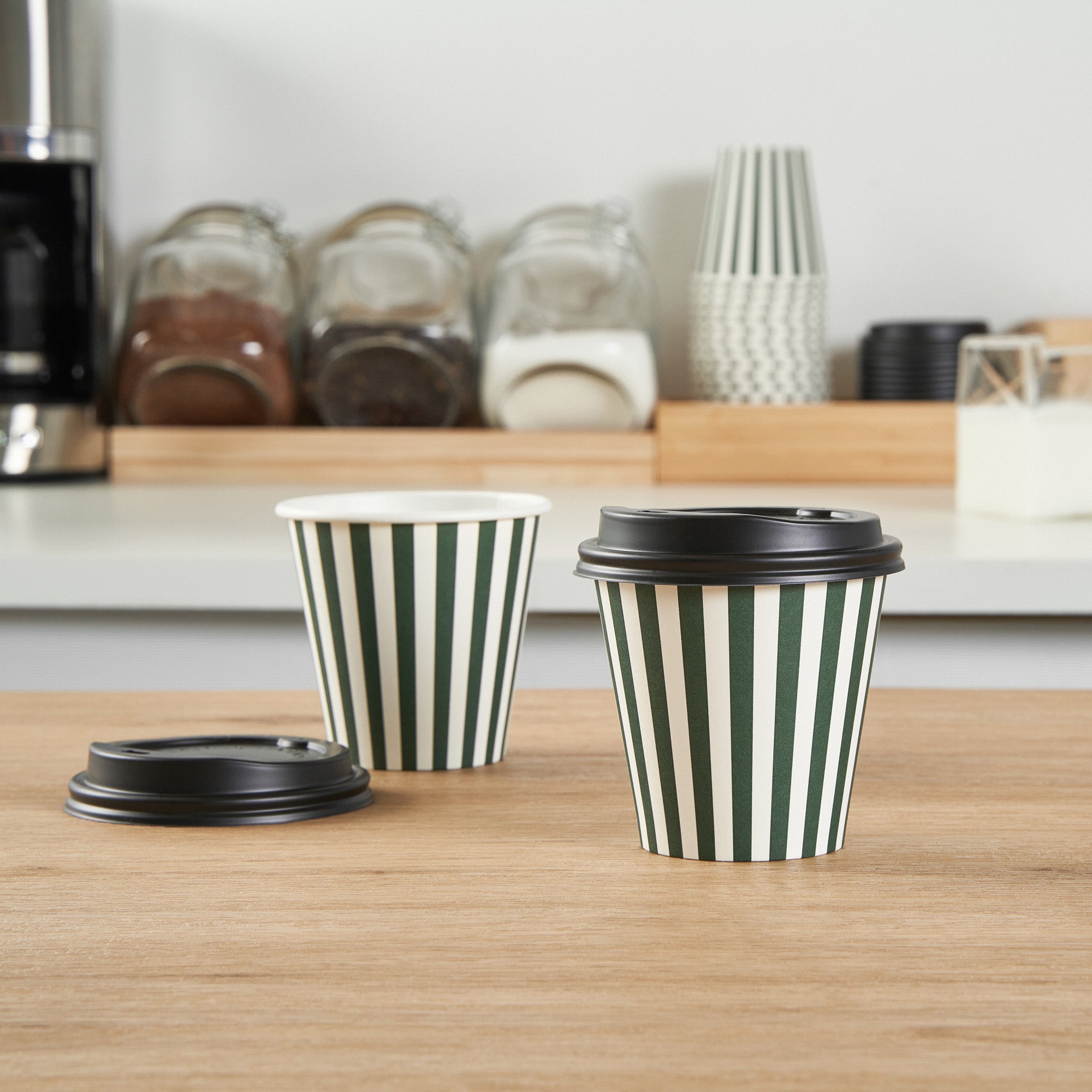 Serve up your signature hot or cold beverages easily using our Restpresso 8-ounce Forest Green and White Stripe Paper Single Wall Coffee Cups. These paper coffee cups, featuring a stylish forest green and white striped finish, will add a touch of elegance to your coffee service while ensuring a comfortable hold for your customers. Designed with a single-wall construction, these disposable coffee cups are suitable for all kinds of beverages. These single-use coffee cups feature a leak-resistant seam and rolled rim that ensures mess-free sipping and is perfect for on-the-go customers. Stackability is another notable feature of these paper drinking cups, making storage and transport a breeze. Included with a black lid and a greaseproof PE liner, these beverage cups reduce leaks and spills. Couple these whimsical coffee cups with our diverse sleeve options, adding a touch of fantasy to your coffee enjoyment. With a capacity of 8 ounces and dimensions of 3.5 inches in diameter by 3.5 inches in height, these recyclable hot tea cups are just the right size for all your beverages. Sold in a 400 count box. Sleeves are available and sold separately.