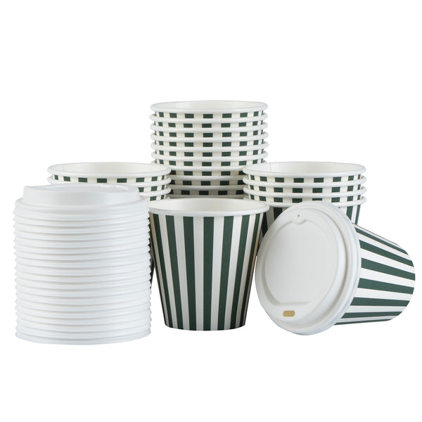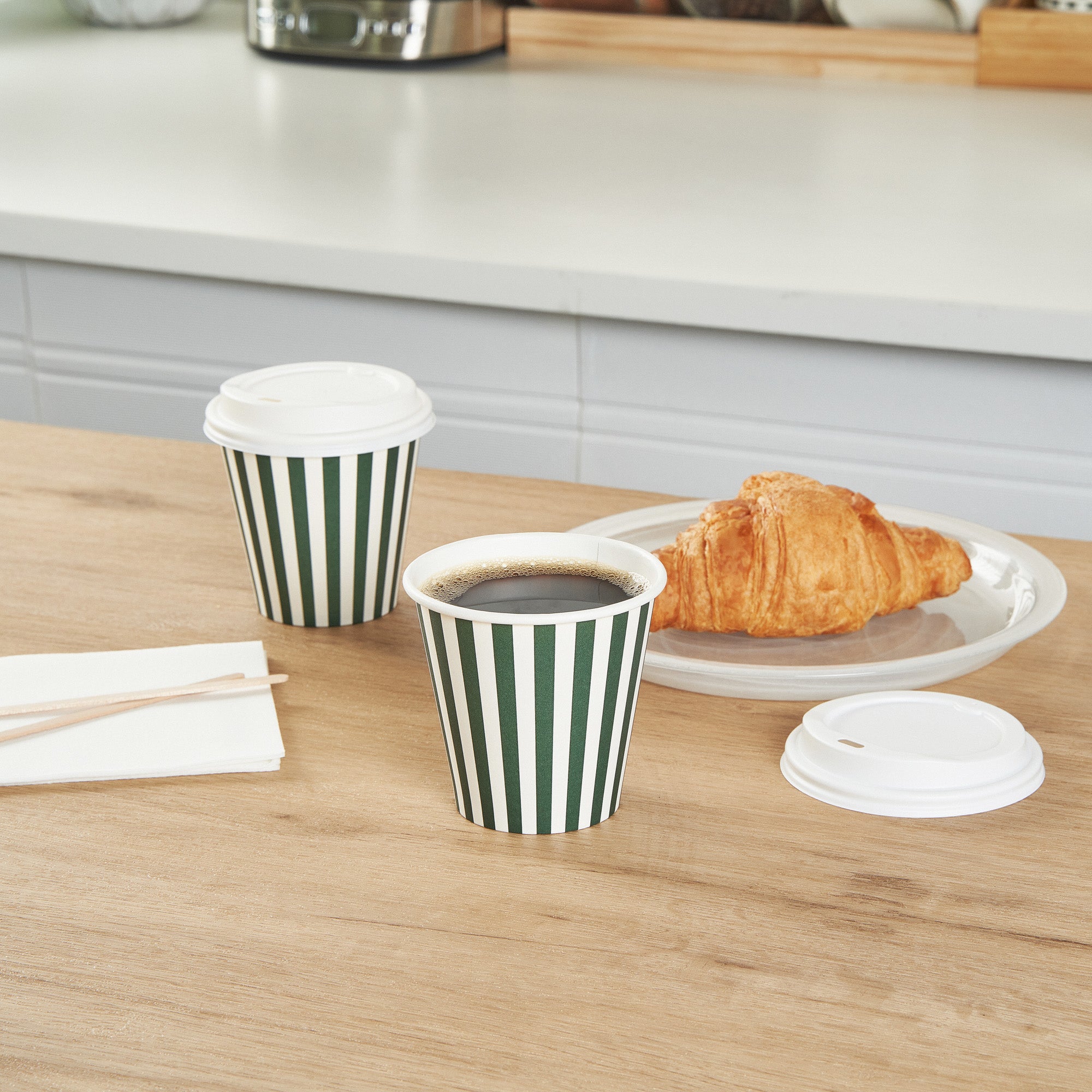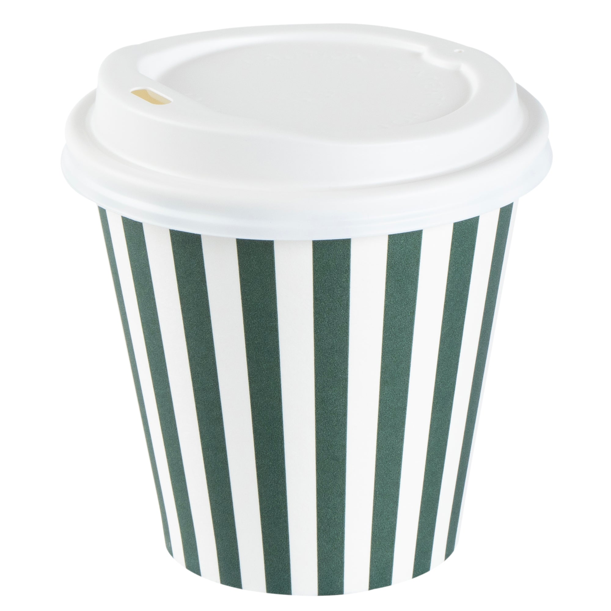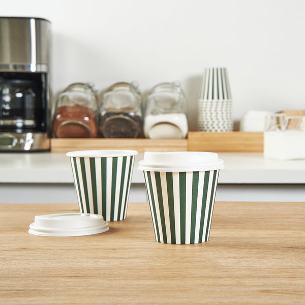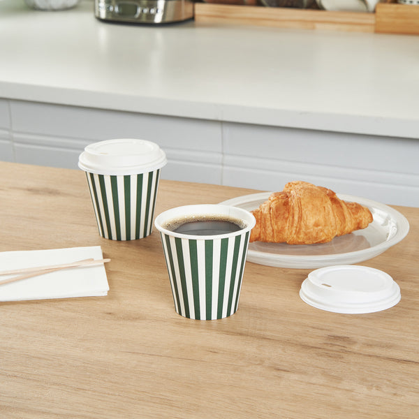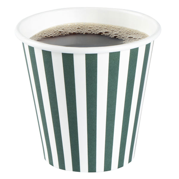 Savor the joy of serving your hot beverages in our Restpresso 8-ounce Forest Green and White Stripe Paper Single Wall Coffee Cups. These paper coffee cups, with their striking forest green and white stripe design, will make a lasting impression on your customers. Perfect for both hot and cold beverages, these disposable hot cups are versatile and practical, serving a variety of needs within the foodservice industry. Built with a greaseproof PE liner, these single wall coffee cups avert leaks and spills, ensuring a comfortable coffee experience for your patrons. These coffee cups are also designed with a rolled rim, providing a comfortable drinking experience and a secure lid fit that comes with them. Uniquely crafted, these single-use coffee cups can hold all kinds of beverages. Match up these stylish coffee cups with our array of protective sleeves designed to keep your hands cool while enjoying your hot drink. With a capacity of 8-ounce, these paper coffee cups are the ideal size for serving premium coffee, lattes, or teas, and their dimensions of 3.5 inches in diameter by 4.25 inches in height make them easy to hold and enjoy. Sold in a 20 count box. Sleeves are available and sold separately.