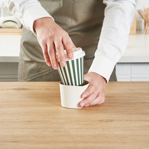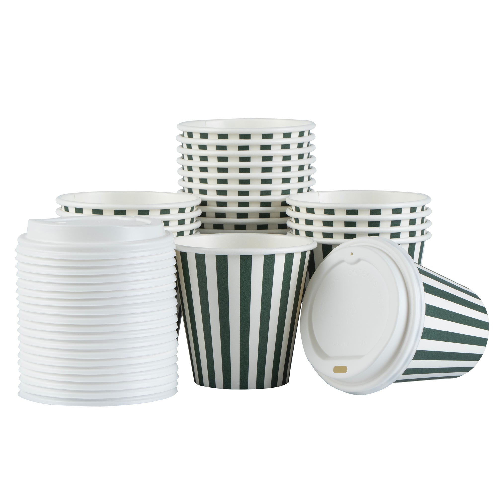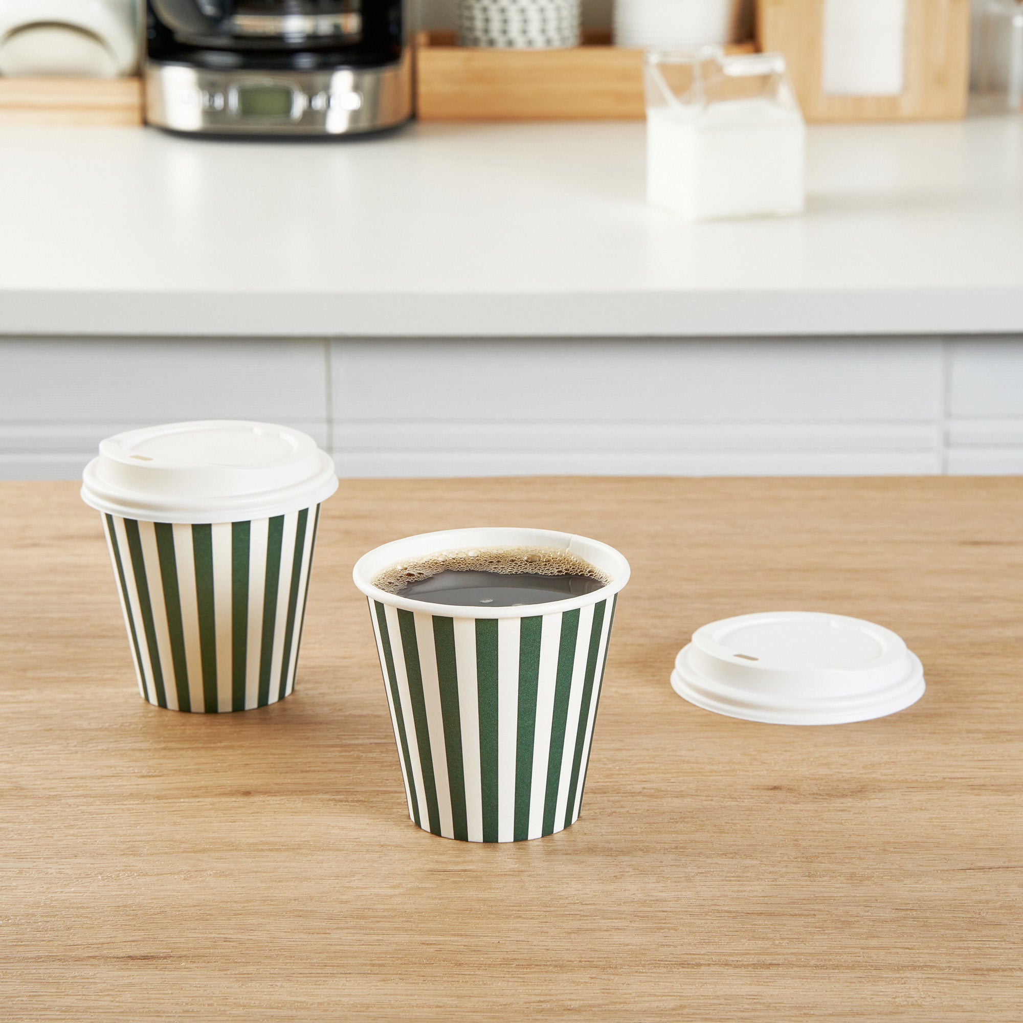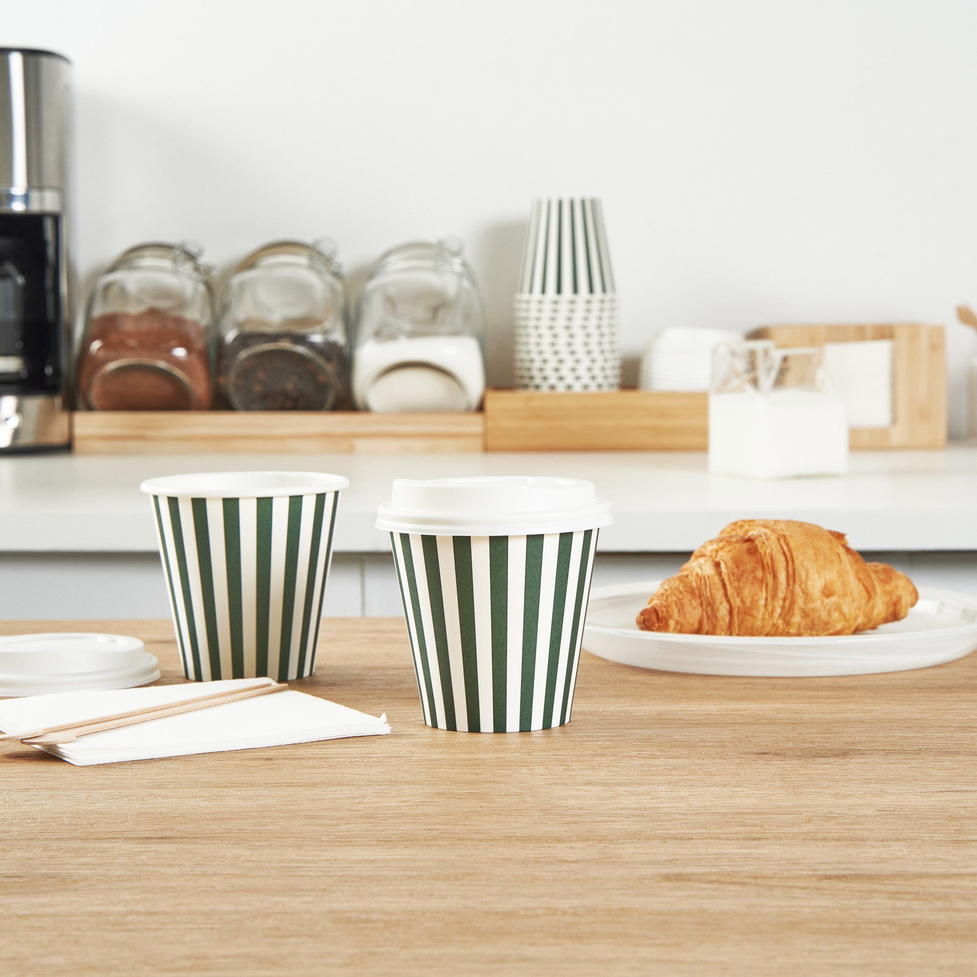 Savor the joy of serving your hot beverages in our Restpresso 8-ounce Forest Green and White Stripe Paper Single Wall Coffee Cups. These paper coffee cups, with their striking forest green and white stripe design, will make a lasting impression on your customers. Perfect for both hot and cold beverages, these disposable hot cups are versatile and practical, serving a variety of needs within the foodservice industry. Built with a greaseproof PE liner, these single wall coffee cups avert leaks and spills, ensuring a comfortable coffee experience for your patrons. These coffee cups are also designed with a rolled rim, providing a comfortable drinking experience and a secure lid fit that comes with them. Uniquely crafted, these single-use coffee cups can hold all kinds of beverages. Match up these stylish coffee cups with our array of protective sleeves designed to keep your hands cool while enjoying your hot drink. With a capacity of 8-ounce, these paper coffee cups are the ideal size for serving premium coffee, lattes, or teas, and their dimensions of 3.5 inches in diameter by 4.25 inches in height make them easy to hold and enjoy. Sold in a 20 count box. Sleeves are available and sold separately.