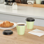 Start your day on a high note with our Restpresso 8-ounce Green and White Stripe Paper Single Wall Coffee Cups. Featuring a greaseproof PE liner, these paper coffee cups ensure an unsoiled and enjoyable drinking experience. Add a touch of style to your beverage service with their unique green and white striped finish, turning every sip into a visual delight. Crafted for convenience, these disposable hot cups come with a black lid, minimizing spills and keeping your drink hot for longer. Boasting a single wall design, these stackable coffee cups offer the perfect balance between durability and insulation, keeping your beverages at the right temperature. For hot and cold drinks, these single-use coffee cups are versatile, catering to all your beverage needs. With a rolled rim and leak-resistant seam, these recyclable hot tea cups ensure a comfortable and secure grip, providing a comfortable coffee experience. Connect these coffee cups with our variety of sleeves, offering both personality and heat protection for your drink. With a capacity of 8 ounces, these disposable coffee cups measure 3.5 inches in diameter by 3.5 inches in height, perfect for on-the-go customers. Sold in a 20 count box. Sleeves are available and sold separately.