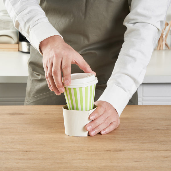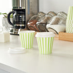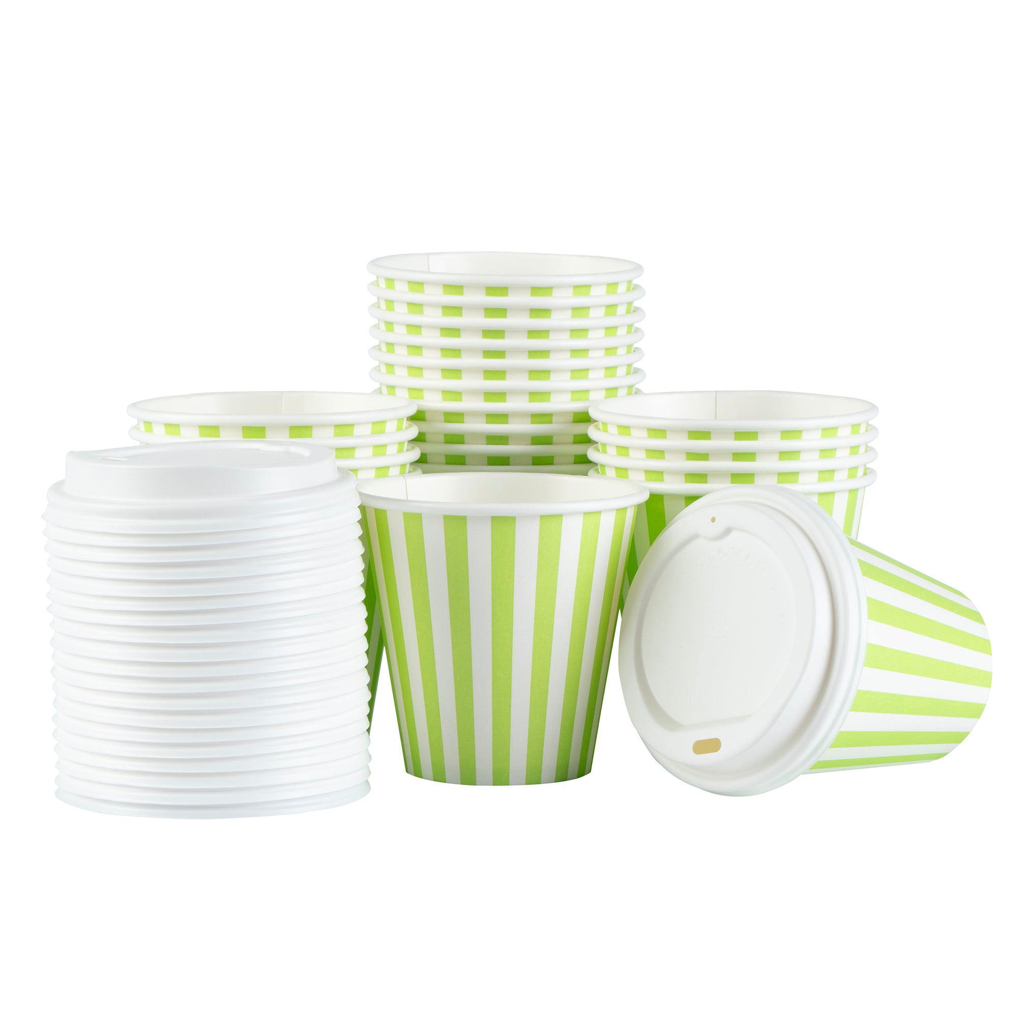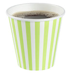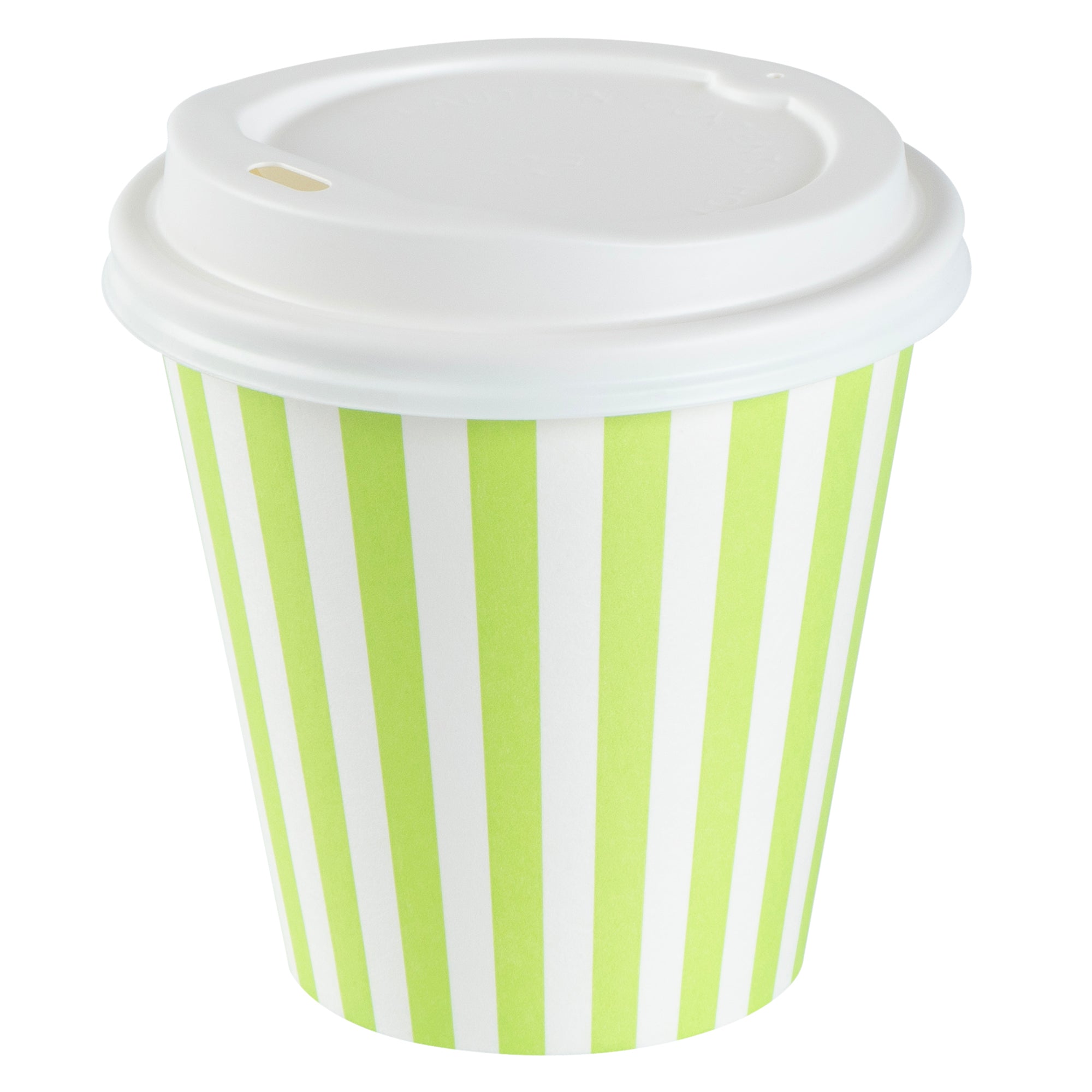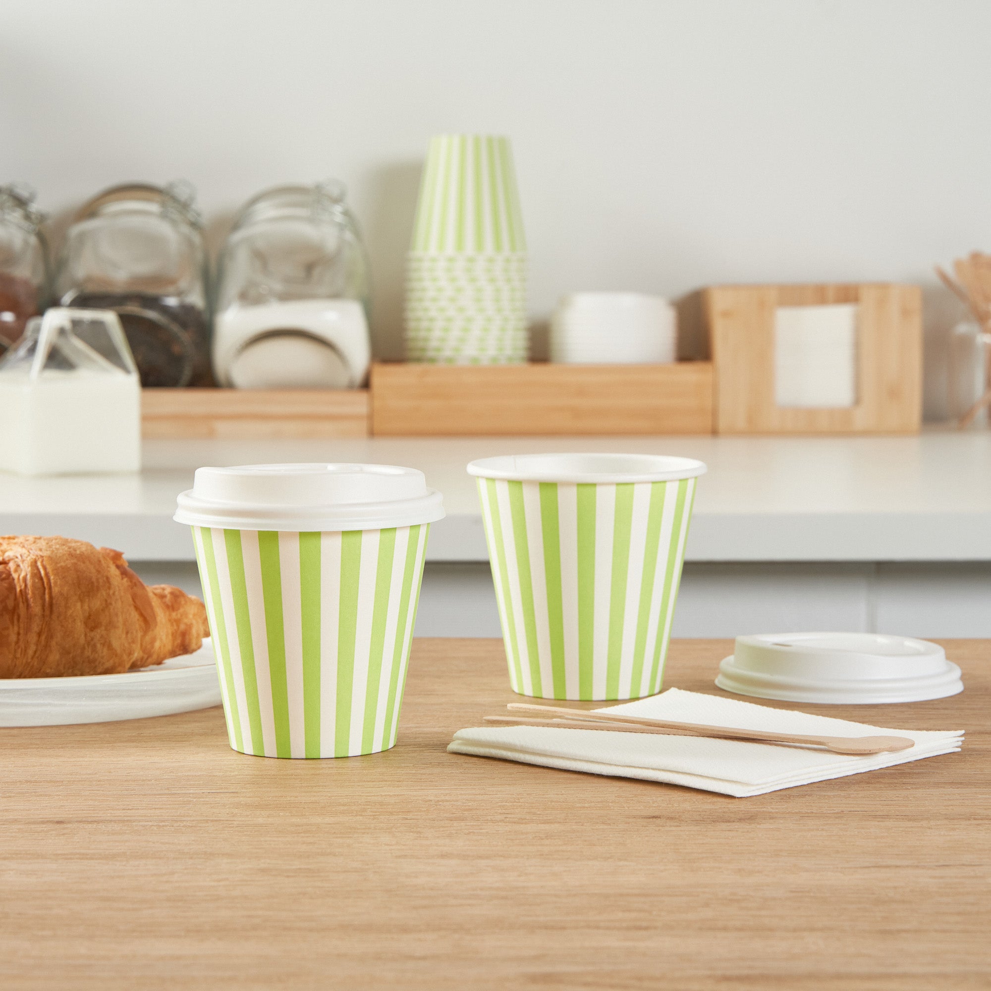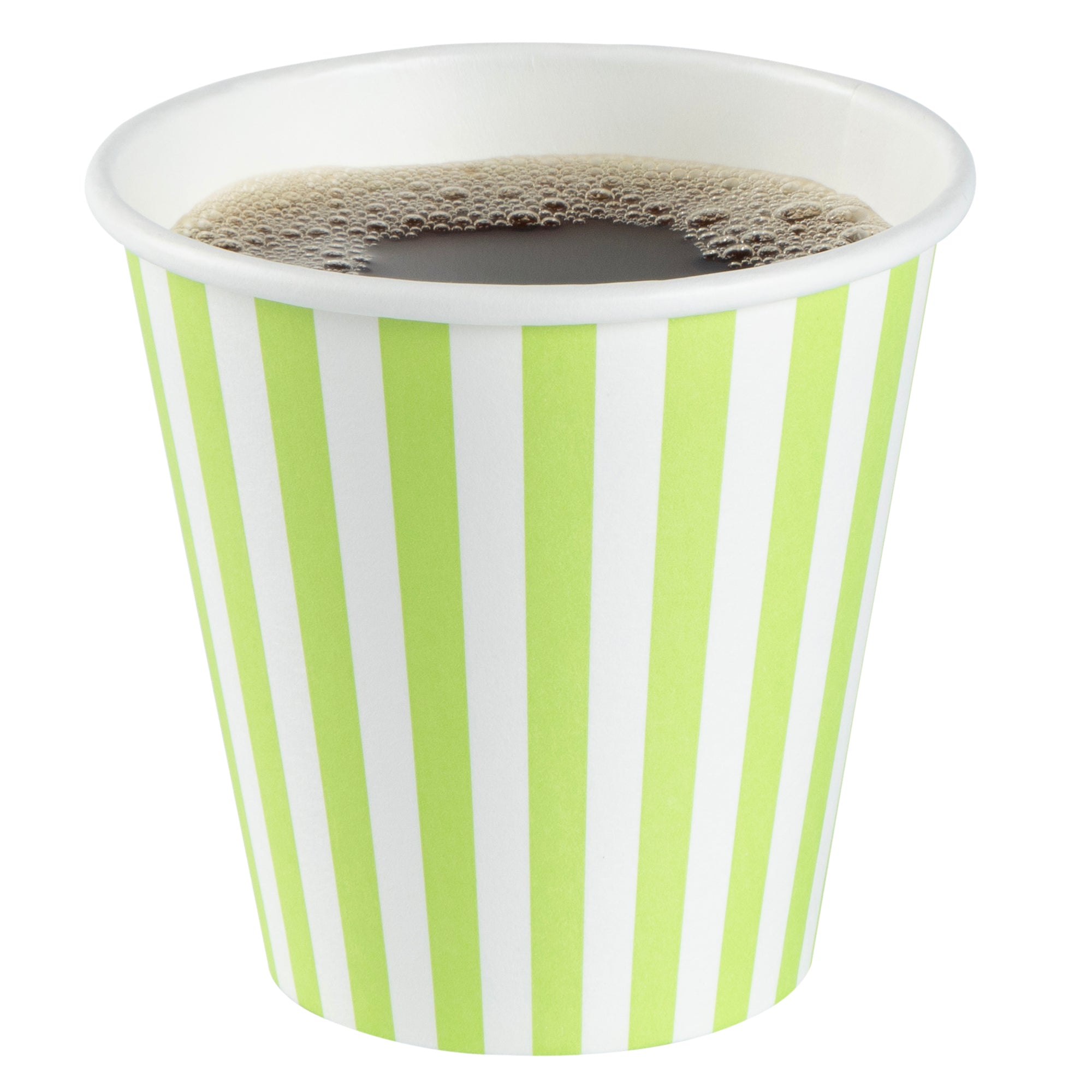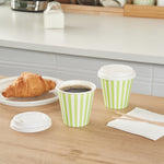 Start your day right with our Restpresso 8-ounce Green and White Stripe Paper Single Wall Coffee Cups. These disposable hot cups are designed with a greaseproof PE liner, ensuring your beverages stay within the cup, not on your clothes or desk. Crafted for versatility, these coffee cups are hot and cold friendly, making them ideal for serving a variety of beverages, from steaming hot coffees to icy cold smoothies. Showcasing a green and white striped finish, these single-use coffee cups add a touch of sophistication to your drink service. The stackable design of these cups optimizes your storage space, making them a practical choice for cafes, offices, and events. Ensuring a secure fit, these single wall cups come with a white lid and feature a rolled rim, providing a leak-resistant seam for comfortable sipping. Pair these sleek coffee cups with our diverse sleeve collection for a worry-free hot drink indulgence. With an 8-ounce capacity, these stackable paper cups are perfect for serving small to medium-sized beverages, and their dimensions, 3.5 inches in diameter by 4.25 inches in height, make them comfortable to hold and easy to carry. Sold in a 20 count box. Sleeves are available and sold separately.