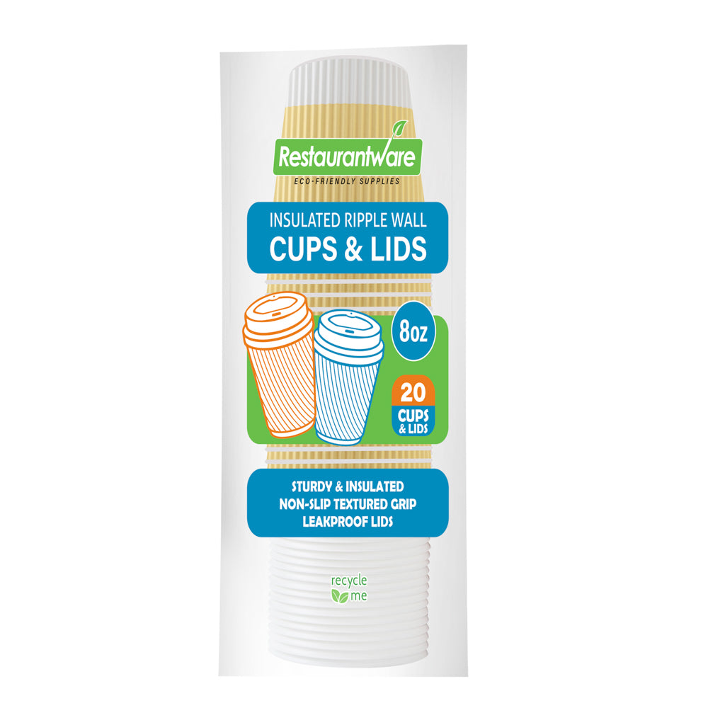 Elevate your beverage service with efficient, spill-proof solutions. The Restpresso 8 oz Light Yellow Paper Ripple Wall Coffee Cups With Lids enhance your coffee offerings with a ripple wall design that ensures a secure grip while keeping beverages hot, making these disposable coffee cups with lids ideal for busy cafes and catering events. Their light yellow color adds a cheerful touch, perfect for brightening up any serving station. These ripple wall coffee cups are constructed from insulated paper, offering built-in insulation that maintains the beverage's temperature while keeping hands cool, essential for serving piping hot drinks. With an 8-ounce capacity, these cups are suitable for serving standard coffee or tea, and their disposable nature facilitates quick cleanup, streamlining operations in bustling foodservice environments. The recyclable construction of these insulated paper coffee cups provides an eco-friendly disposal option, aligning with sustainability goals. Sold in a 20 count box.