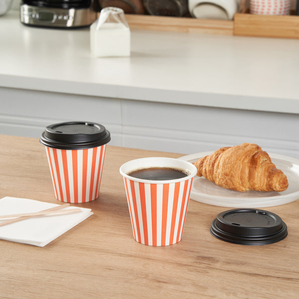 Serve your customers' favorite hot or cold beverages in our Restpresso 8-ounce Orange and White Stripe Paper Single Wall Coffee Cups. These paper coffee cups are designed with a greaseproof PE liner, ensuring your customers can enjoy their drinks without worrying about leaks or spills. Featuring a single-wall design, these disposable hot cups holds all kinds of beverages. With their stylish orange and white striped finish, these single-wall coffee cups add a touch of elegance to your beverage offerings. These disposable coffee cups have black lids that fit securely, averting spills during transport. These stackable cups also save valuable storage space in your establishment. The rolled rim of these recyclable hot tea cups provides a comfortable drinking experience for your customers, while their leak-resistant seam ensures the integrity of your drinks. Pair these coffee cups with our versatile sleeve collection, adding sustainability and comfort to your coffee break. With a generous capacity of 8 ounces, these recyclable hot tea cups are perfect for serving a variety of beverages. Measuring 3.5 inches in diameter by 3.5 inches in height, these stackable coffee cups are the ideal size for takeaway drinks. Sold in a 20 count box. Sleeves are available and sold separately.
