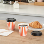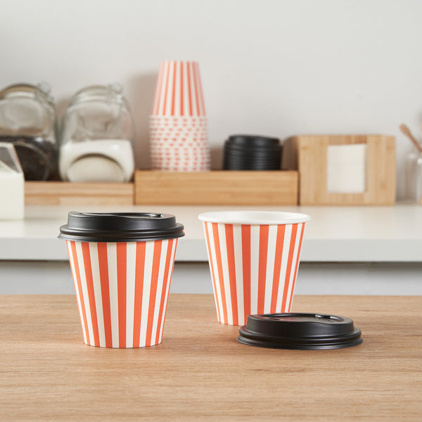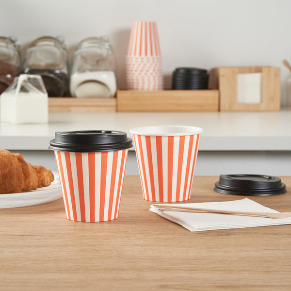 Serve your customers' favorite hot or cold beverages in our Restpresso 8-ounce Orange and White Stripe Paper Single Wall Coffee Cups. These paper coffee cups are designed with a greaseproof PE liner, ensuring your customers can enjoy their drinks without worrying about leaks or spills. Featuring a single-wall design, these disposable hot cups holds all kinds of beverages. With their stylish orange and white striped finish, these single-wall coffee cups add a touch of elegance to your beverage offerings. These disposable coffee cups have black lids that fit securely, averting spills during transport. These stackable cups also save valuable storage space in your establishment. The rolled rim of these recyclable hot tea cups provides a comfortable drinking experience for your customers, while their leak-resistant seam ensures the integrity of your drinks. Pair these coffee cups with our versatile sleeve collection, adding sustainability and comfort to your coffee break. With a generous capacity of 8 ounces, these recyclable hot tea cups are perfect for serving a variety of beverages. Measuring 3.5 inches in diameter by 3.5 inches in height, these stackable coffee cups are the ideal size for takeaway drinks. Sold in a 400 count box. Sleeves are available and sold separately.