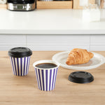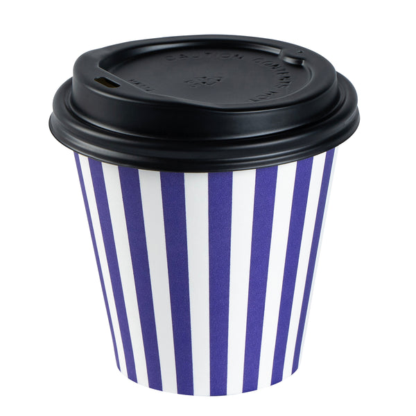 Our Restpresso 8-ounce Purple and White Stripe Paper Single Wall Coffee Cups are the perfect fusion of style and functionality for your beverage service needs. Featuring a leakproof black lid, these paper coffee cups ensure no unpleasant leaks, enhancing the customer experience. With a greaseproof PE lining, these disposable hot cups withstand both hot and cold beverages, making them a versatile choice for cafes, coffee shops, and more. The distinctive purple and white stripe finish of these single wall coffee cups adds a touch of elegance to your service, setting you apart from the competition. These stackable single-use coffee cups maximize storage space, an essential feature for busy foodservice establishments. The rolled rim of these recyclable hot tea cups offers comfortable sipping, while the leak-resistant seam ensures a mess-free experience. Combine these durable coffee cups with our lineup of sleeves for a robust and safe grip during your coffee moments. These single-use coffee cups have an 8-ounce capacity, perfect for serving small to medium-sized beverages, and measure 3.5 inches in diameter by 3.5 inches in height, easily fitting in most cup holders for on-the-go convenience. Sold in a 400 count box. Sleeves are available and sold separately.