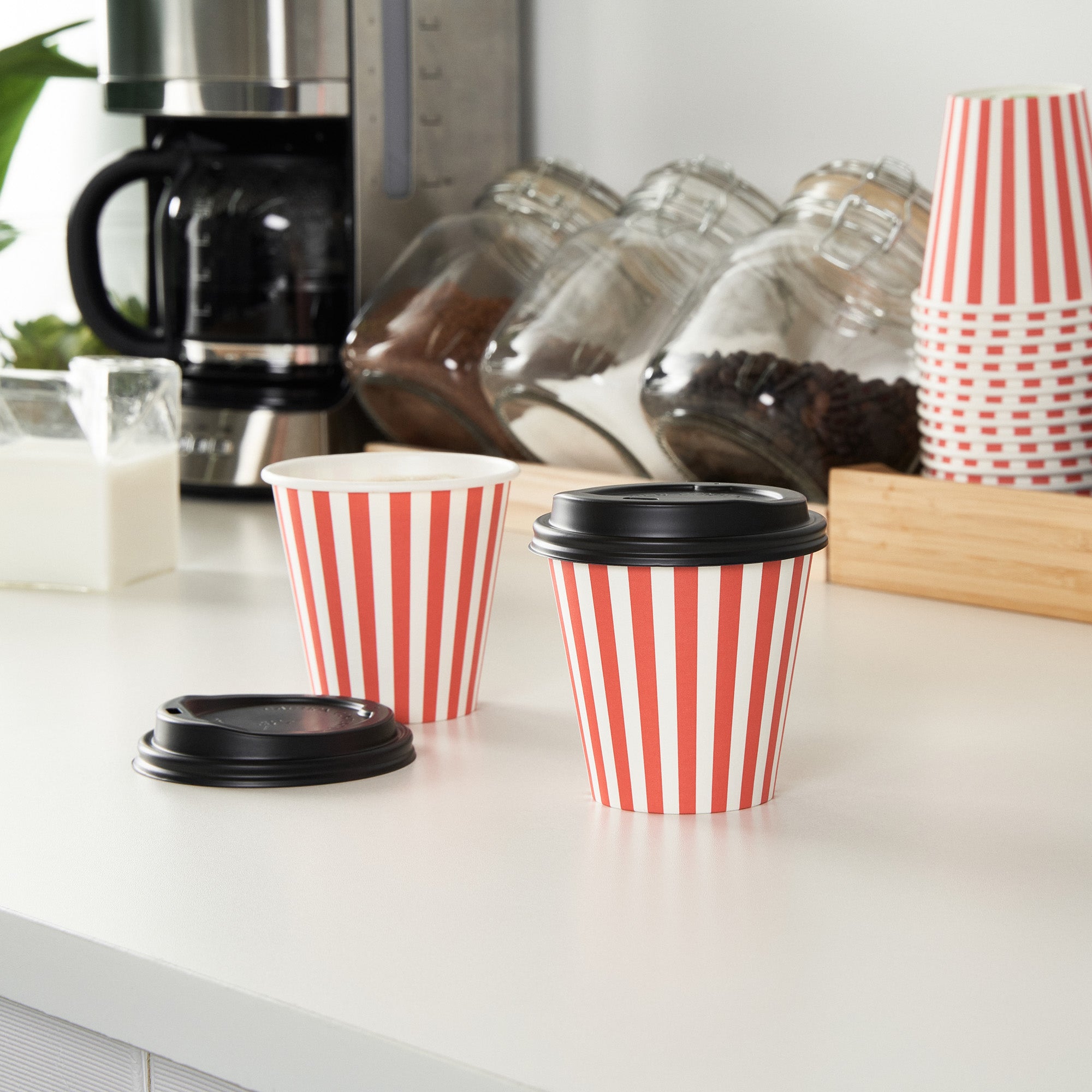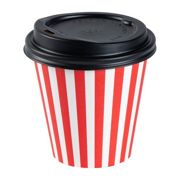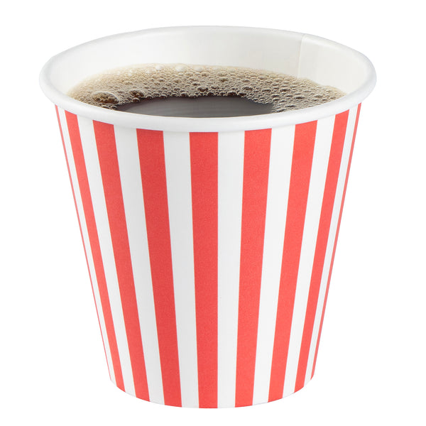 Serve your hot or cold beverages in our Restpresso 8-ounce Red and White Stripe Paper Single Wall Coffee Cups. These paper coffee cups, with their unique red and white stripe design, add a splash of color and style to your beverage service. Sporting a greaseproof PE liner, these disposable hot cups ensure your customers enjoy their drinks without any leakage. The single wall construction of these coffee cups provides sufficient insulation for both hot and cold beverages, making them an adaptable choice for all seasons. Coming with a black lid, these single-use coffee cups offer a secure seal, minimizing any accidental spills during transit. With their stackability, these recyclable hot tea cups save valuable storage space and ensure easy handling. The rolled rim provides a secure drinking experience, while the leak-resistant seam ensures the integrity of the cup. Holding up to 8 ounces of beverage, these hot coffee cups serve small to medium-sized drinks. Match these coffee cups with our array of sleeves, infusing joy, and heat security into your coffee experience. With dimensions of 3.5 inches in diameter by 3.5 inches in height, these single use coffee cups are compact and portable, making them ideal for customers on the go. Sold in a 400 count box. Sleeves are available and sold separately.