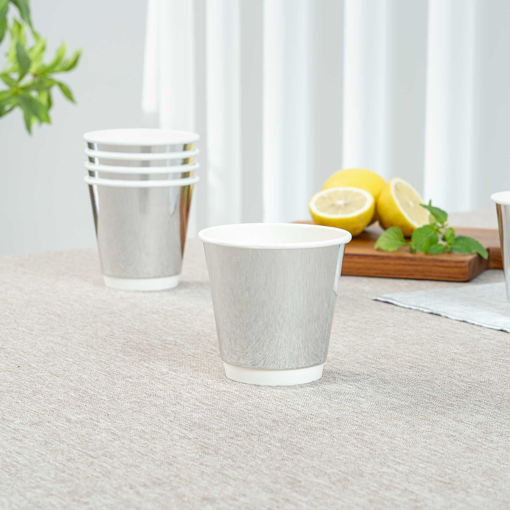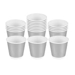 Upgrade your beverage service with our Restpresso 9-ounce Metallic Silver Paper Hot / Cold Cups. These stylish disposable party cups feature a sleek metallic silver finish that adds a touch of sophistication to any occasion. Designed to handle both hot and cold beverages, they offer excellent versatility for serving coffee, tea, cocktails, and more. Crafted from durable paper, these cups maintain their shape and integrity during use, ensuring a reliable drinking experience. Their freezer-safe construction also makes them perfect for preparing and storing chilled drinks or desserts in advance. Whether you're hosting a birthday party, wedding, corporate event, or casual gathering, these disposable cups are a convenient and elegant solution. These cups measure 2.28 inches in diameter by 3.39 inches in height with a 9-ounce capacity. Sold in a 25 count box.