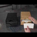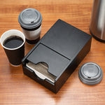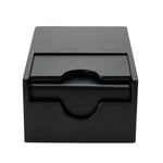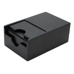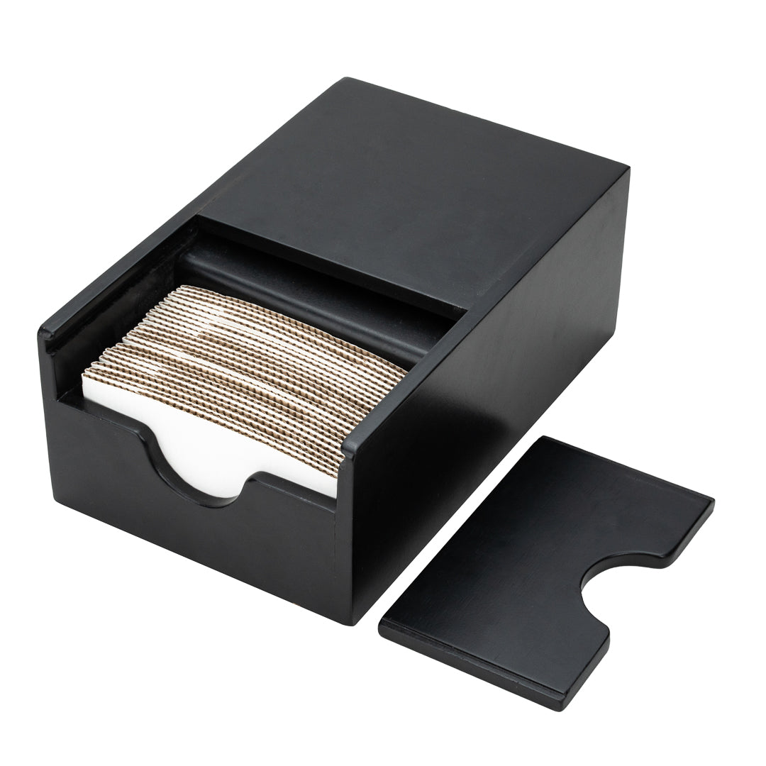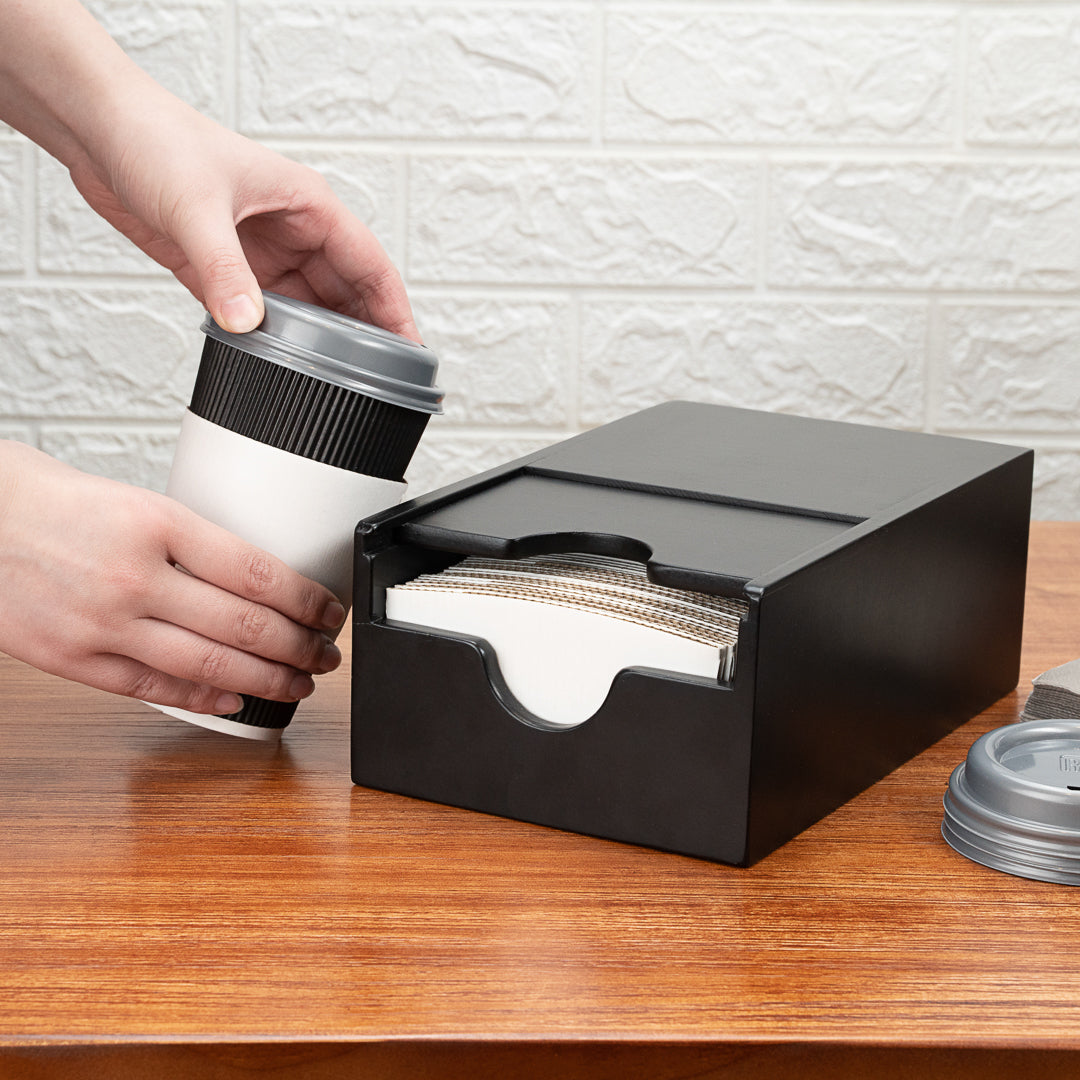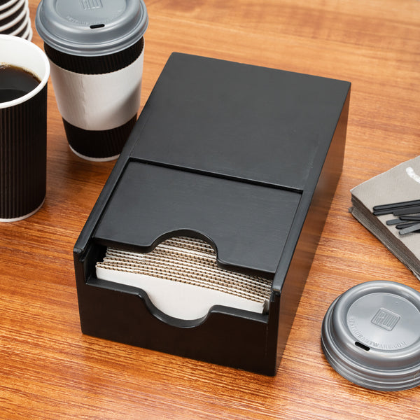 Add style and organization to your coffee supplies using our Restpresso Black Bamboo Coffee Cup Sleeve Holder. A perfect addition for cafes, restaurants, or hotels, this cup sleeve holder can fit up to 50 sleeves to provide a constant supply of coffee sleeves for customers. With a spring-loaded design and a wide opening at the front, this coffee cup sleeve holder provides an efficient way to quickly grab coffee sleeves and easily refill the dispenser. This bamboo coffee sleeve holder is chip-resistant and break-resistant to maintain its high-quality appearance for everyday use. The sleek black finish of this cup sleeve holder adds a stylish touch to self-serve coffee stations. Built with a sturdy base, this coffee cup sleeve holder provides superior stability on surfaces to provide guests an easy way to grab sleeves without making a mess. This coffee sleeve holder measures 9.5 inches in length by 6 inches in width and 3.75 inches in height. Shipped in a 1 count box.