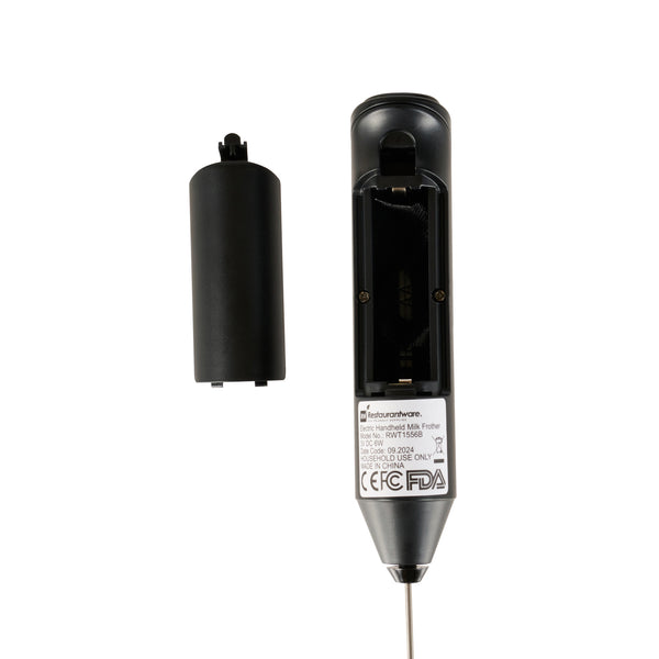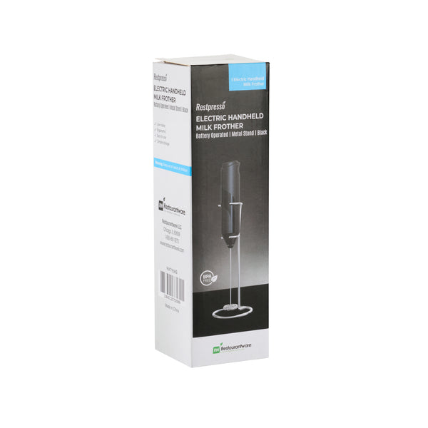 Ensure flawless frothing in busy kitchens with this reliable electric milk frother. The Black Stainless Steel Electric Milk Frother features a battery-operated design, ensuring uninterrupted frothing during peak hours, making it an indispensable tool in high-demand culinary settings. This handheld frother includes a metal stand that facilitates neat storage on your countertop, allowing for effortless access when you need it the most. With a stainless steel whisk that allows quick cleaning, this frother promotes hygiene and speed, crucial for bustling kitchens. The ergonomic handle of this battery powered frother for coffee offers comfort and control, enhancing your barista skills with ease. Measuring 8.5 inches in height, its sleek black finish adds a professional touch to your countertop setup. Elevate your beverage service and enhance efficiency by integrating this versatile milk frother into your daily routine. Each order includes 1 Black Stainless Steel Electric Milk Frother.
