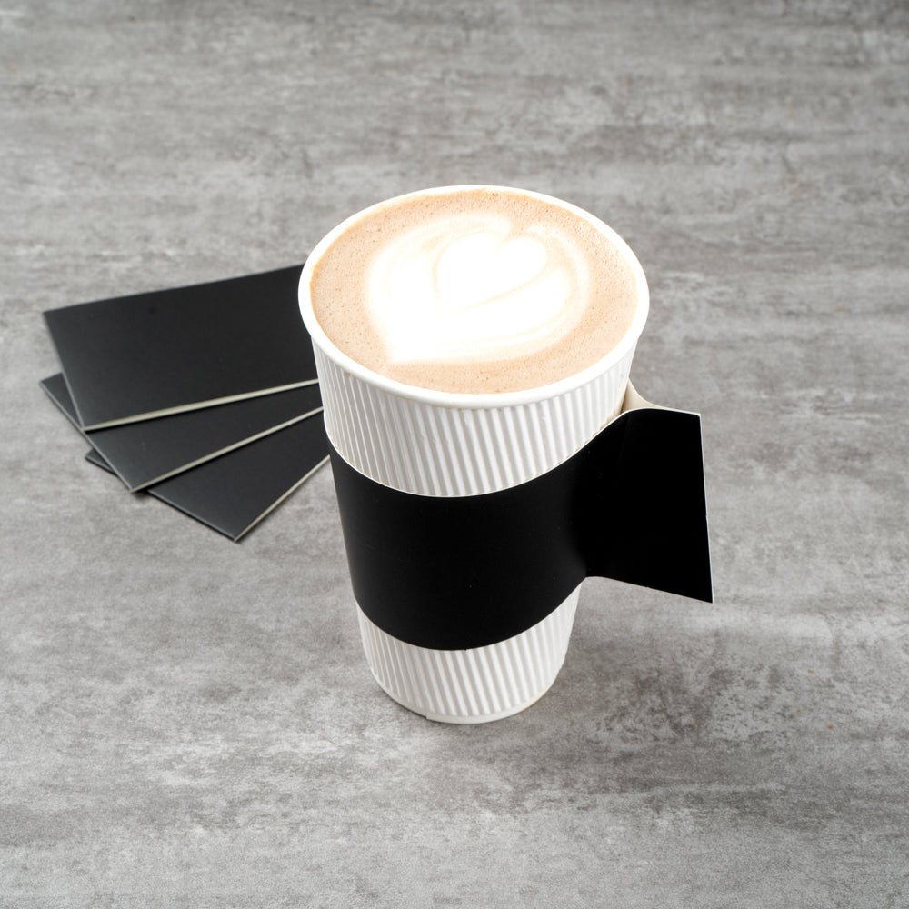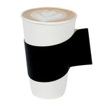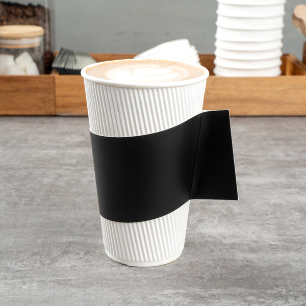 Enhance beverage service efficiency with adaptable coffee cup sleeves. The Restpresso No-Slip Insulated Coffee Cup Sleeve – Black Paper, Versatile Fit, 11.25 inches by 2.5 inches by 2.5 inches is designed with a corrugated no-slip interior, ensuring stability by preventing the sleeve from sliding off cups. Its compact size optimizes storage and transport efficiency, making it a practical choice for busy coffee shops. Crafted from sleek black paper, this coffee cup sleeve features an integrated handle that provides a secure grip, reducing the risk of spills. Perfectly fitting 12 to 20-ounce cups, it supports diverse beverage serving needs and simplifies inventory management as a versatile disposable cup holder. The premium paper construction protects hands from hot beverages, ensuring customer safety while enhancing brand presentation. Each order includes 50 Restpresso No-Slip Insulated Coffee Cup Sleeves.