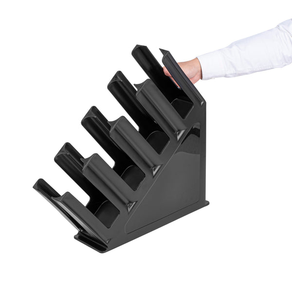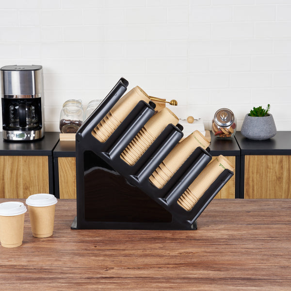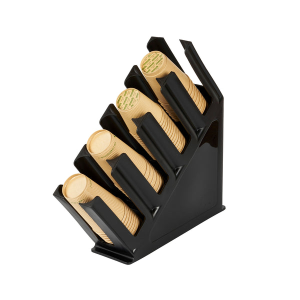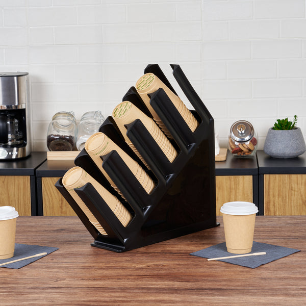 Optimize your coffee station with our Restpresso Black Plastic Coffee Cup / Lid Organizer. This coffee organizer features 4 compartments, perfect for keeping lids, and coffee cups neatly arranged and easily accessible. The open design of this plastic organizer lets staff easily monitor supply levels at a glance, ensuring you do not run out of beverage supplies during peak hours. Crafted from premium plastic, this coffee caddy is designed for long-lasting use, providing reliable storage for your beverage supplies. With a compact design, this black organizer fits seamlessly into any space, maximizing efficiency without taking up too much room. The black finish of this organizer adds a touch of sophistication while complementing any coffee station setup. Measuring 18.62 inches in length by 4.53 inches in width by 17.91 inches in height, this countertop organizer is both stylish and functional. Sold in a 1 count box.